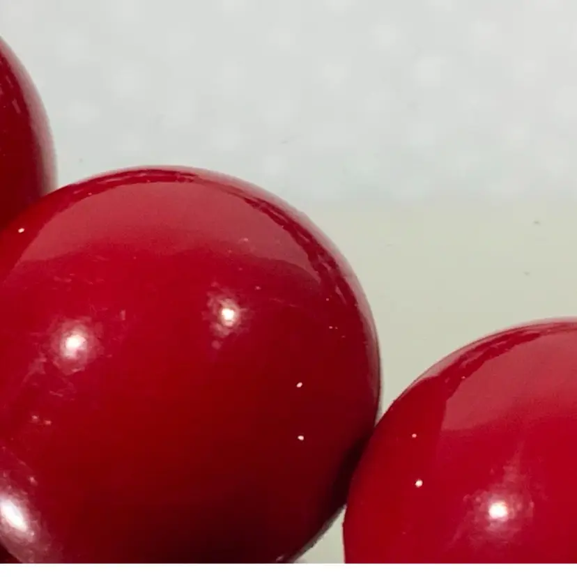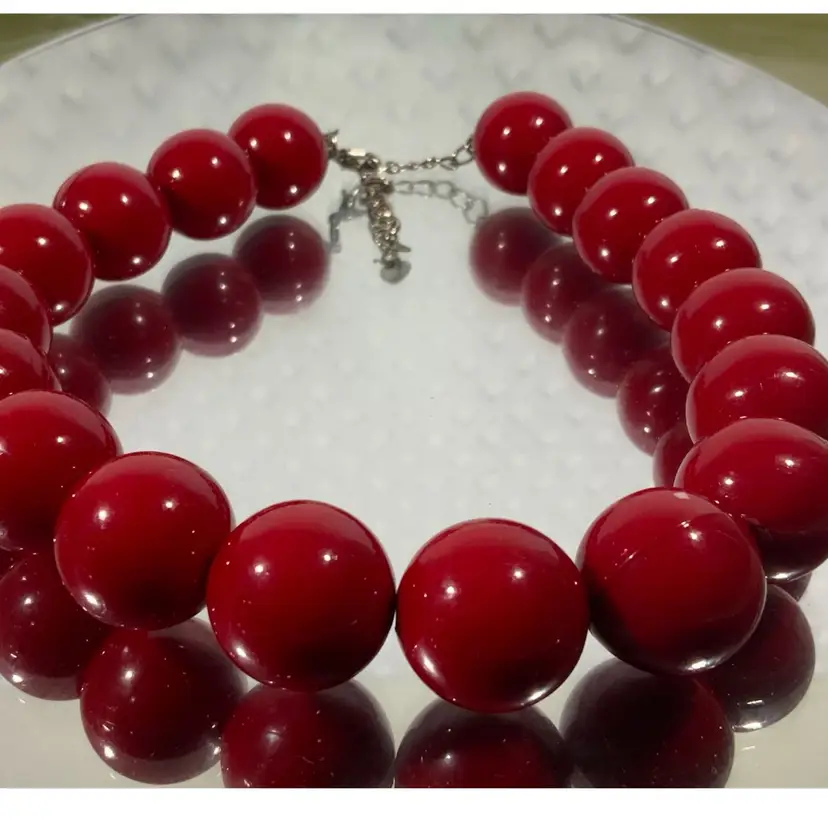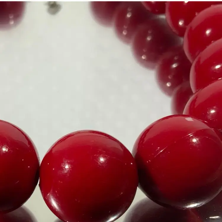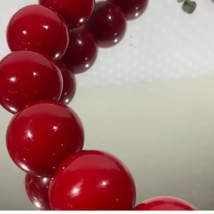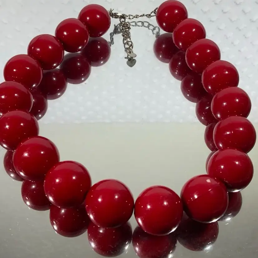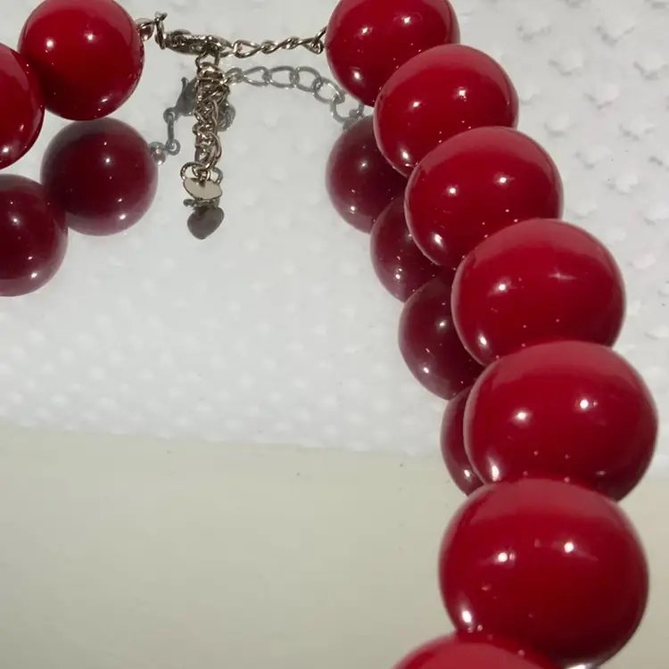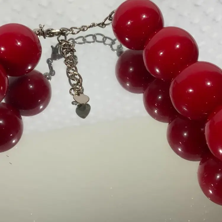 Very shinny and it’s metallic. Has som wear. Approximately 15” long including clasp with a 3” chain extender. Expandable. Please review photo. Some sort of hard plastic