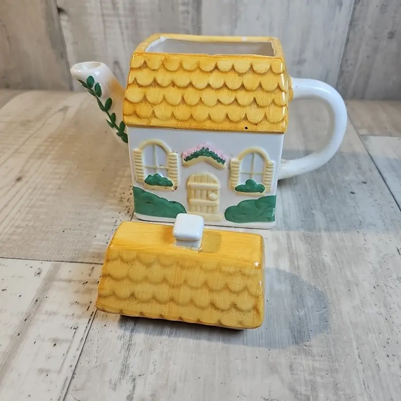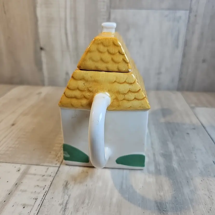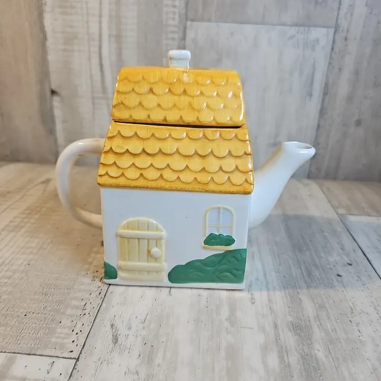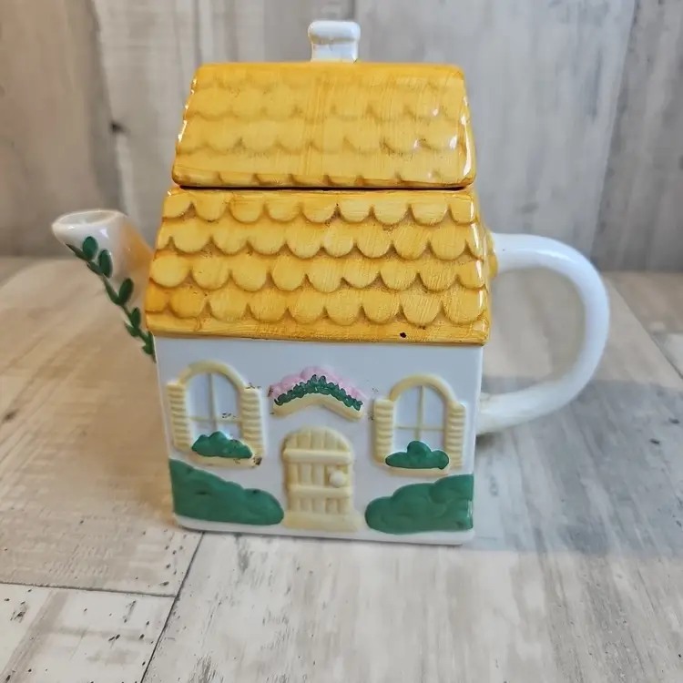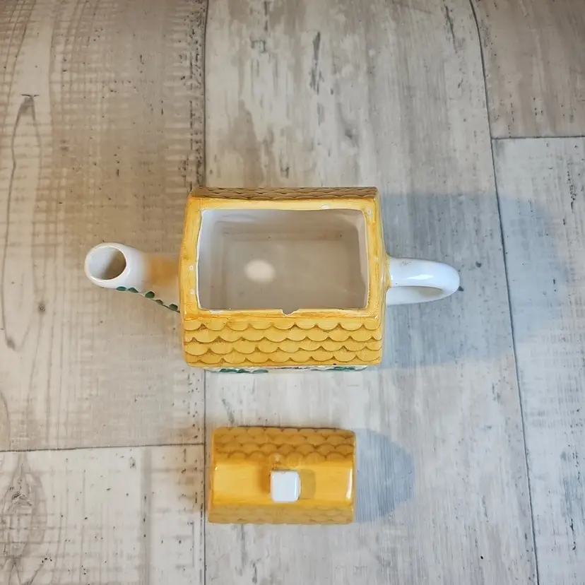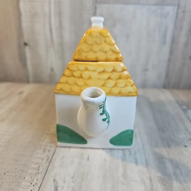 Vintage ceramic teapot shaped like a cottage house, with a sunny yellow roof and hand-painted details Design & Material: Ceramic, colorful cottage architecture style, featuring shrubs, painted windows, textured roof tiles — very quaint and whimsical Capacity / Size: Holds approx 12 oz (as listed), size ideal for display and occasional use; compact enough for shelf or kitchen décor Condition: Used vintage condition — minor wear consistent with age (see photos for detail) Display / Use Suggestions: Pops with charm on a tea shelf, kitchen windowsill, cottagecore décor setups, or as a statement piece with other whimsical teaware Care Instructions: Hand wash only; avoid soaking or harsh scrubbers to preserve the hand-painted finish Why You’ll Love It: It’s like having a mini storybook cottage on your counter — cozy, cheerful, and full of vintage personality.