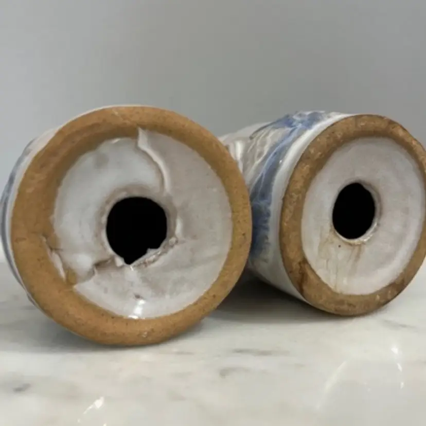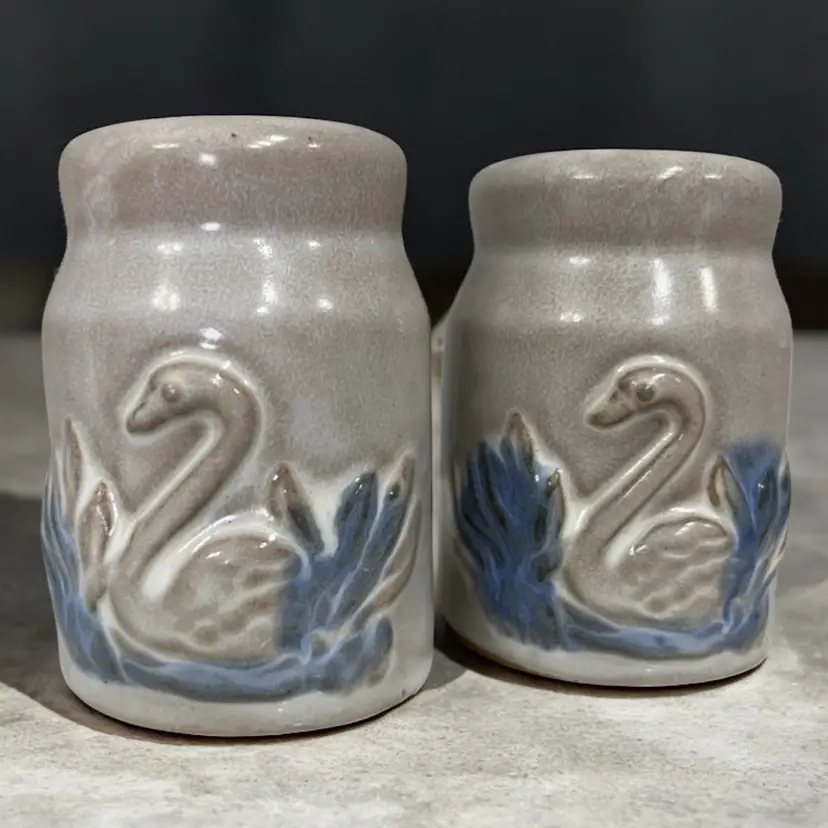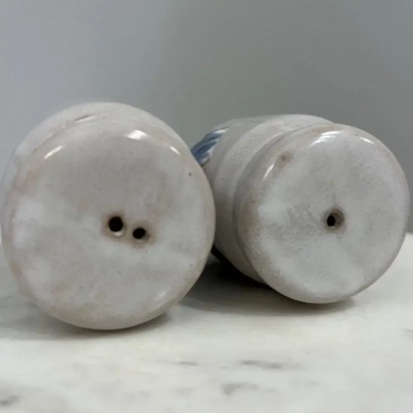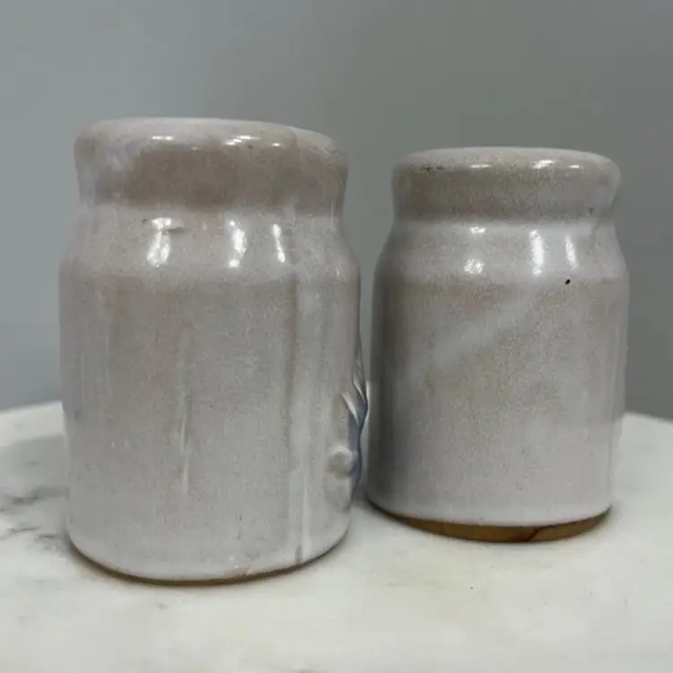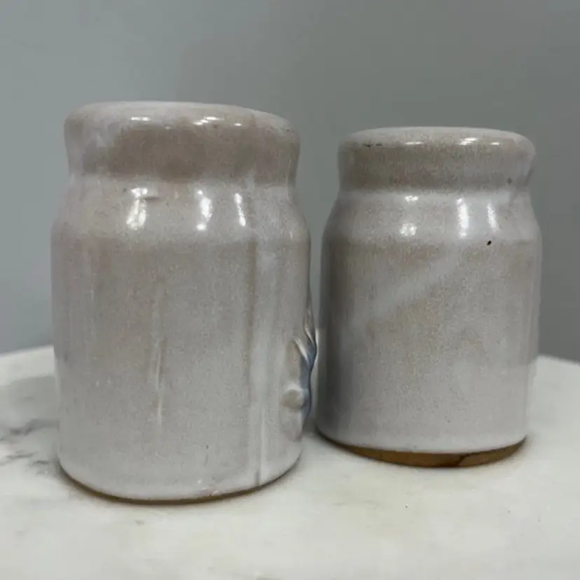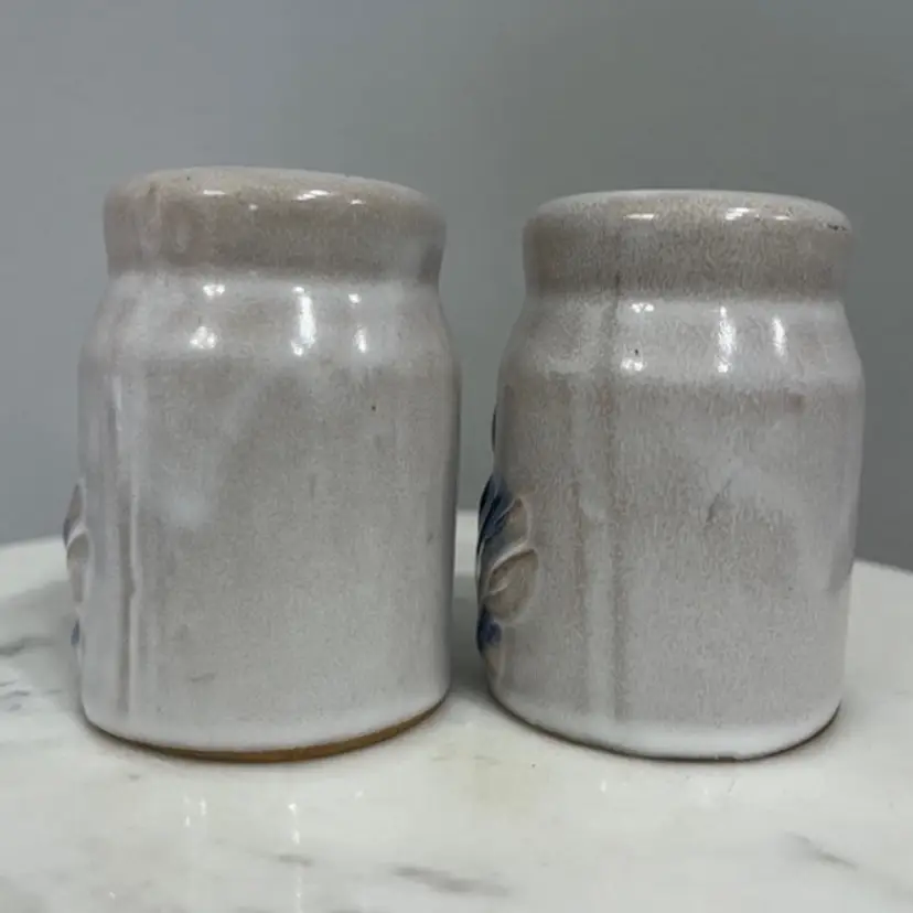 Good condition with no chips or cracks. Missing stoppers. One stopper is stuck inside the one shaker. They each measure 3” tall and 2” wide.