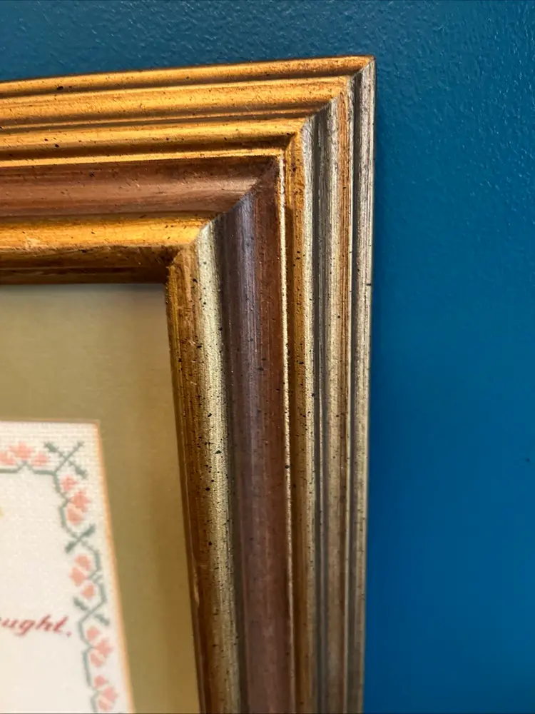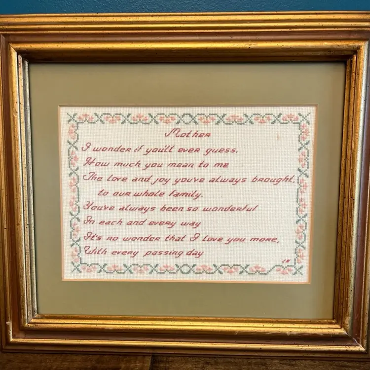 This vintage cross stitch has such a sweet sentimental poem that should be put in your Moms house! It is in very good condition with only one tiny spot. See pic. The frame has a couple of small blemishes but can be easily touched up. I did put new foam board and paper in the back as it was truly needed. So that work has been done for you ๐.
