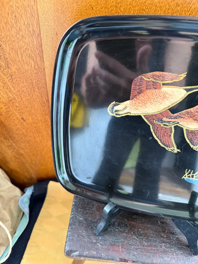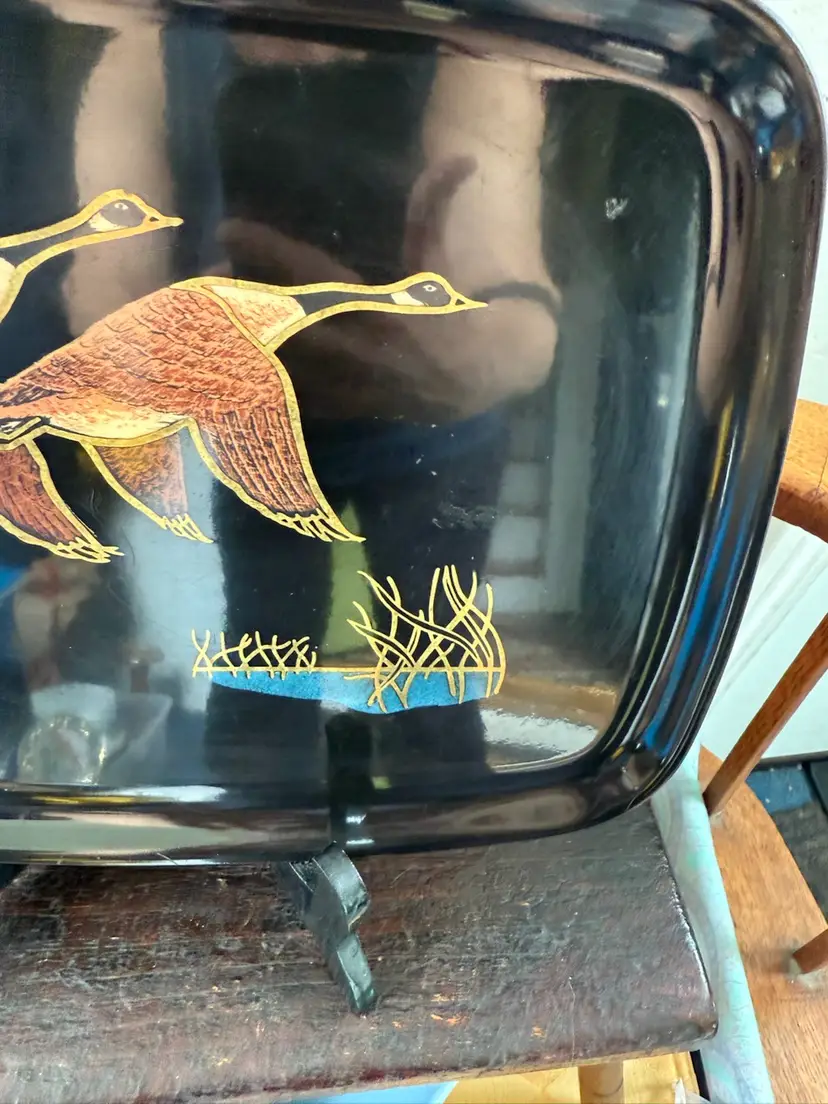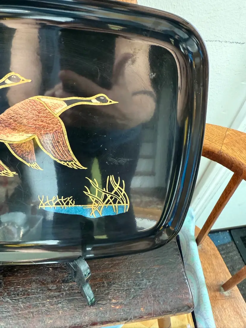 Approximately 9 1/2” x 12 1/2” No chips or cracks No dishwasher damage There are scratches due to age but this tray still is shiny. See all photos 1/7/2026
