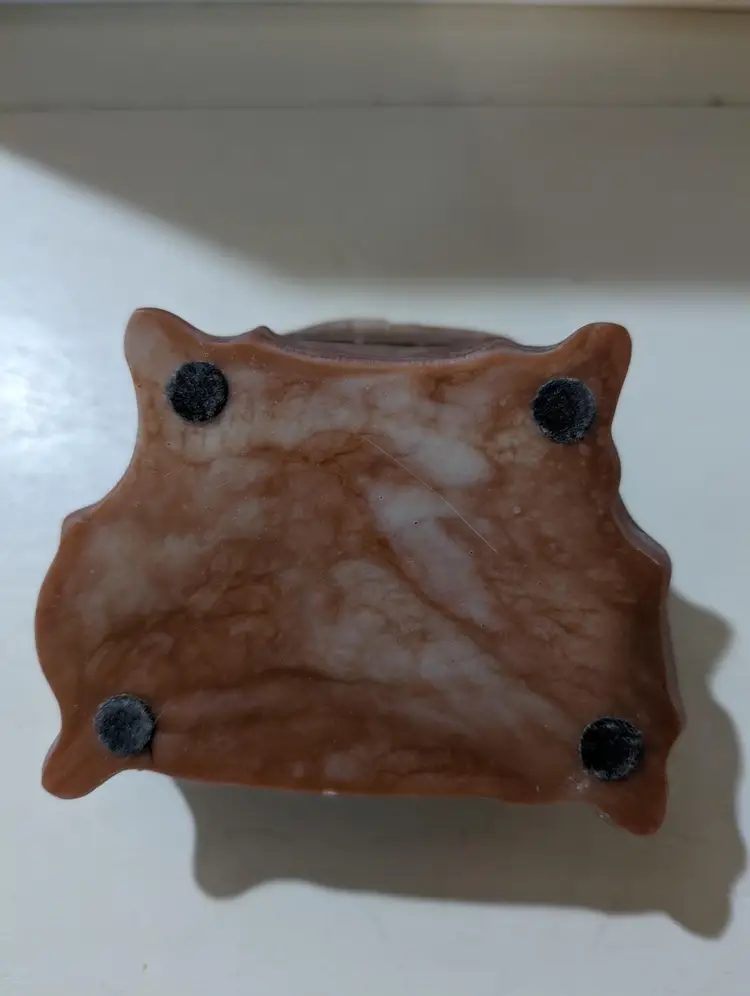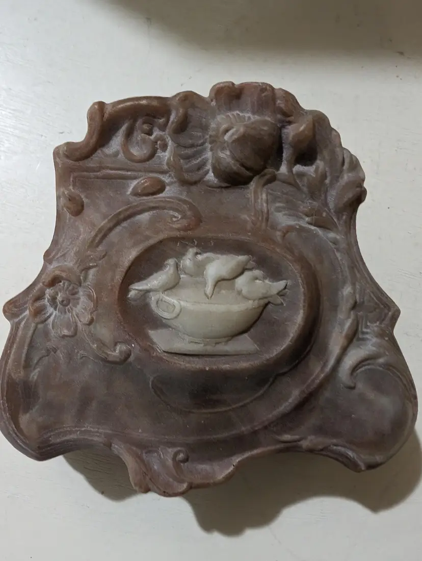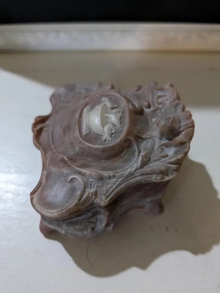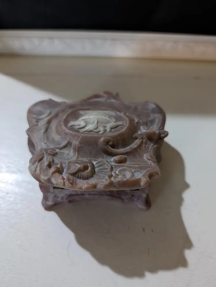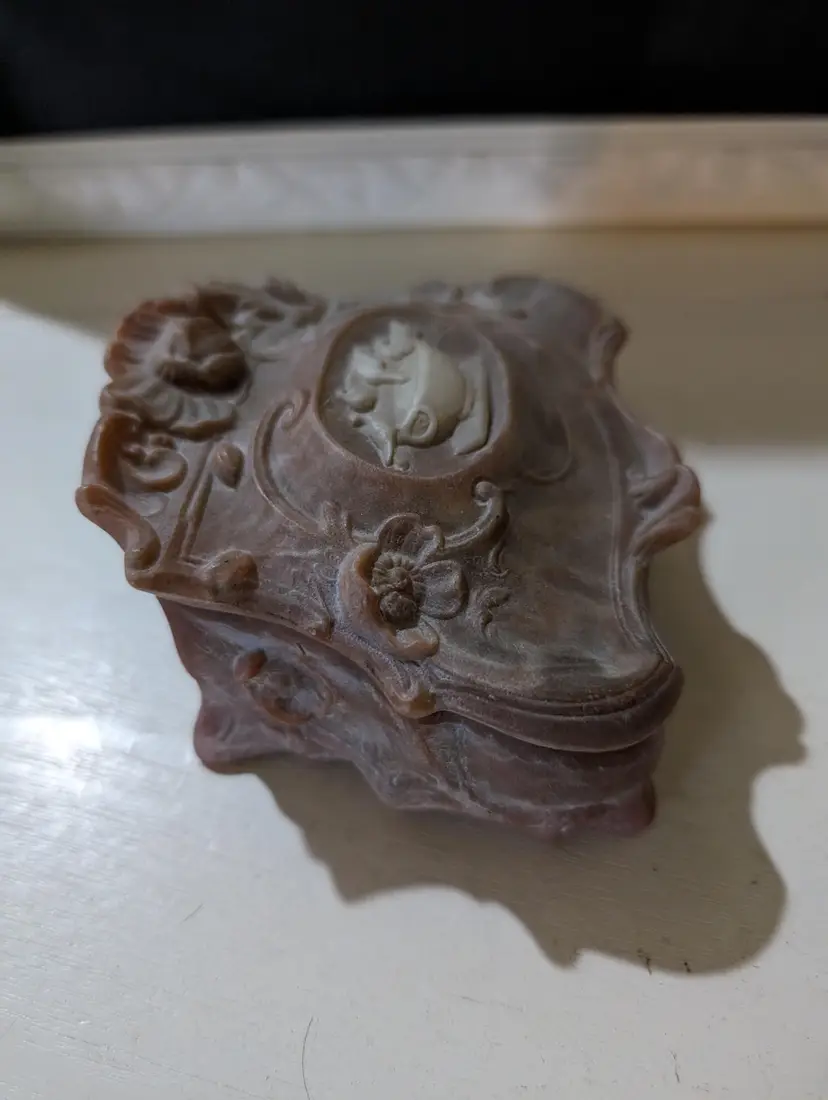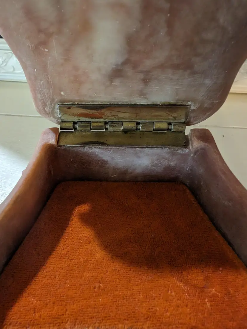 Nice vintage Trinket box that is used but is in Amazing condition with no cracks or chips. Color is a pinkish red color with a marble design and has a cameo style Birds eating from a cup design. Piece is approximately 2.5 inches height with a 4 inches length and width and weights 8 oz. Inside of the box has a orange color felt that is in Amazing condition and metal hinge for the lid and whole piece has a smooth finish. Very nice and unique looking piece that is perfect to put on the nightstand for your jewelry keeping.