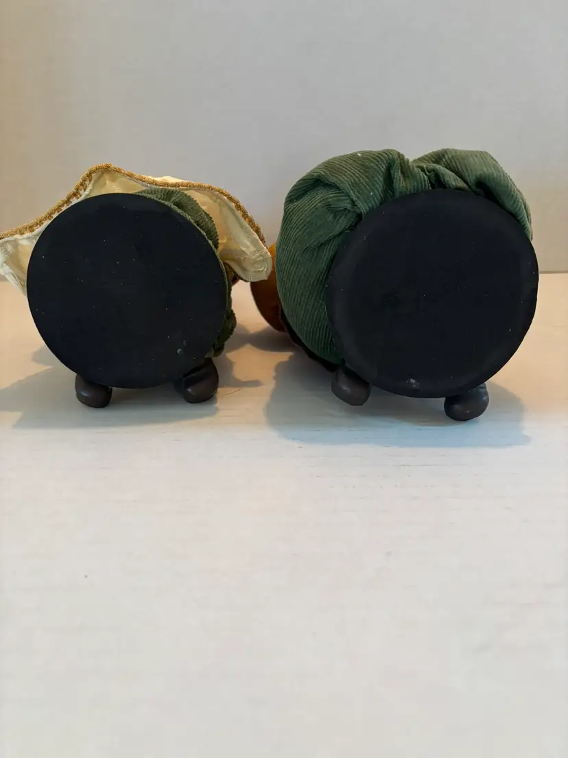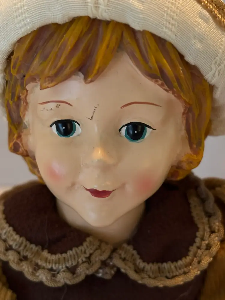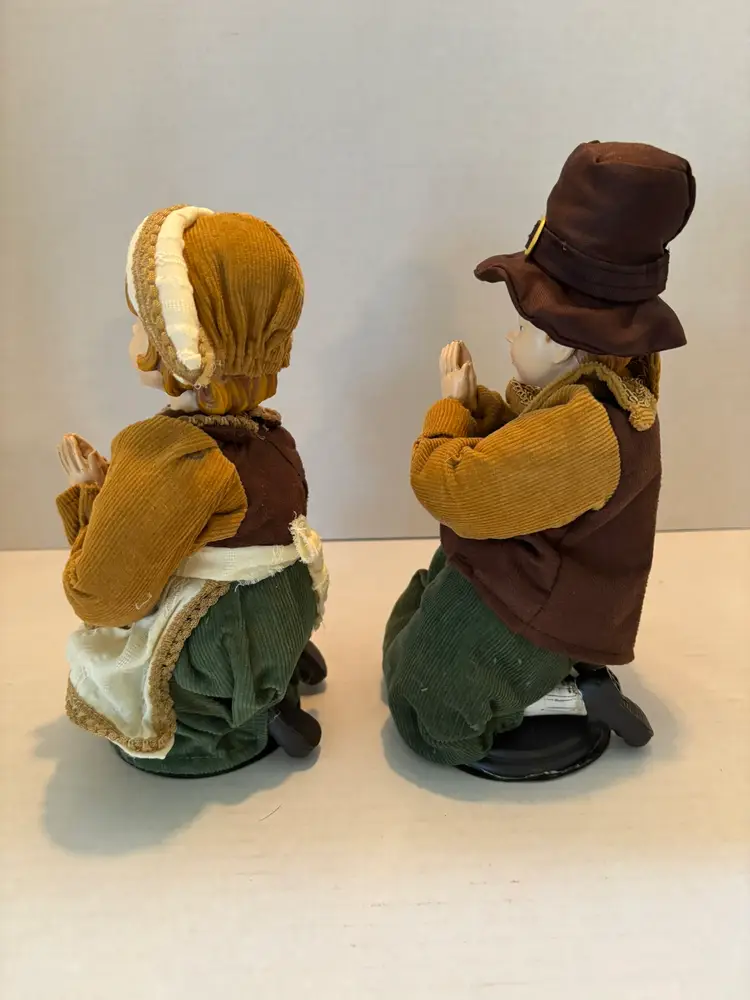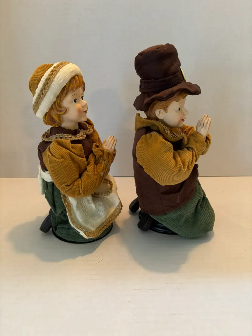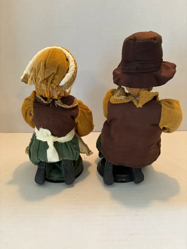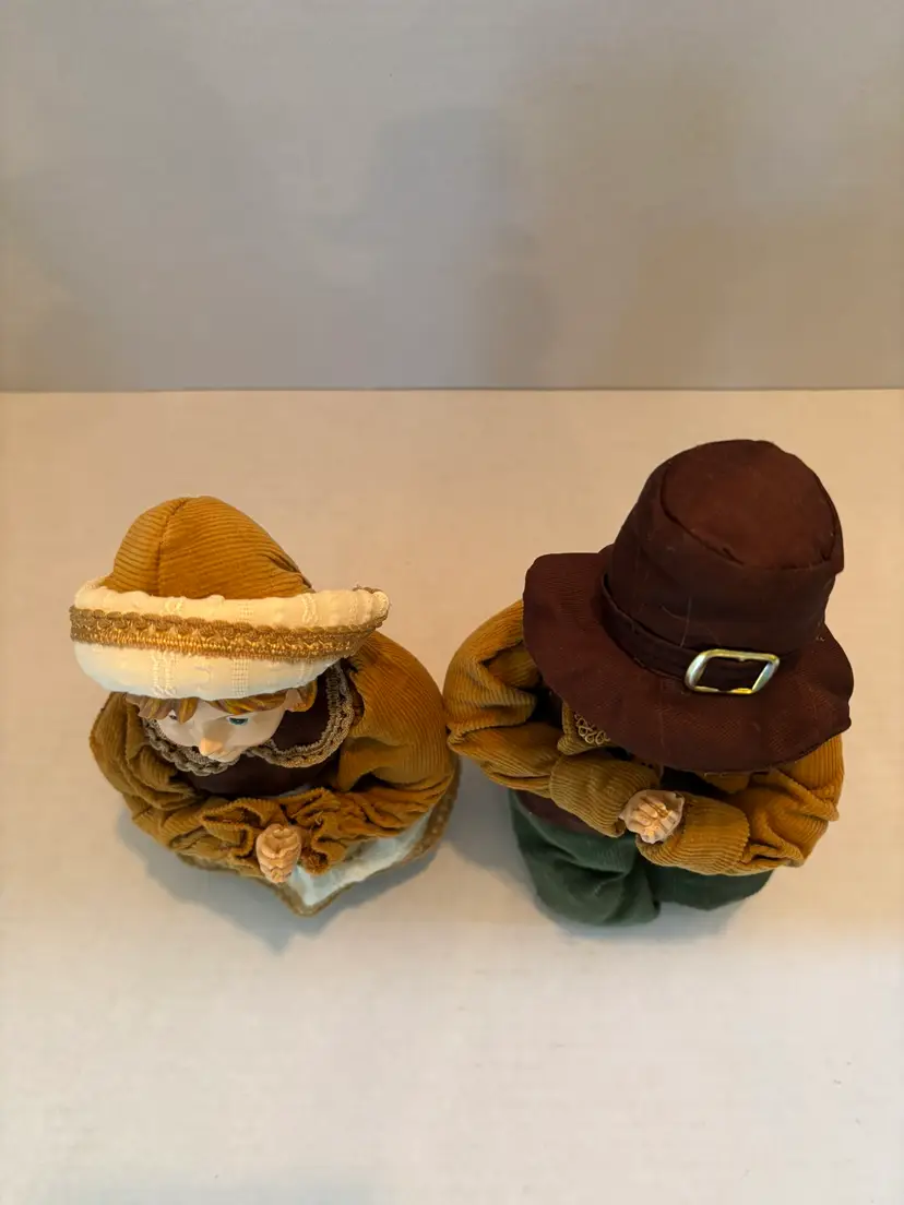 The Vintage Cracker Barrel Traditional Pilgrim Family Figurines feature a cloth body with porcelain head and hands, and a kneeling pose, adding a unique and nostalgic touch to your Thanksgiving decor. This medium-sized figurine set includes two figures in a traditional style, perfect for adding a festive touch to your holiday display. The multicolor design and original reproduction make these collectible figurines a special addition to any Thanksgiving collection. Made by Cracker Barrel, these figurines capture the essence of the holiday season and the spirit of the Pilgrim families. THERE IS A SMALL BLACK MARK ON THE GIRL FIGURINE----SEE PICTURES FOR DETAIL Measure 9in tall X 5 1/2in wide X 4 1/2in deep