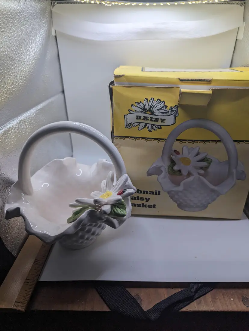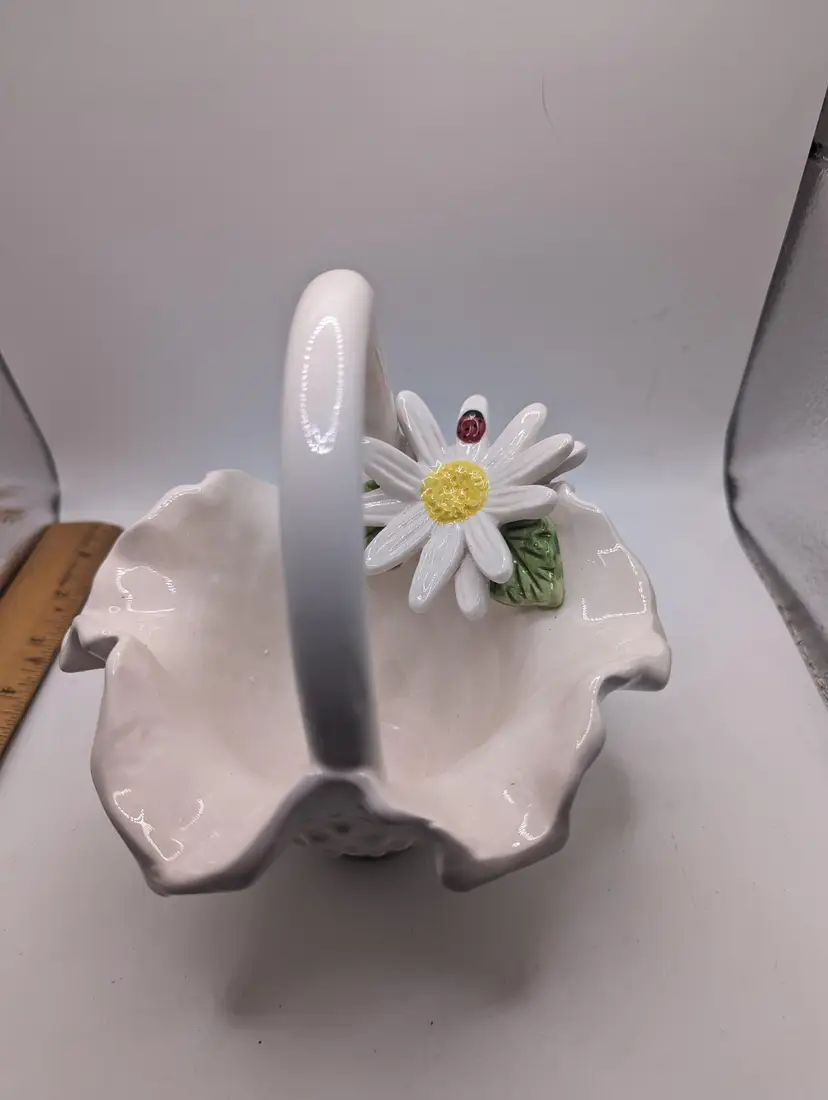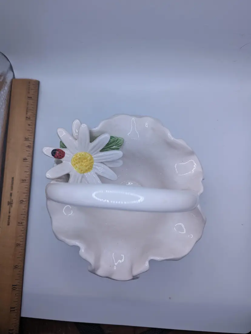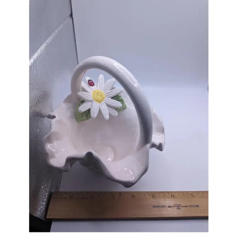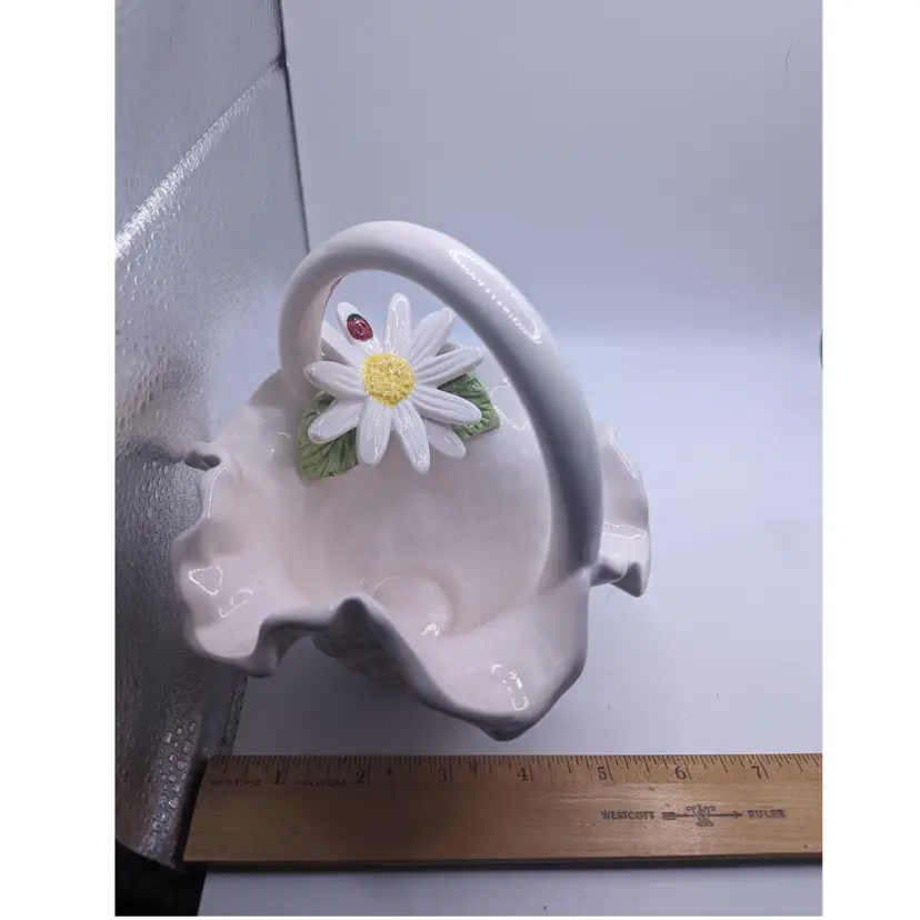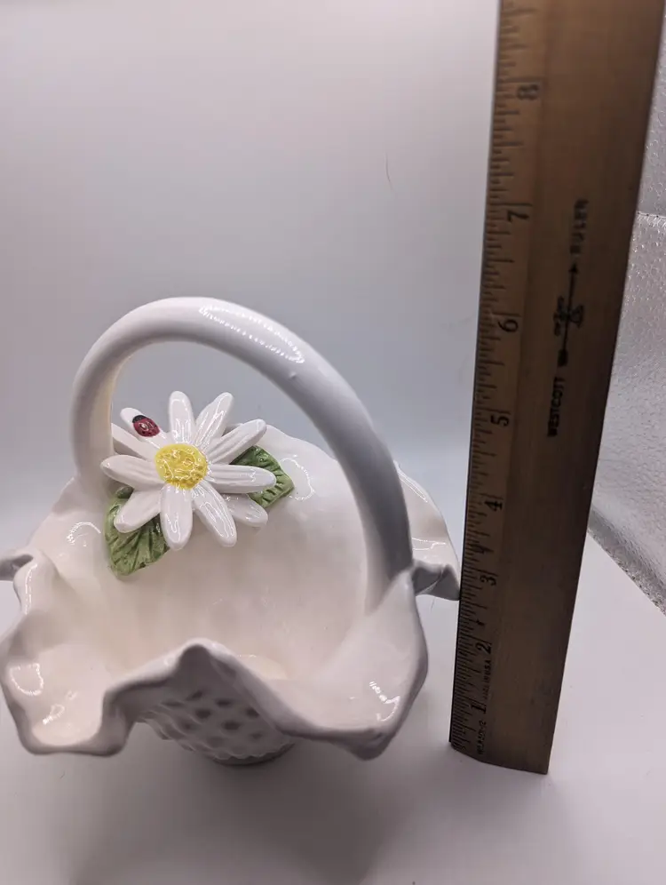 This is a lovely like new Vintage Cracker Barrel White Hobnail Ruffled Ceramic V White Flower and Ladybug Basket. It measures about 6 inches in diameter. Perfect for Spring/Easter. No chips or cracks. Please see all pictures for condition.