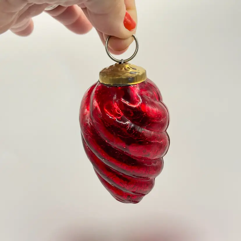 Add a touch of vintage charm to your holiday decor with this stunning crackle red hand blown glass swirl ornament, set of 4, Kugel style. Its vibrant color and unique design make it a standout piece for any Christmas tree. Perfect for collectors or as a festive gift. Excellent condition. Measures 4.75 inches each. Weighs 1lb.
