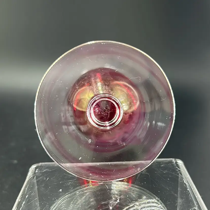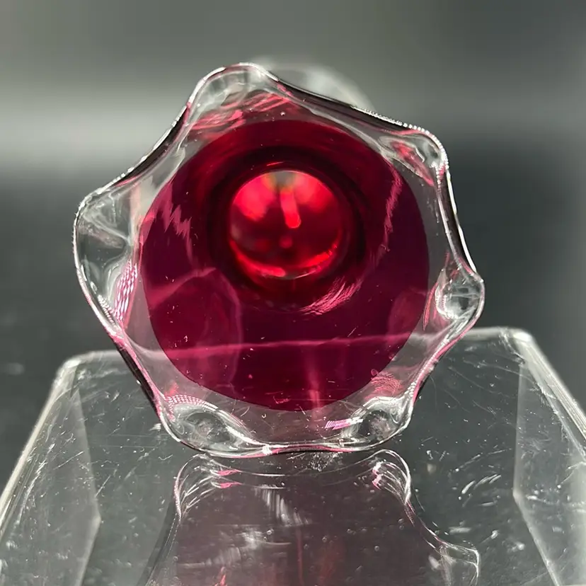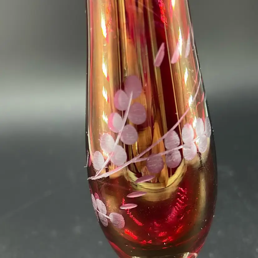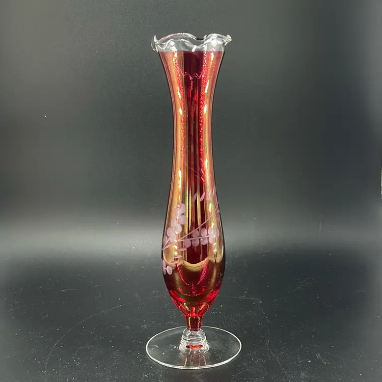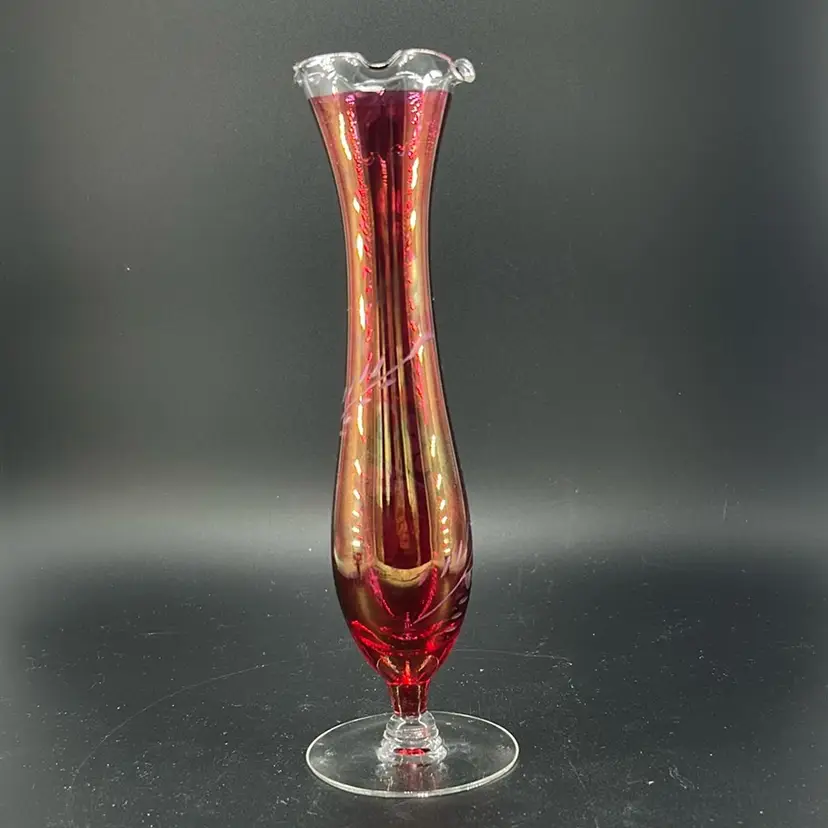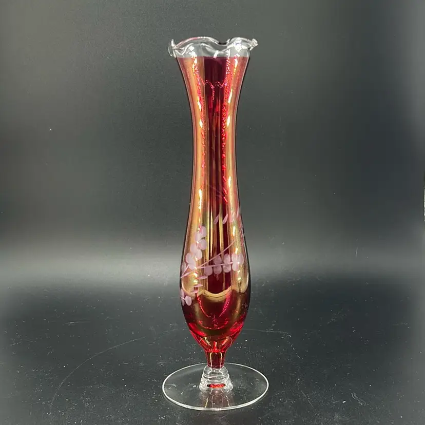 This piece is a vintage cranberry glass bud vase featuring a ruffle day edge and etched floral designs. It stands 8 inches tall and is 2 inches across the opening. This is a flashed face. The coloring is still very very much intact. There are no chips or cracks.