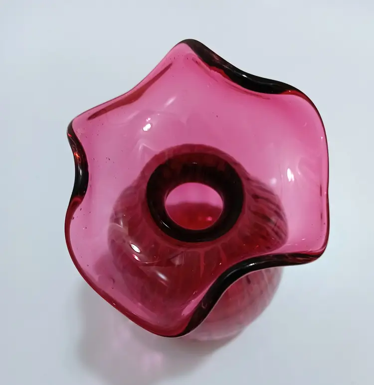 Pretty Paneled Hand Blown Cranberry Glass Ruffled Vasev;Pontil Mark on Bottom; Glass has a Nice Thickness; 7" T x 4" W x 4" Base; Excellent Vintage Condition! No Chips or Cracks or Bruises!