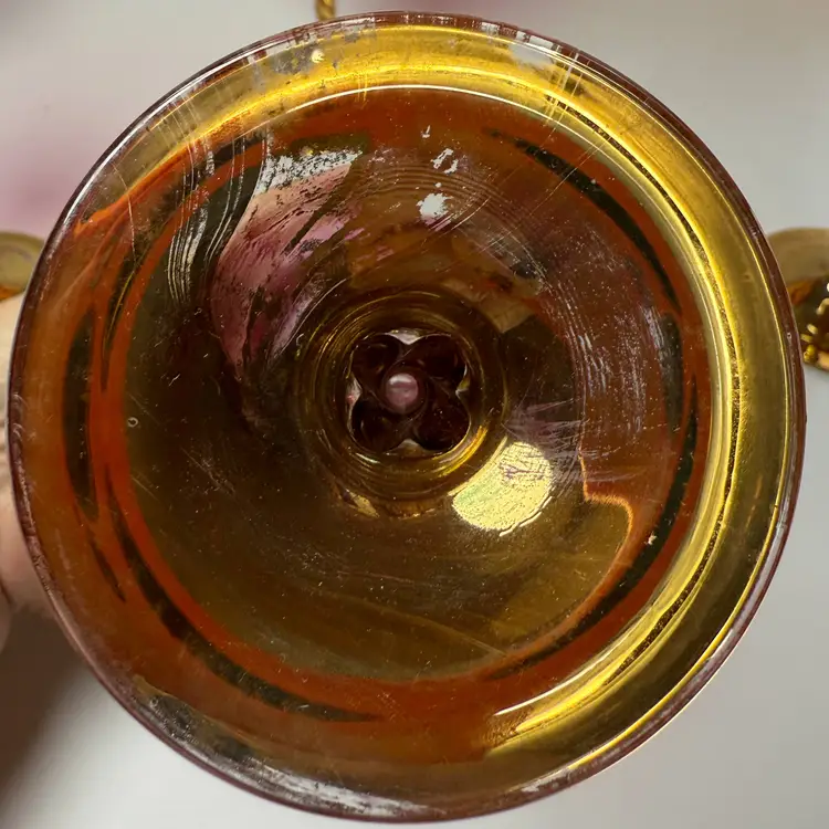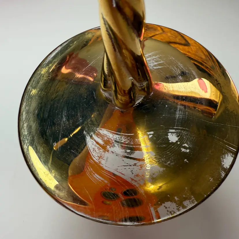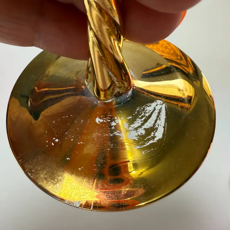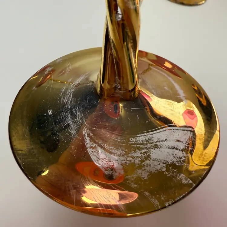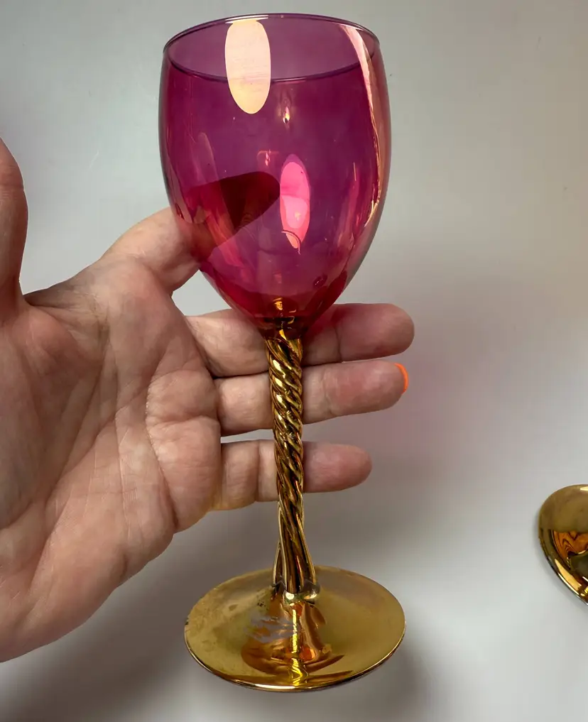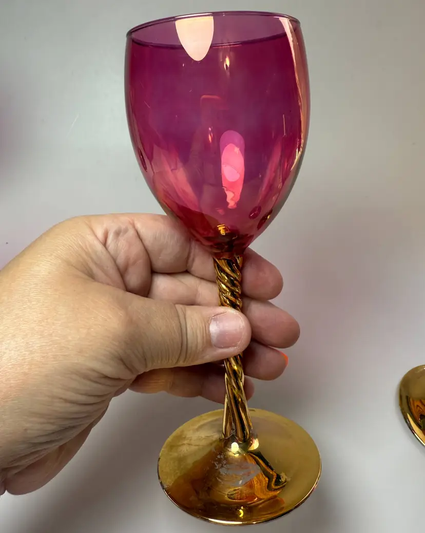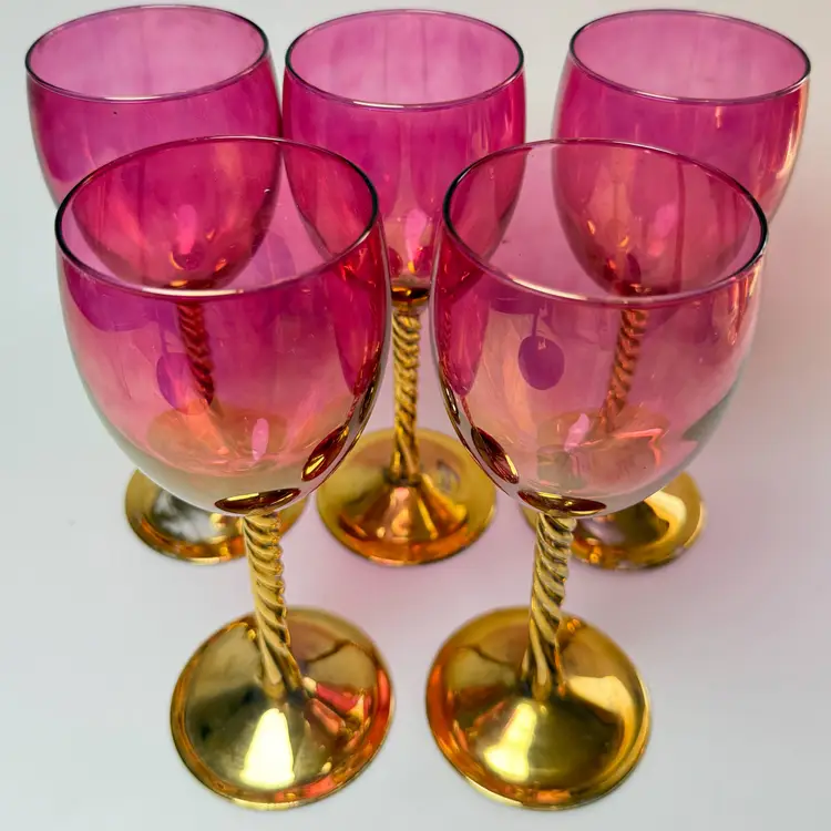 Vintage Cranberry Luster Wine Glasses Bohemian Gold Gilded Twisted Stem Set of 5. 7.5" tall x 2 5/8" diameter mouth. PLEASE READ: There is wear to the gold leaf mainly on the bases as shown. No chips, no cracks.