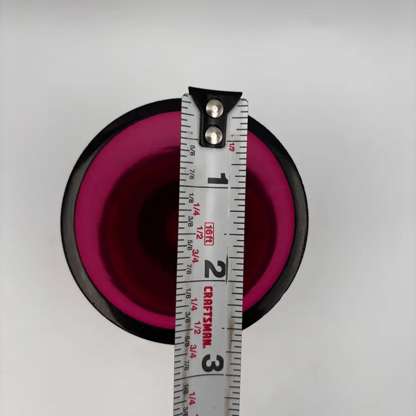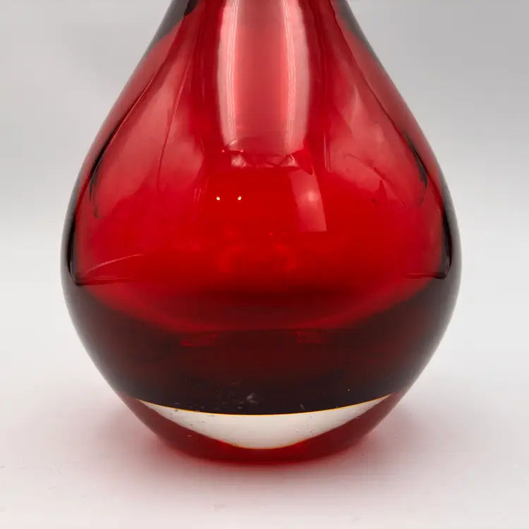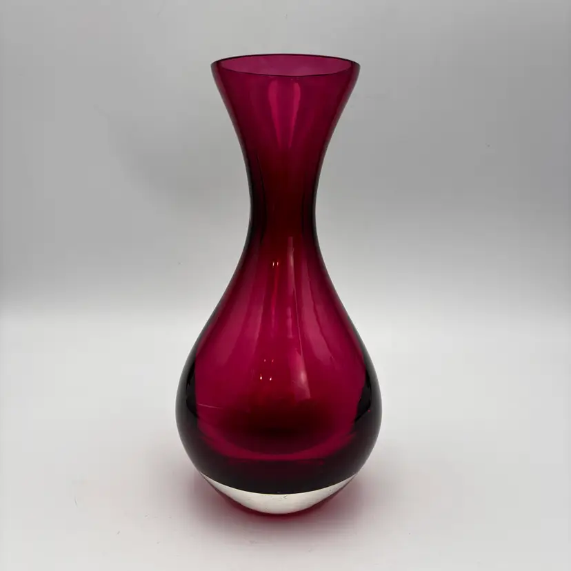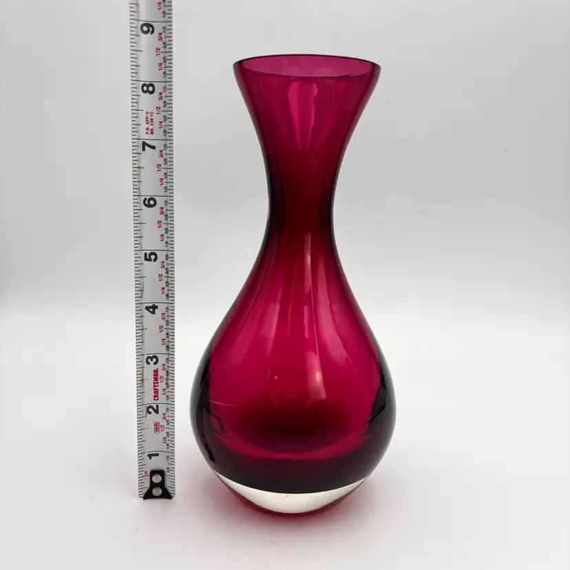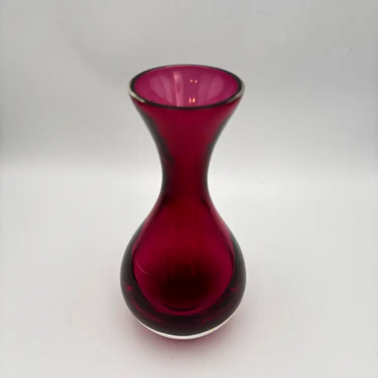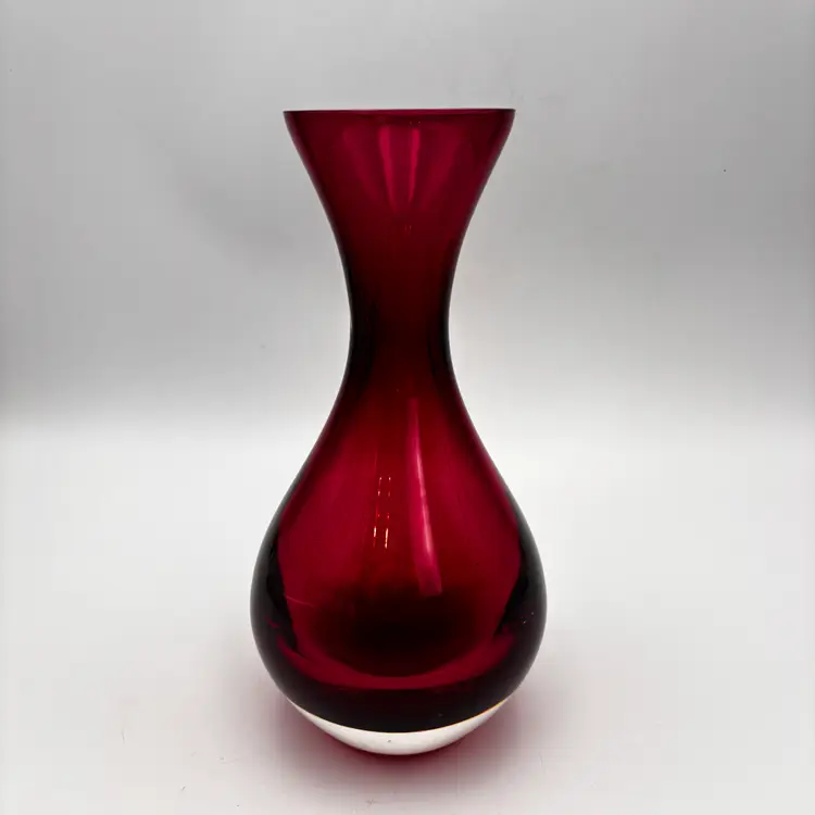 Color: Ruby red / cranberry Style: Mid-century modern / contemporary art glass Shape: Hourglass with flared rim Material: Art glass, polished bottom Finish: Glossy, translucent Use: Decorative vase or display piece