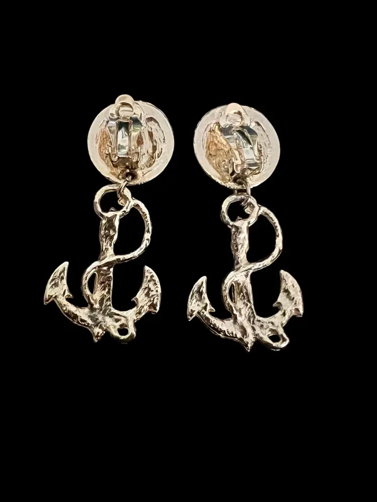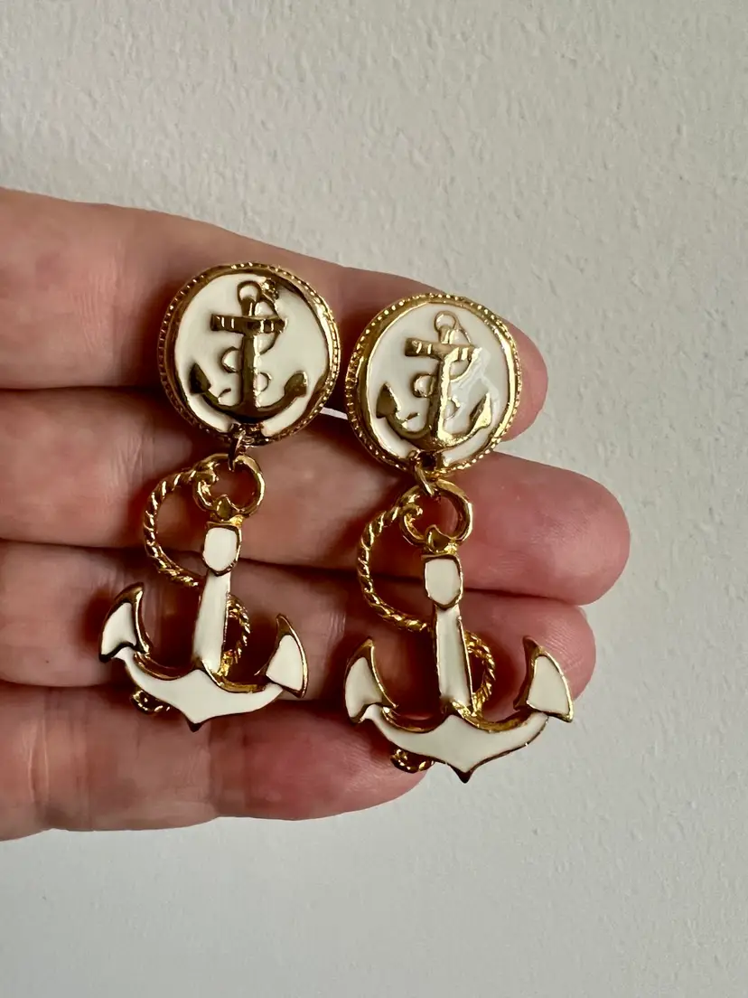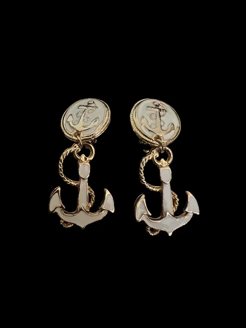 Vintage Cream Enamel Anchor Nautical Design Gold Tone Dangle Clip-on Earrings #ofc-2
