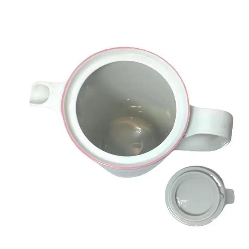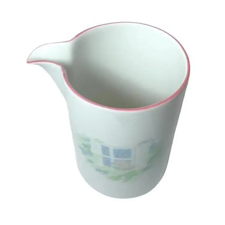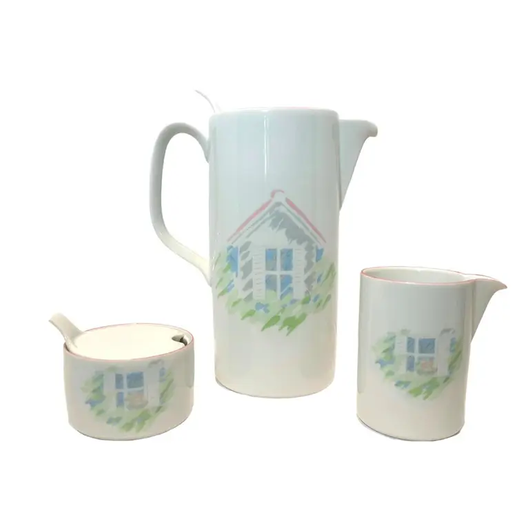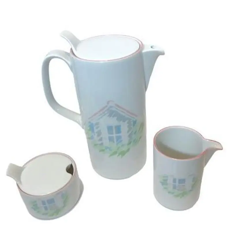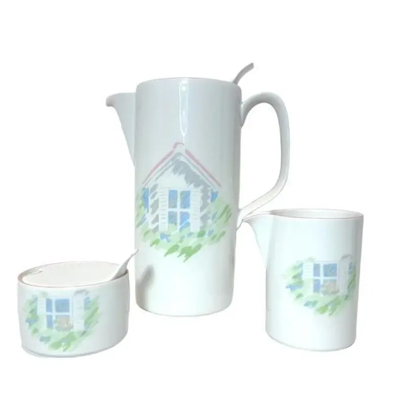 Adorable French porcelain tea set has a cottage picture and pink rim. The set will fit the cottagecore decor lover or someone who is interested in a rare unique set. The set is in good vintage condition, no chips or cracks. Dimension French teapot 5.5x6.5x 3.5 Creamer 3x2.75x1.75 2.25x2.75x3