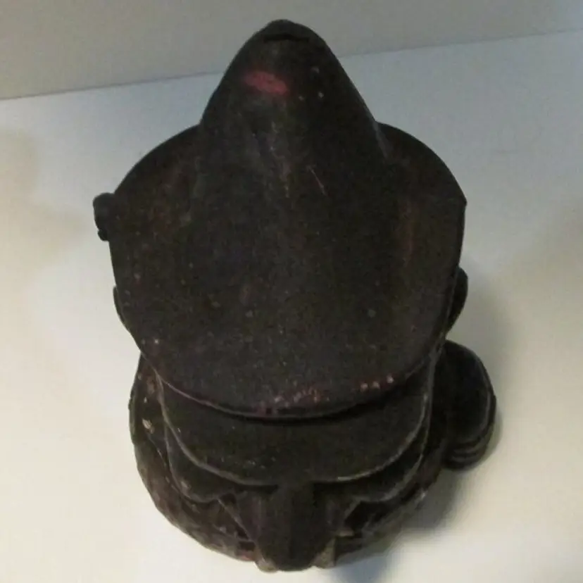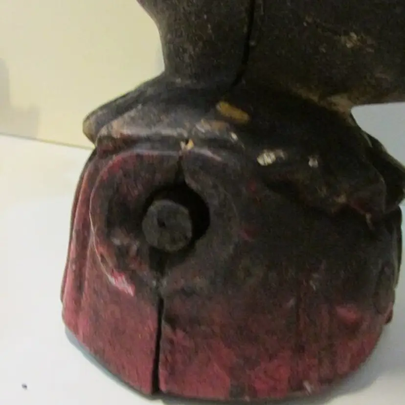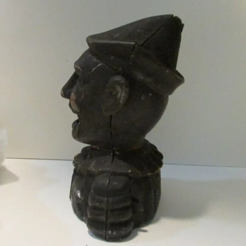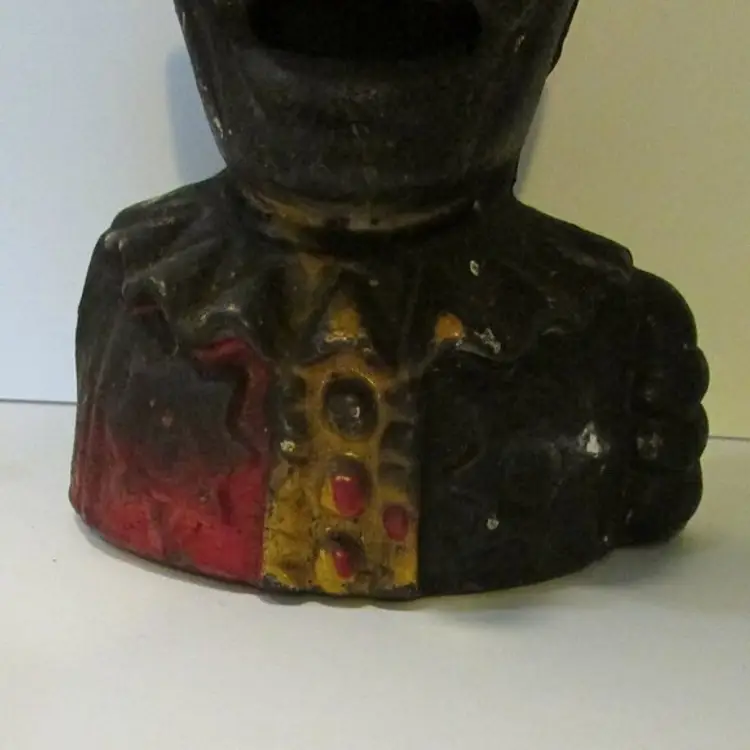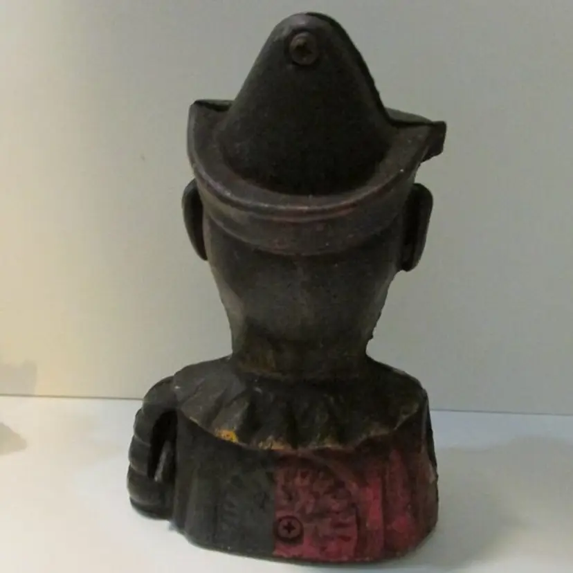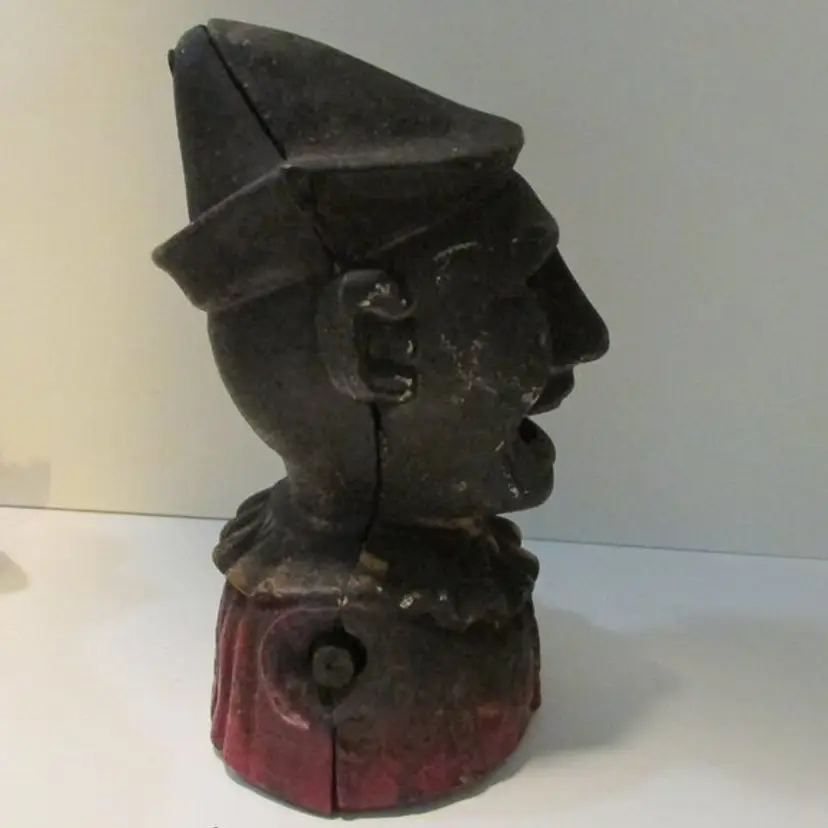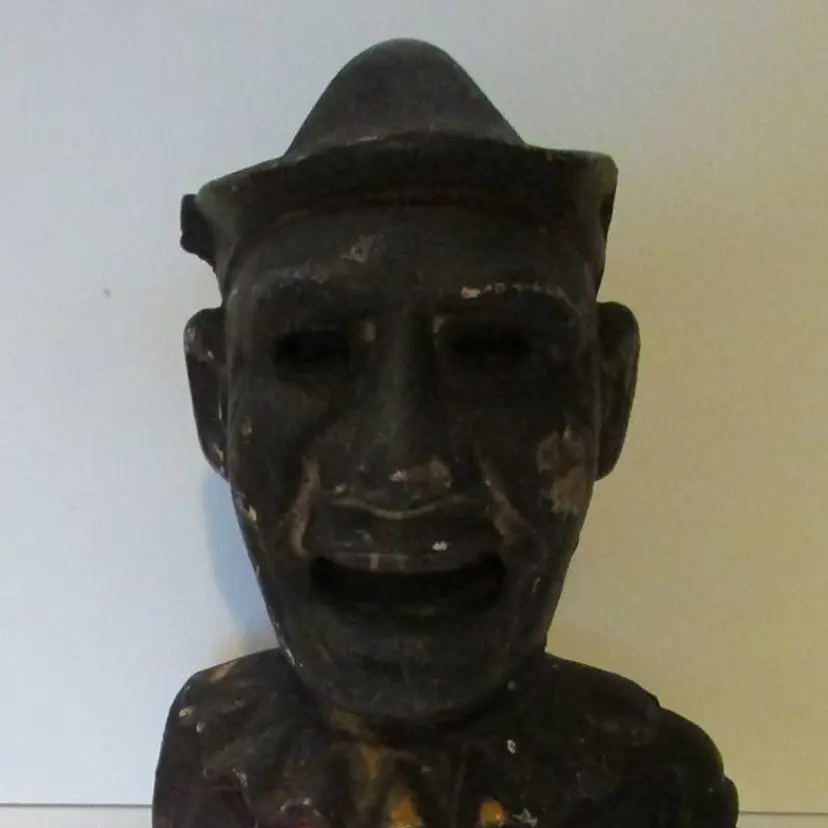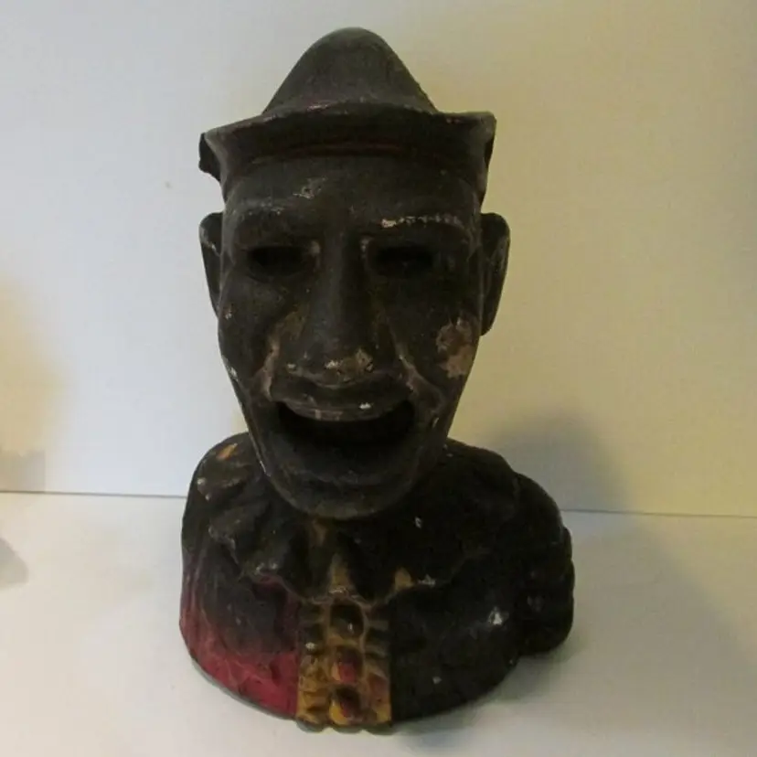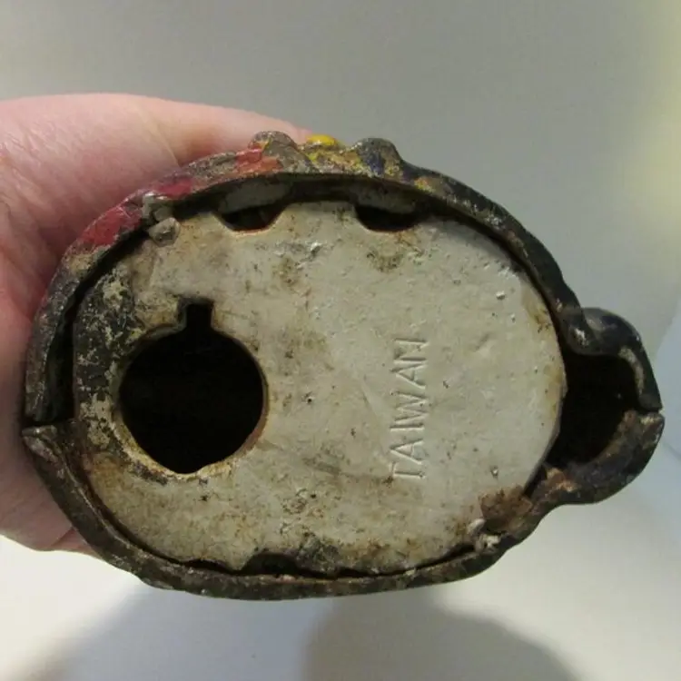 This clown bank has some damage, he is missing his arm, missing stopper and most of his paint has worn off. Still a great piece to display, especially for Halloween. He is about 7 1/2" tall.