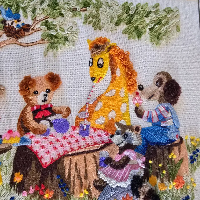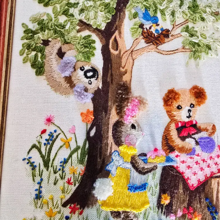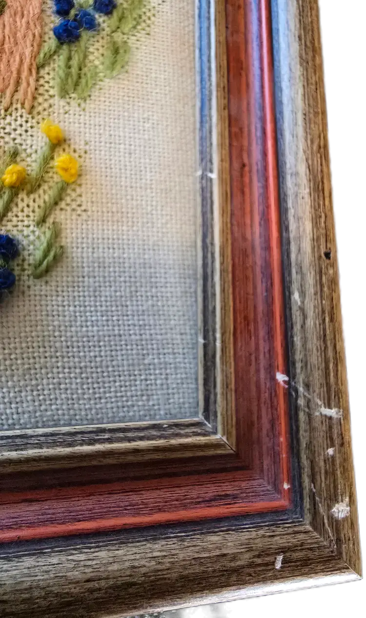 No rips or stains. Thread is all in good format. Frame itself is wood and has small wear as in nicking, small suffs. No major cracks or chips. Backing is in great condition. Ready to hang. 19 inches long by 14 inches high.