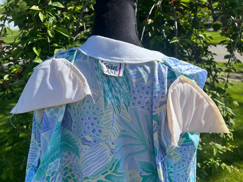 Brand/Maker- Cricket Lane Size- Marked 18 see measurements below for true size, aligns with a modern 2x/3x Color- Blue, Yellow, Green, White Condition description- No rips, stains or tears. Collar and bottom trim has common pilling. Zipper functional. One shoulder pad needs to be reattached on right side, see photos. Fabric- Polyester