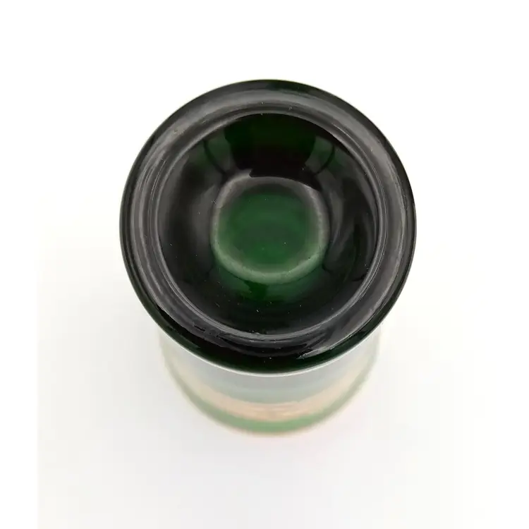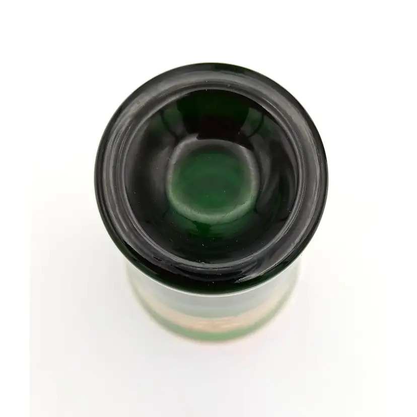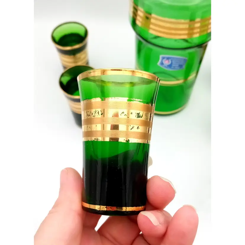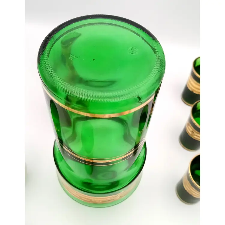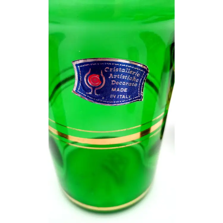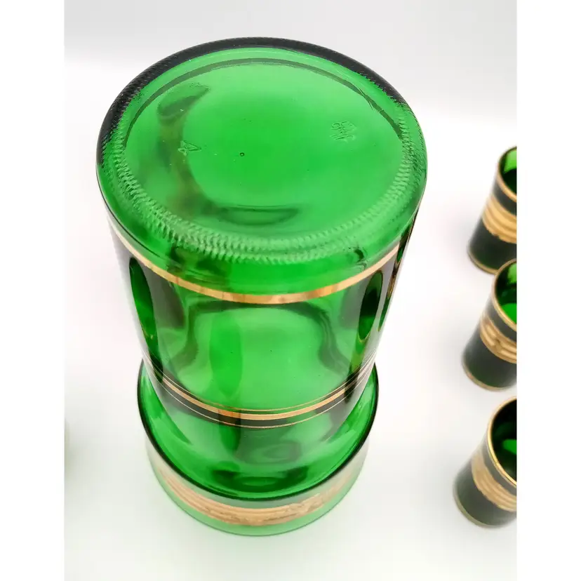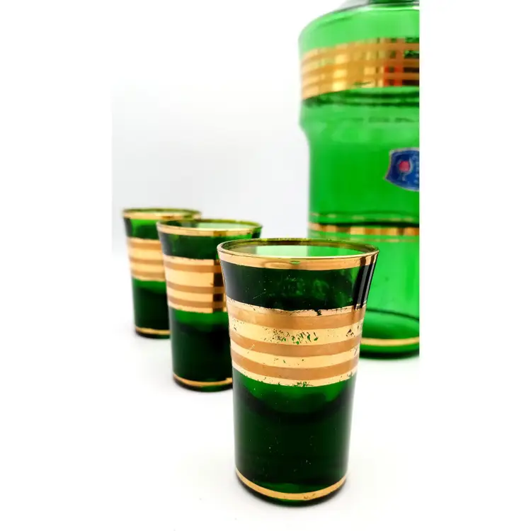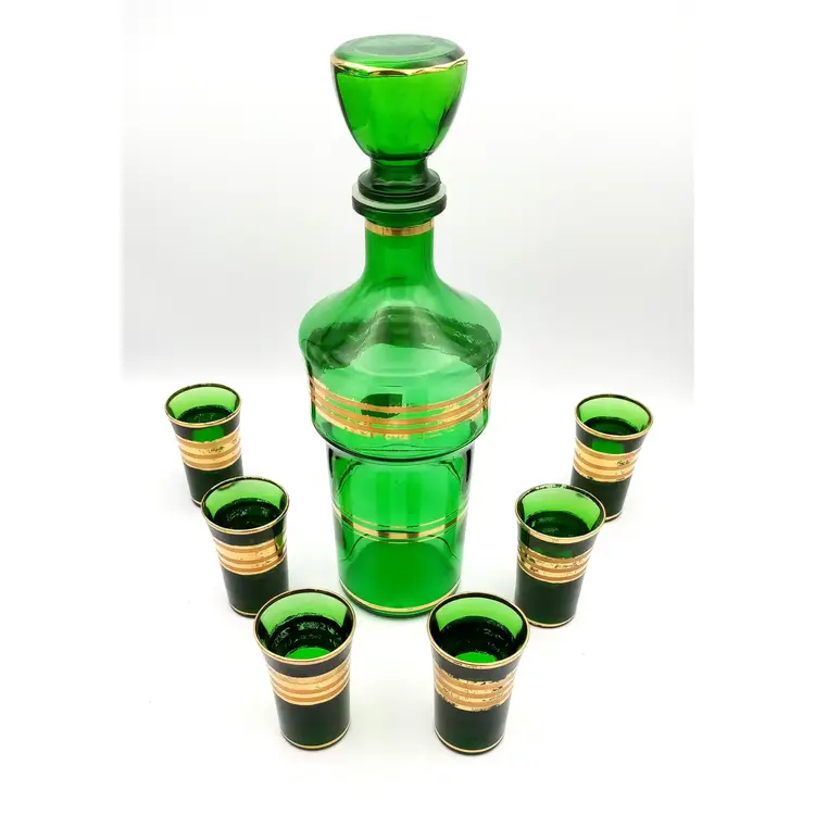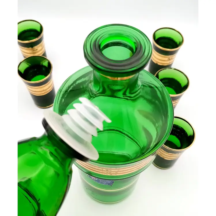 Complete set of cordial shot glasses included with this vintage Italian green decanter. Age is unknown. The gold is worn a bit. Please refer to photos for condition. Manufacturer sticker is still present. All glass is in great condition as well as the stopper on the decanter. Shot glasses are weighted with thick glass at the bottom. The decanter is about 11" tall with the stopper and the glasses are almost 3" in height.