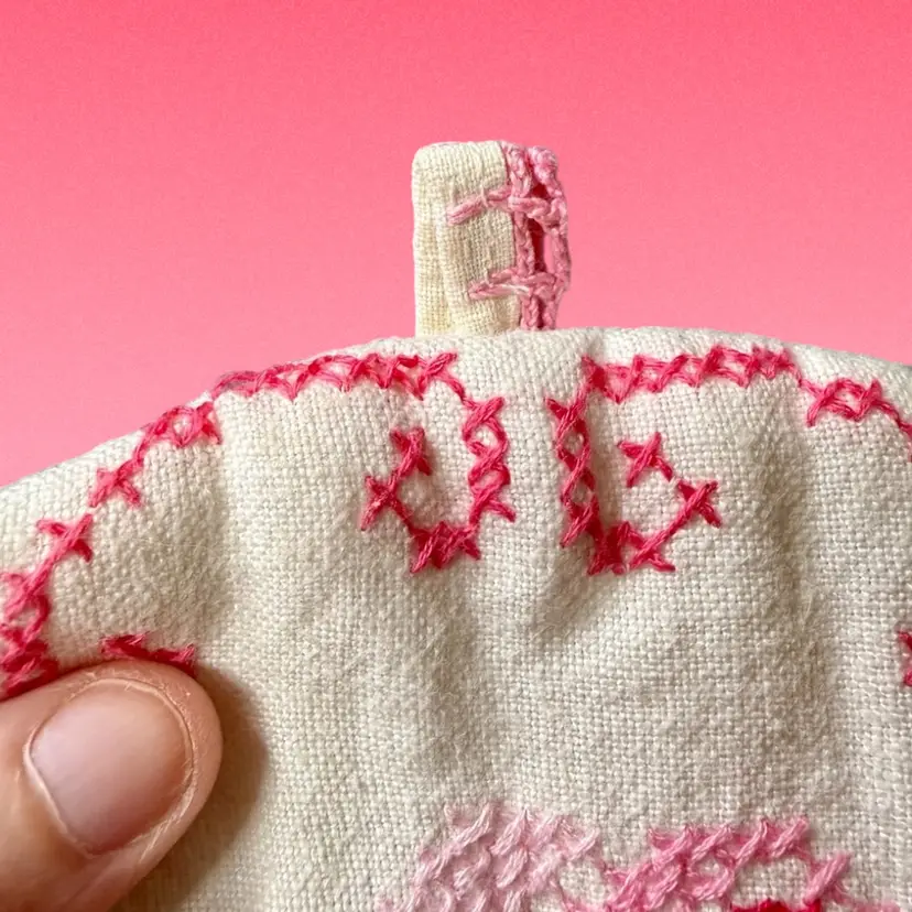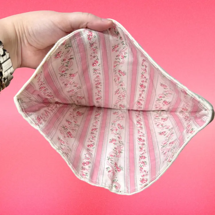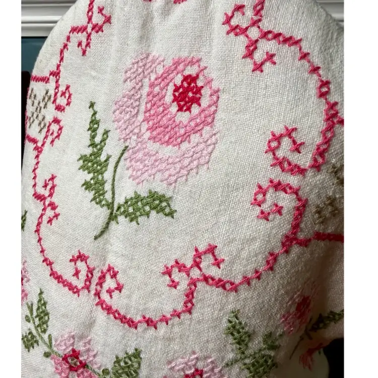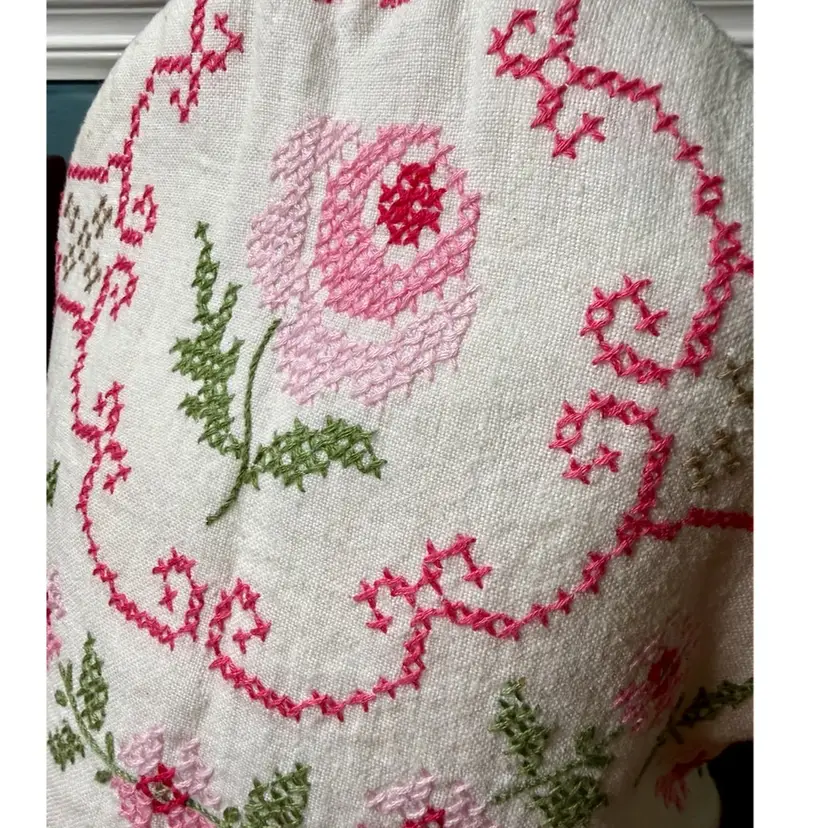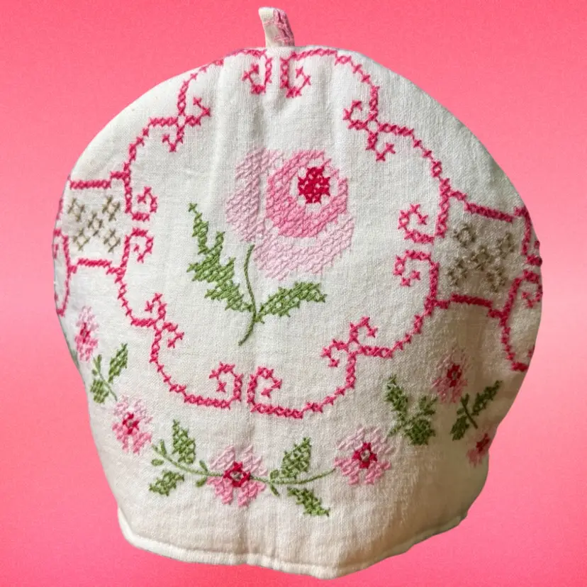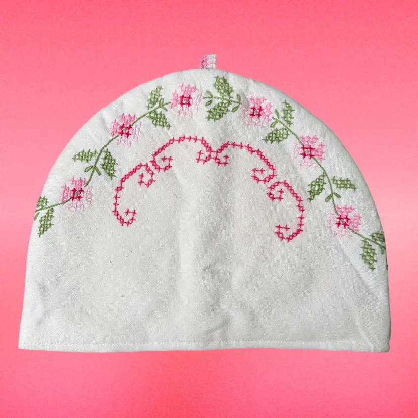 12"x9" (laying flat). Darling handmade tea kettle cosy/cover. Base fabric is white, with pink and green cross stitch embroidery to create a floral pattern. Inside is lined with another print of fabric for contrast, still pink & floral! Has a small loop on top. No issues or stains!