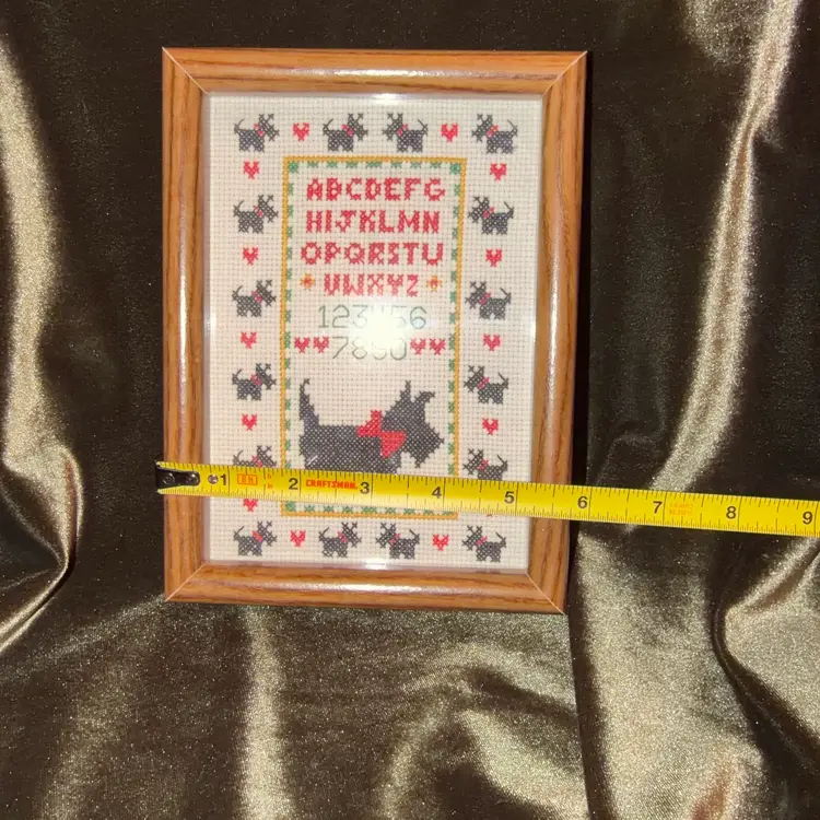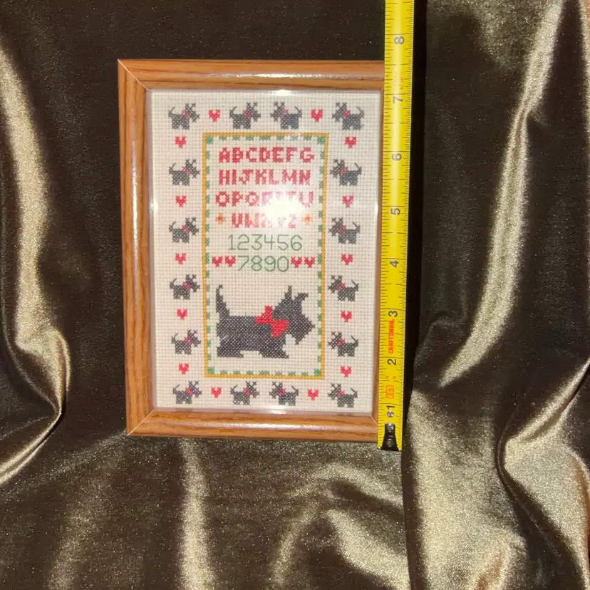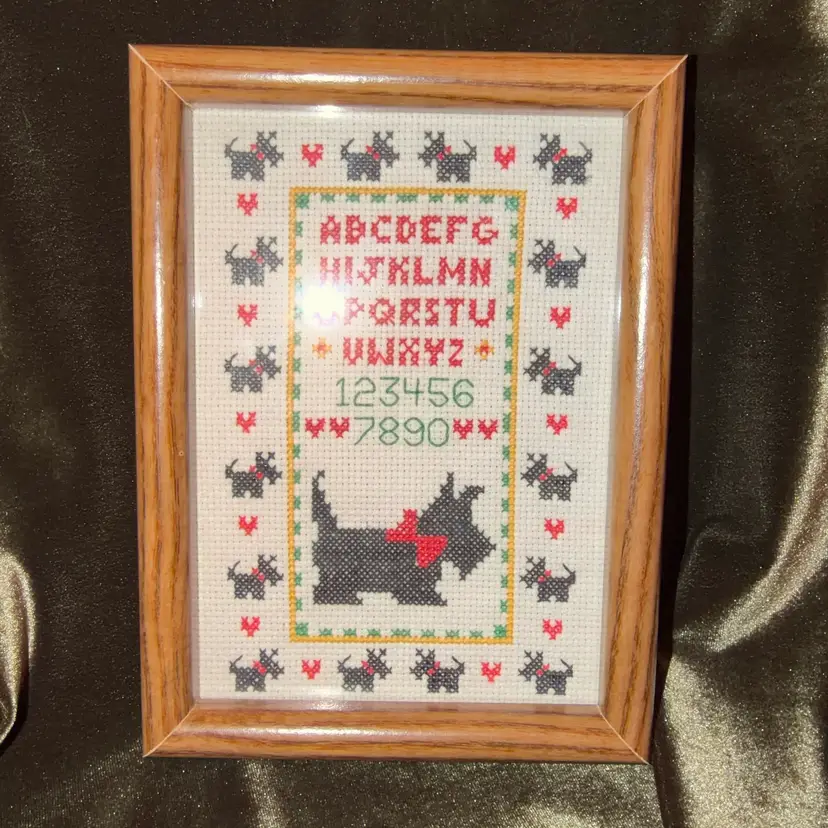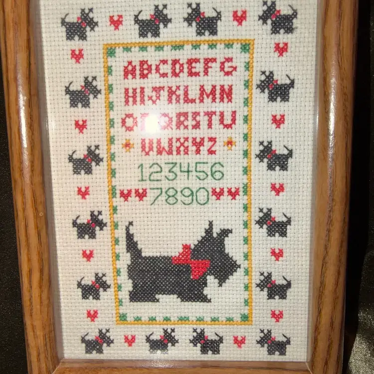 A charming vintage cross-stitch sampler featuring a Scottish Terrier (Scottie dog) surrounded by the alphabet and numbers, framed in a simple wooden frame.