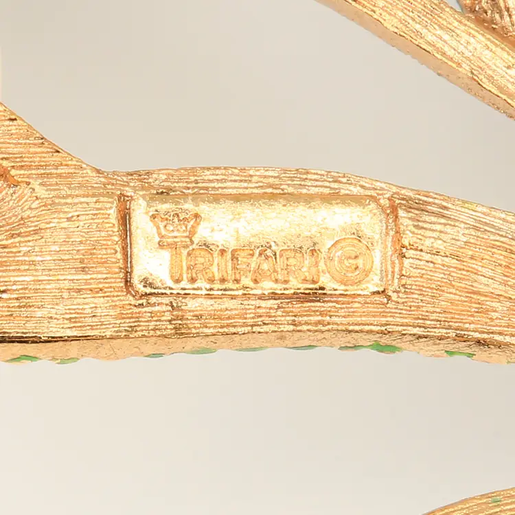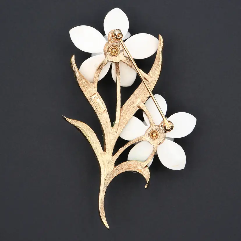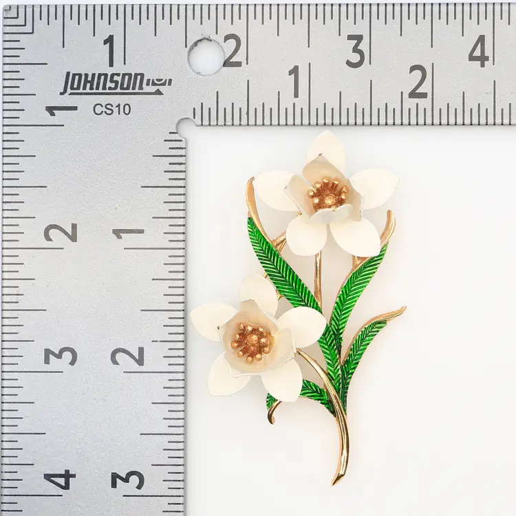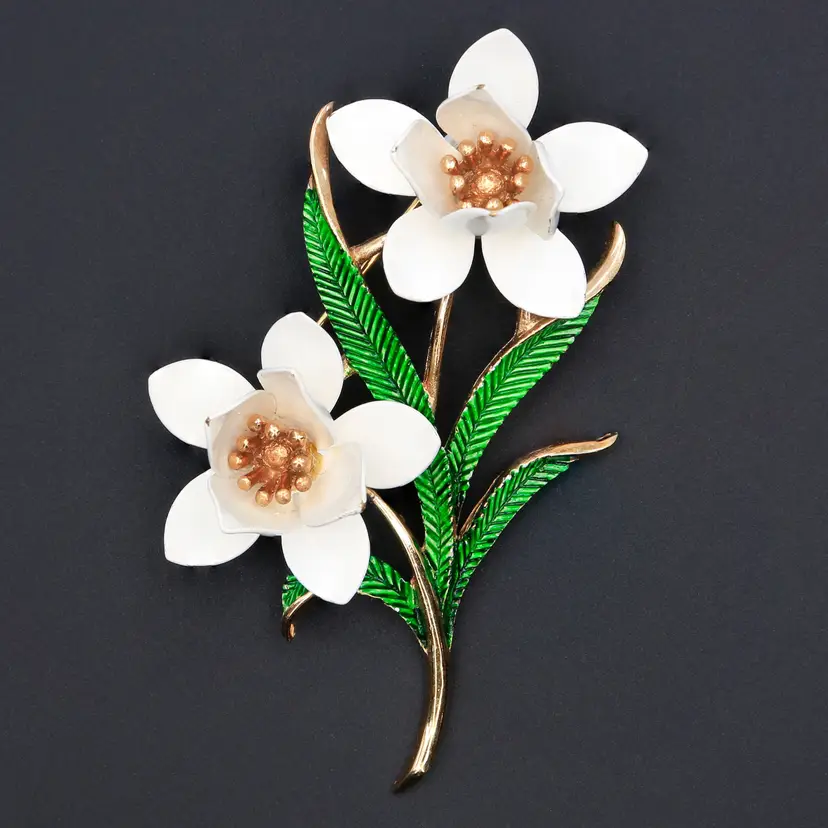 This charming vintage Crown Trifari brooch showcases two white enamel flowers on a gold-plated Trifanium stem with textured green enamel leaves. The white enamel flowers feature a three-dimensional center resembling a narcissus, complete with a gold-plated pistil and stamens. Signed Crown Trifari ©, this piece dates to the 1950s. Trifanium, a shiny, tarnish-resistant metal alloy, is plated with gold for a golden toned finish. Renowned for exceptional quality and unique designs, Trifari jewelry is highly collectible, making this Crown Trifari brooch a great addition to any vintage jewelry or Trifari collection.