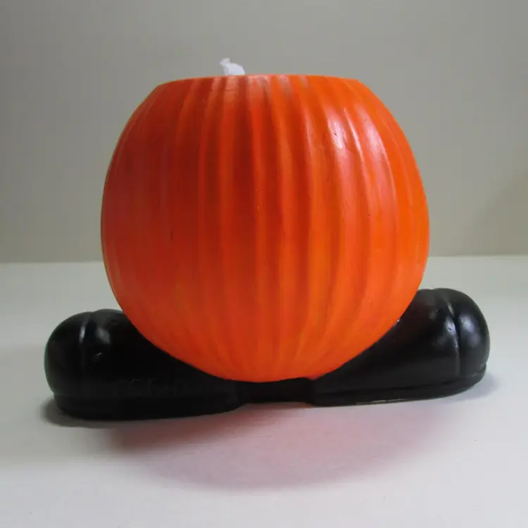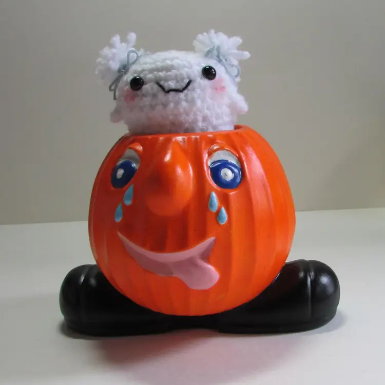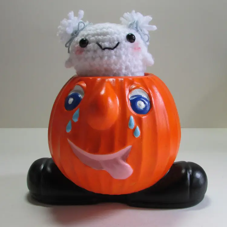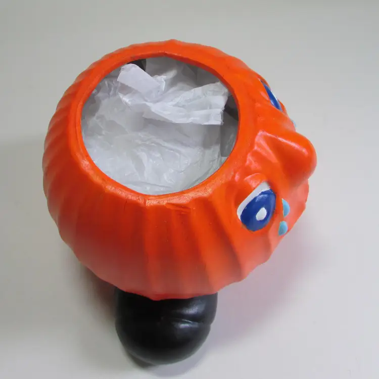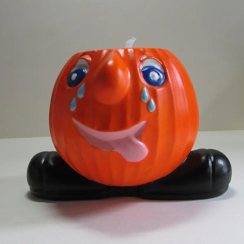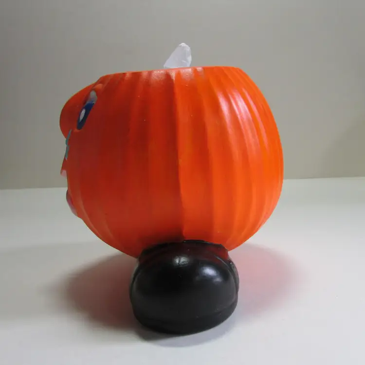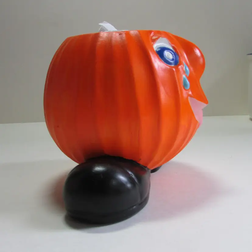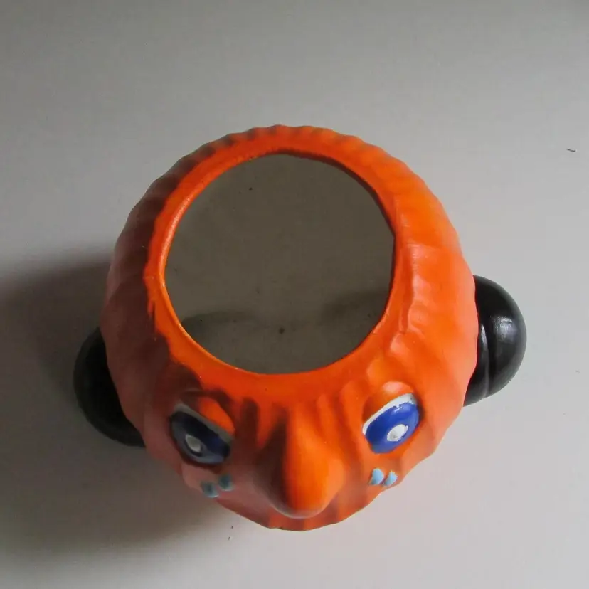 This fun planter has some wear, there is some paper that has stuck to the bottom. There is a little ghost crocheted by my mother popping out. It is about 4 1/2" or 7" with ghost x 6" x 5". This is shipped from a smoke free home. Thanks for looking!