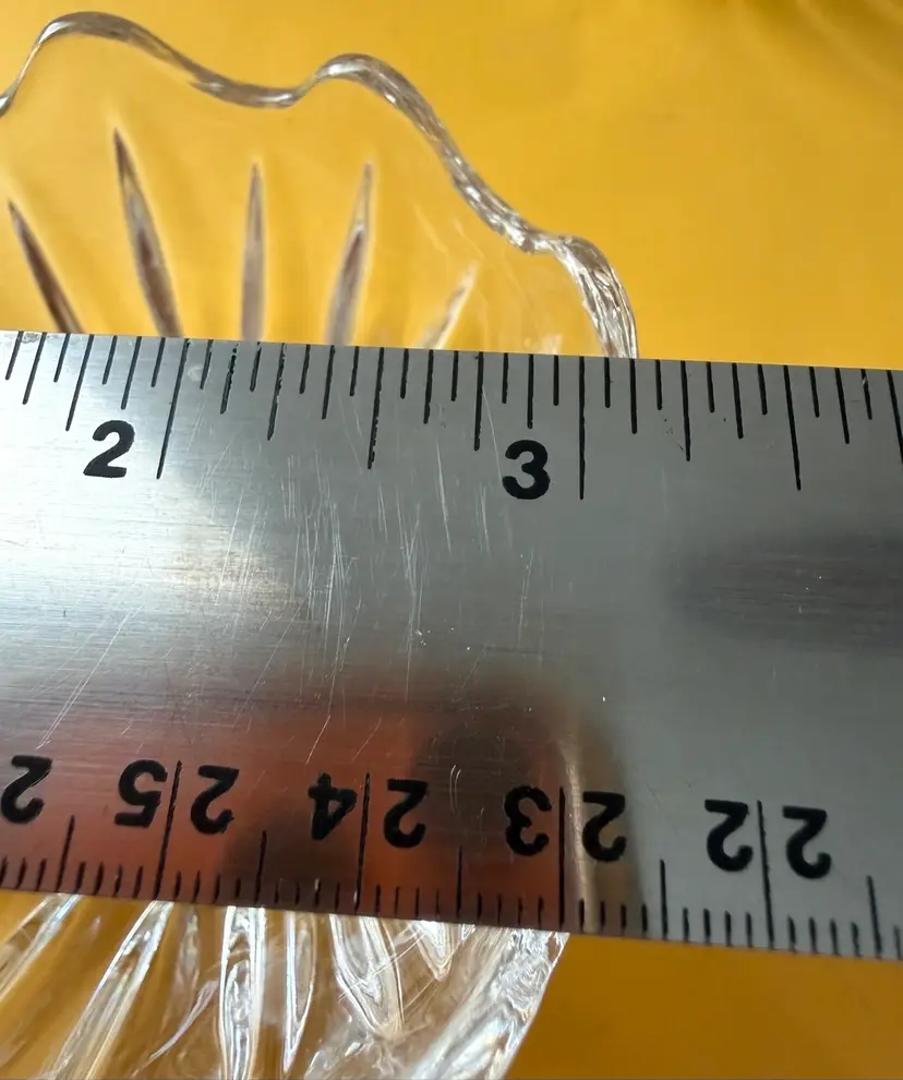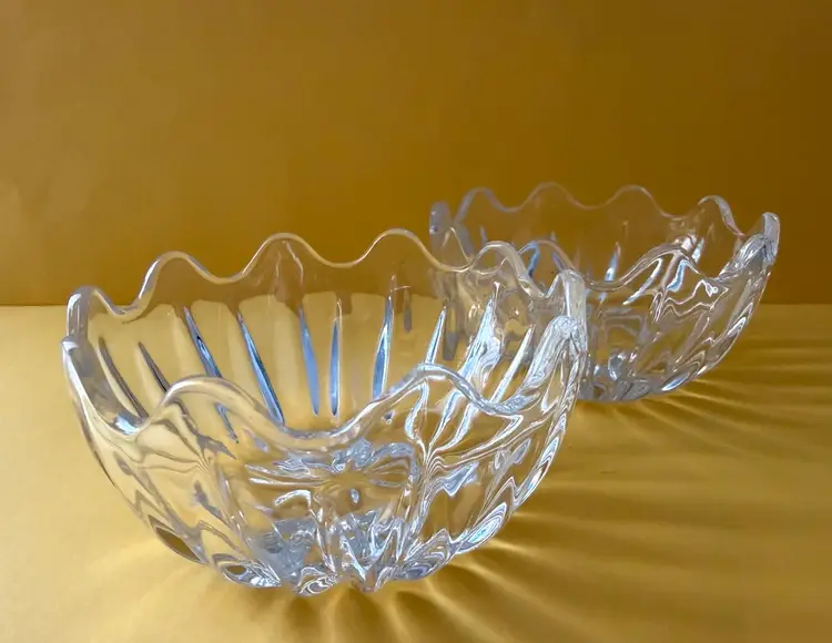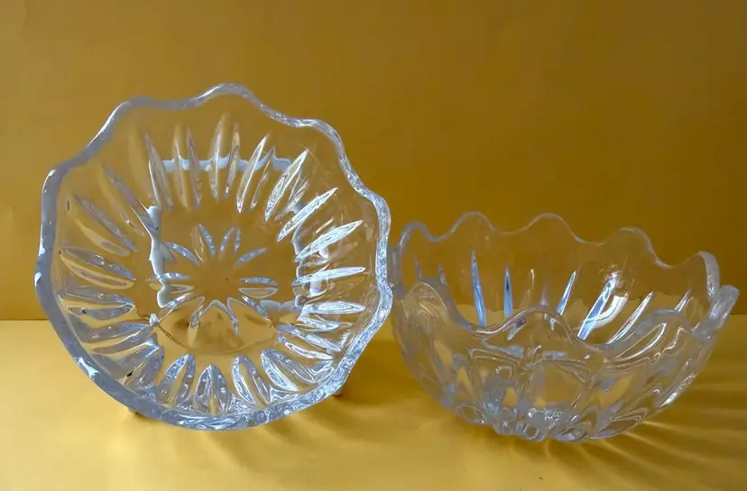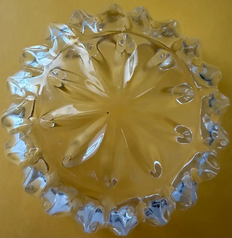 This is the cutest idea. 2 duplicate crystal dishes that fit on top of one another to form a ball. Use them separately, use one lidded or whichever way you can think of. Just a little over 3” in diameter.