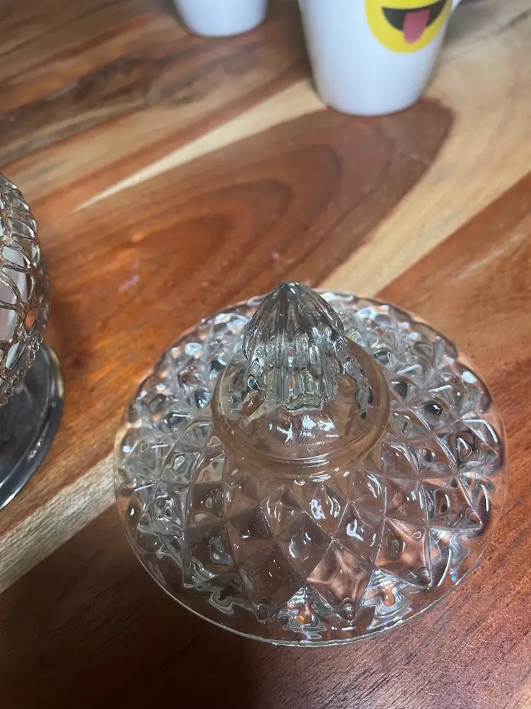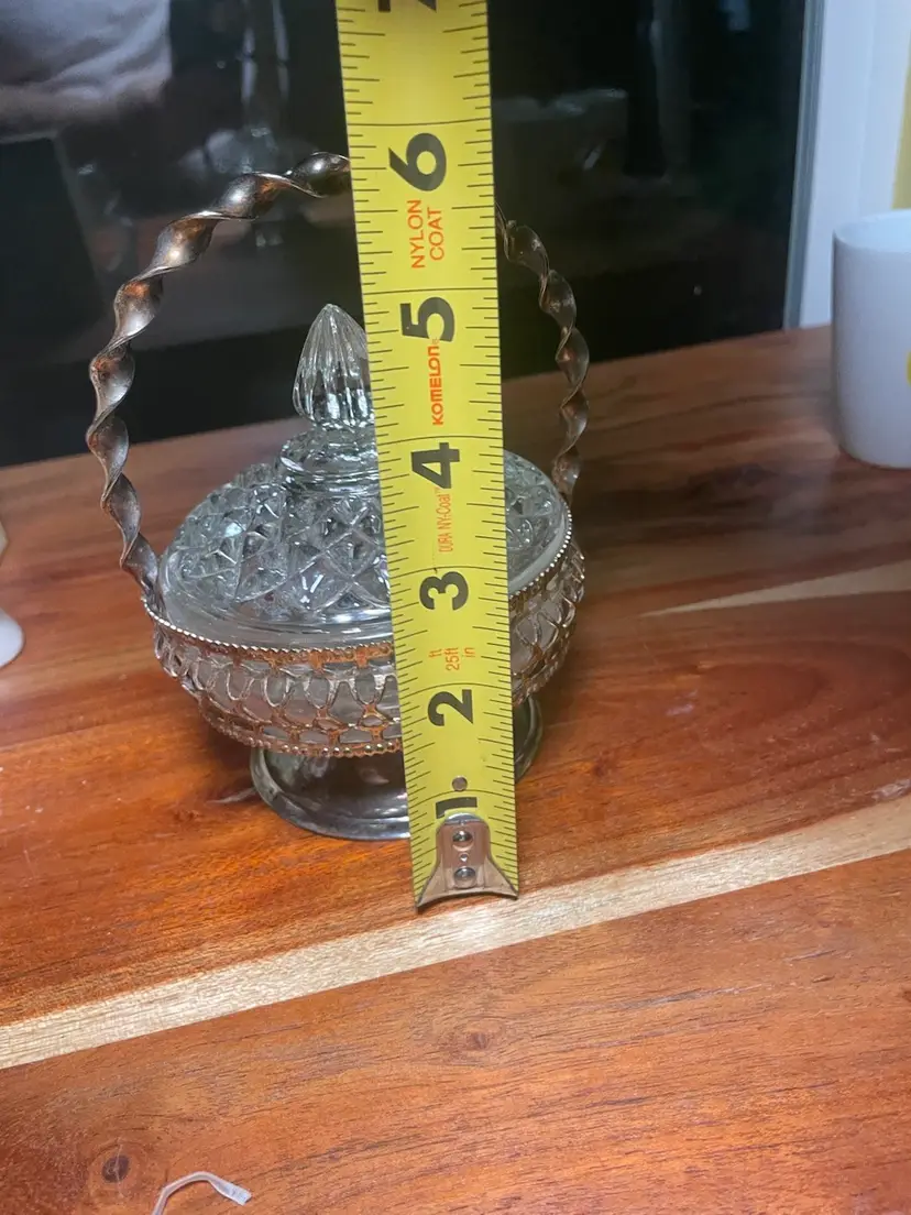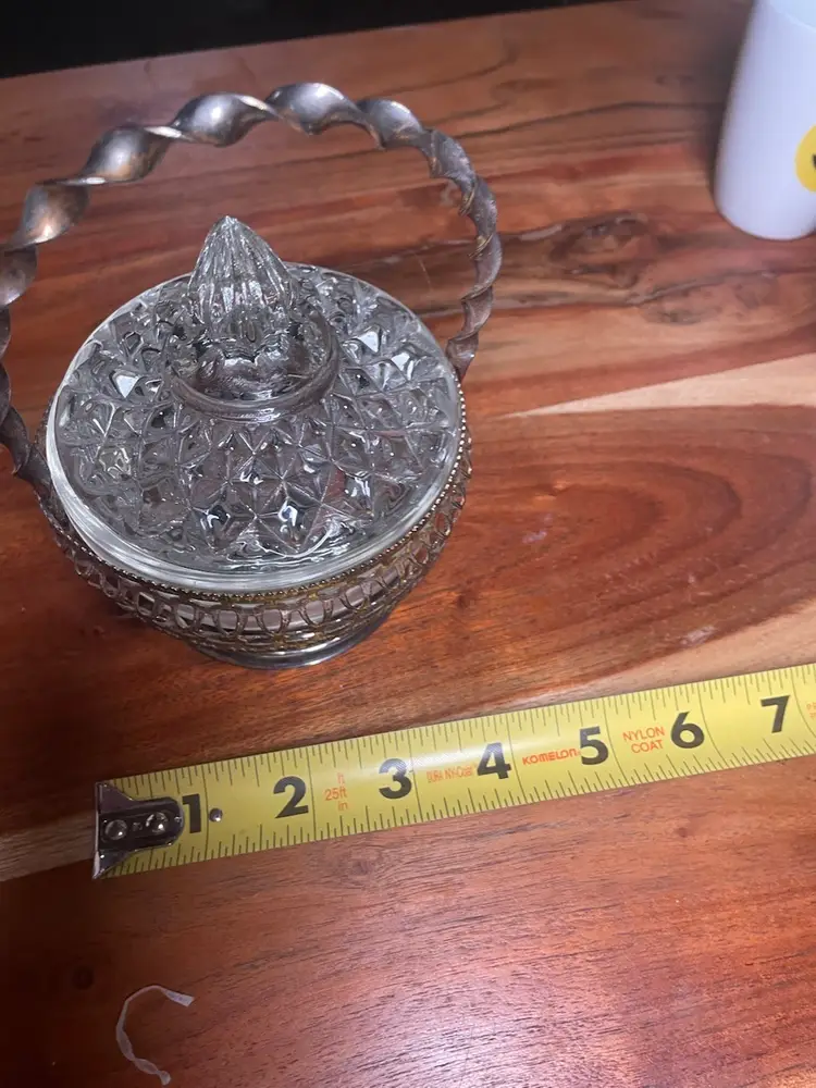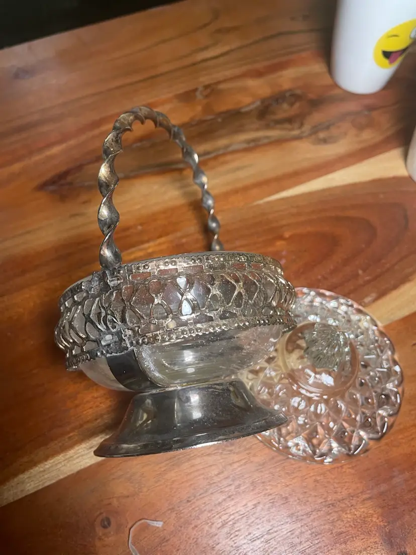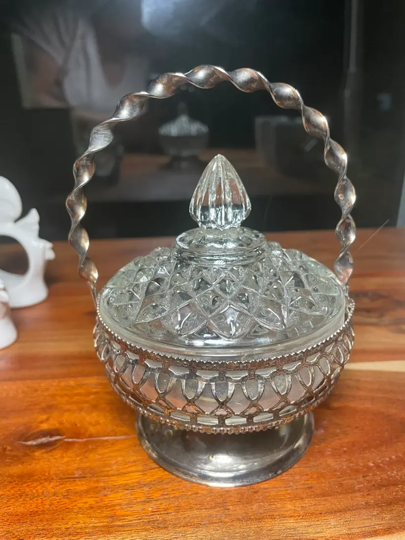 This is a crystal Brama Silver Plated basket/ candy dish with lid. Some scratching on handle. Item still has original sticker