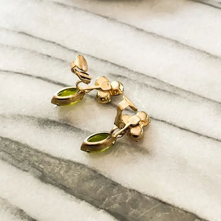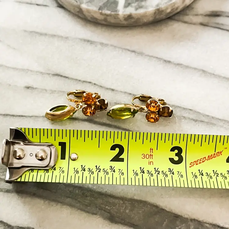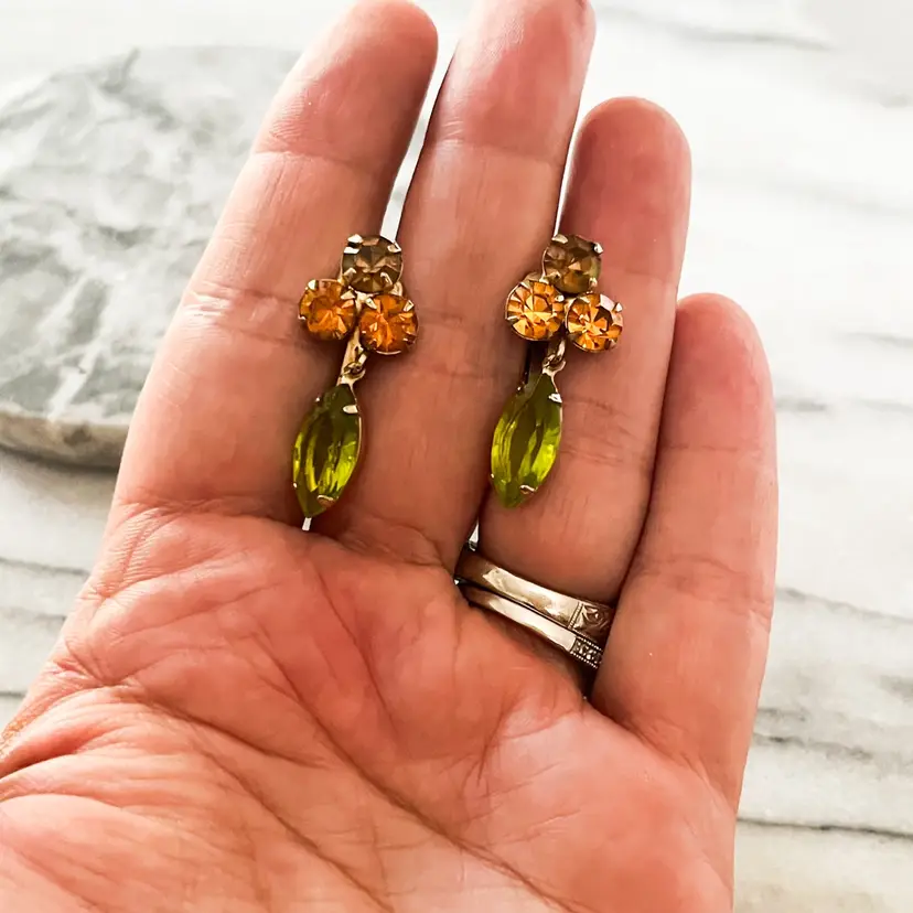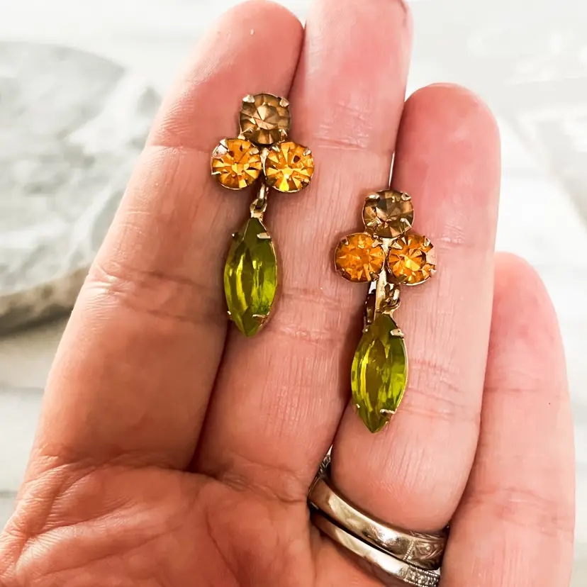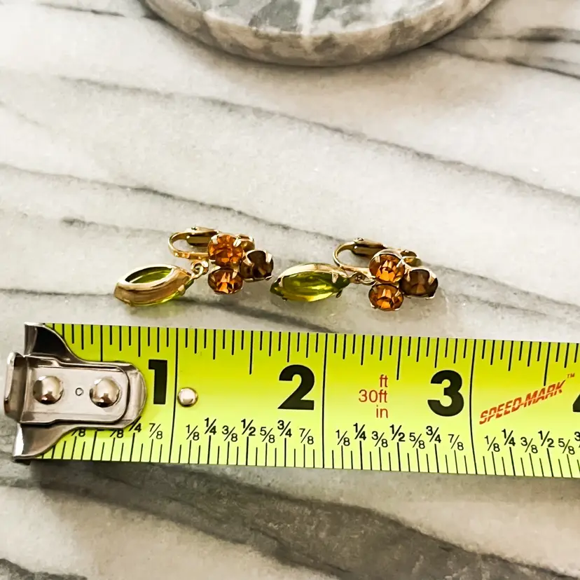 Vintage Crystal Drop Earrings Topaz Brown and Green Stones Prong Set Rivioli Gold toned metal setting Clip On Unsigned