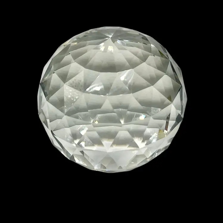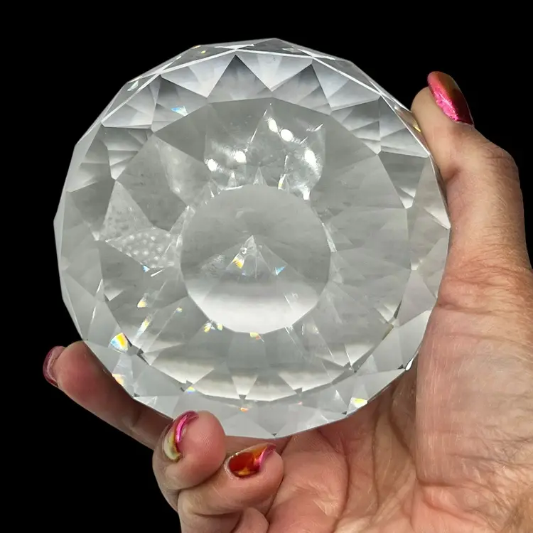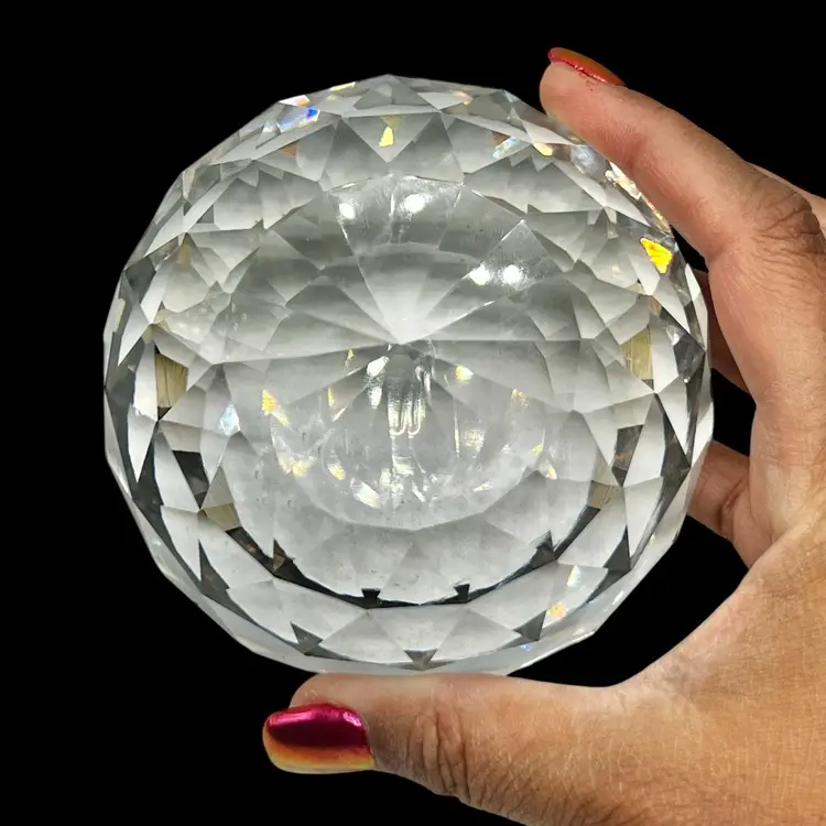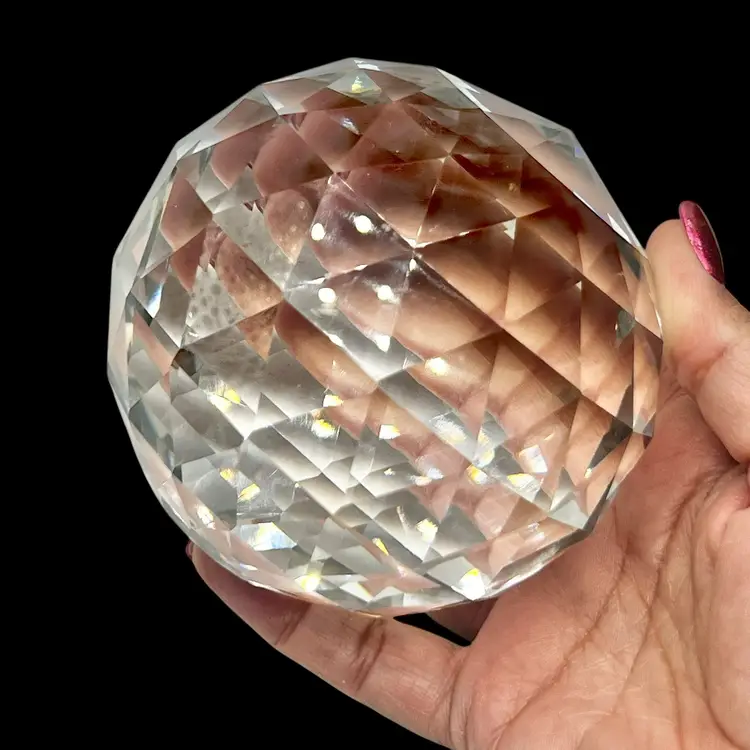 This is a beautiful large faceted crystal paperweight, crafted in a diamond-cut sphere shape that catches and reflects light beautifully. Perfect as a desk accessory, shelf display, or gift for lovers of elegant décor.