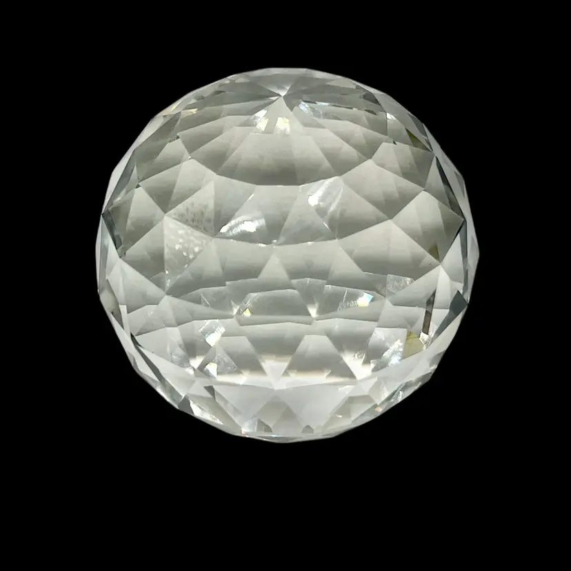 📌 Details: • Material: Clear faceted crystal • Size: 2.75” tall x 2.75” diameter • Shape: Multi-faceted sphere, diamond-cut style • Condition: Excellent preowned condition with only the smallest ding (pictured) and very minimal surface wear, barely noticeable. Displays near perfectly.