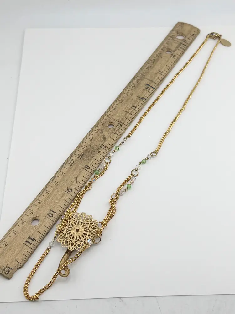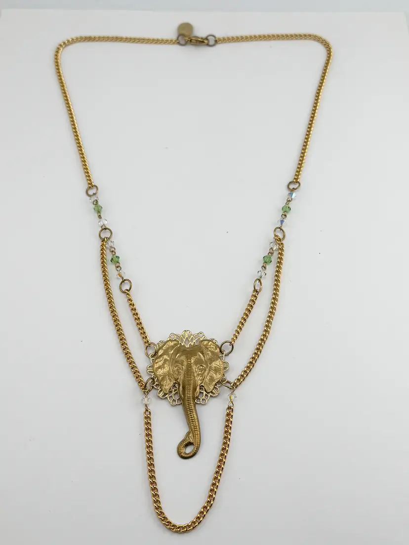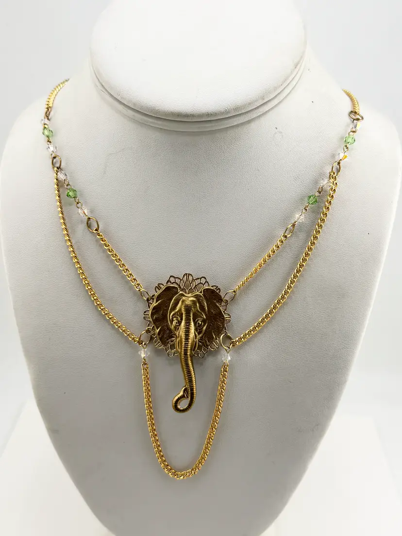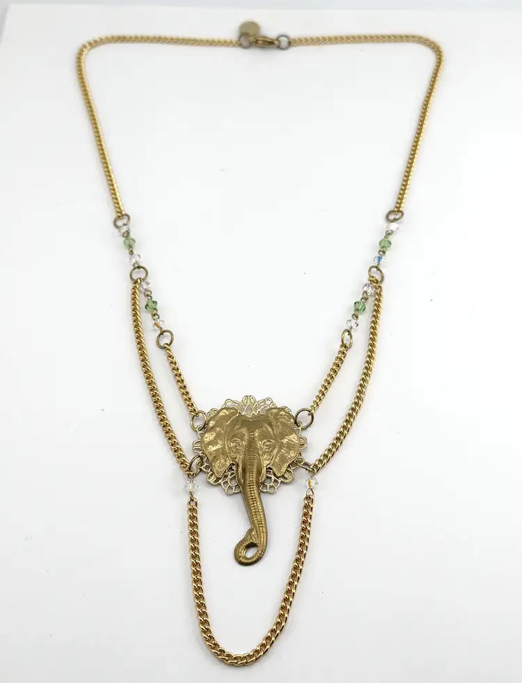 Vintage crystal filigree elephant chain necklace. Green and clear crystals on gold tone chain with filigree elephant pendant super cute. MN54GH.