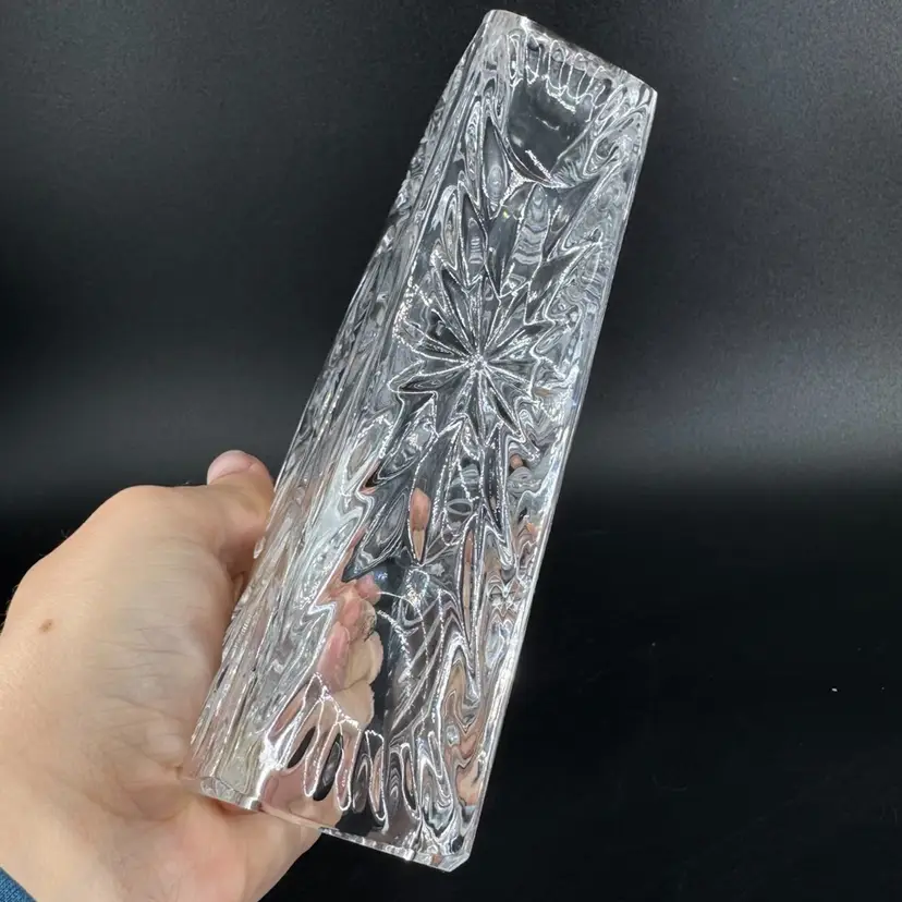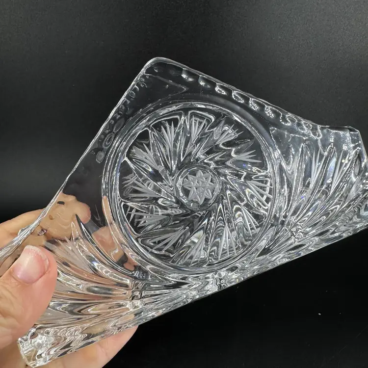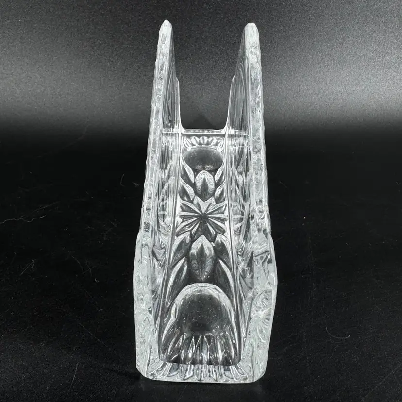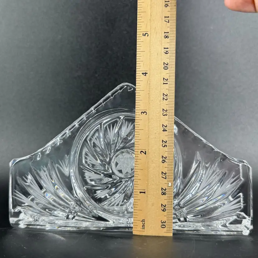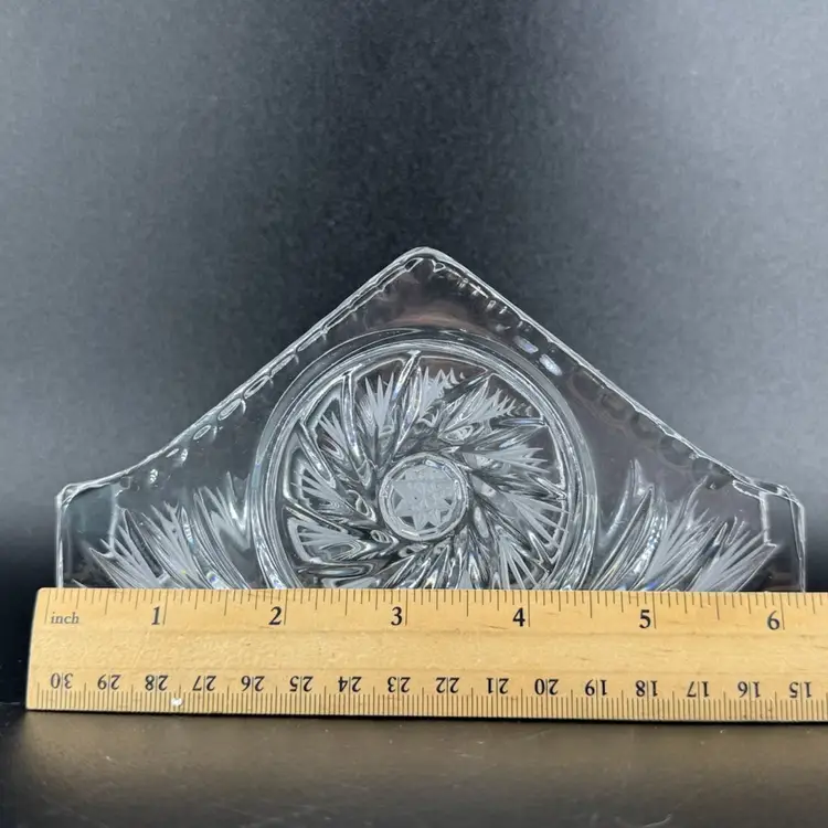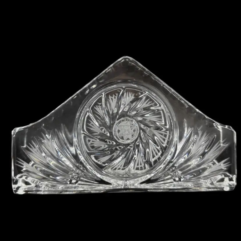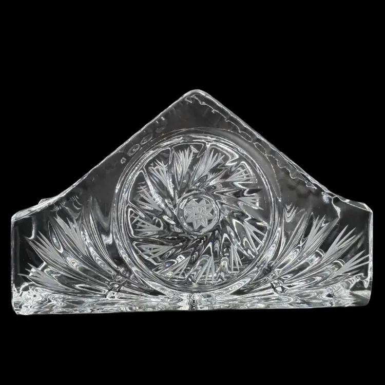 Vintage triangular shaped napkin holder made of clear cut crystal featuring a pinwheel design on both sides, as well as a cut design on the bottom as shown in pictures. No chips, cracks, or signatures. Napkin holder measures approximately 6.24” long and 3 3/4” tall at highest point.