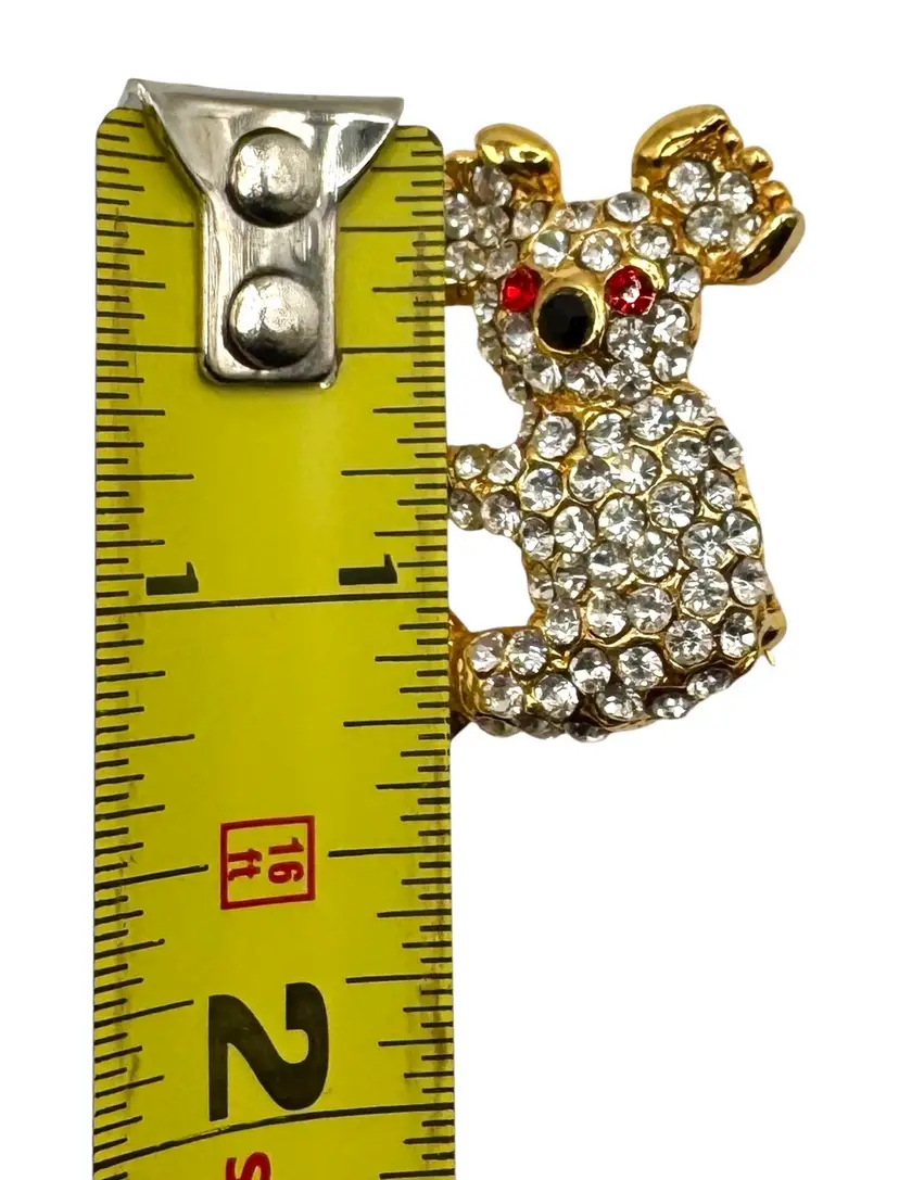 Gold tone koala brooch with red rhinestone eyes. Gems and metal are untested; metal sticks to a magnet.