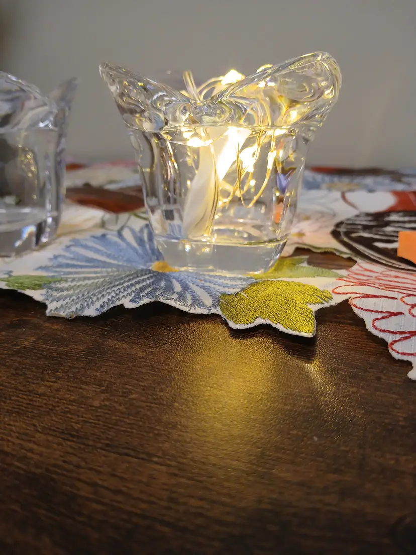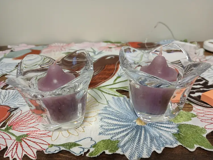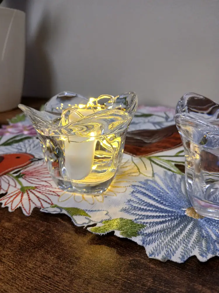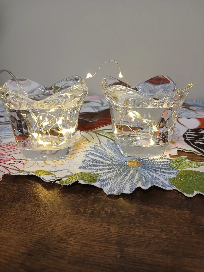 Add a touch of elegance to your decor with these vintage crystal tulip candle holders. Perfect for creating a serene ambiance. Each holder measures approximately 3 inches in height. ( Lights not included)