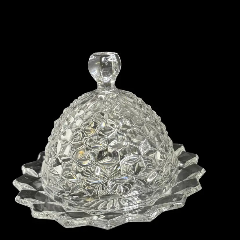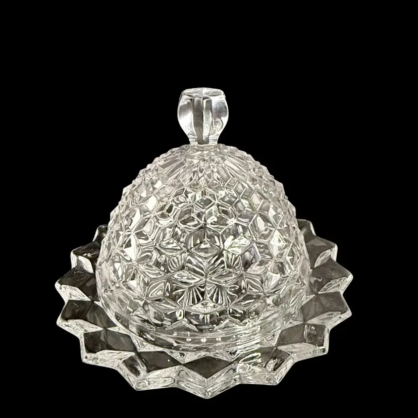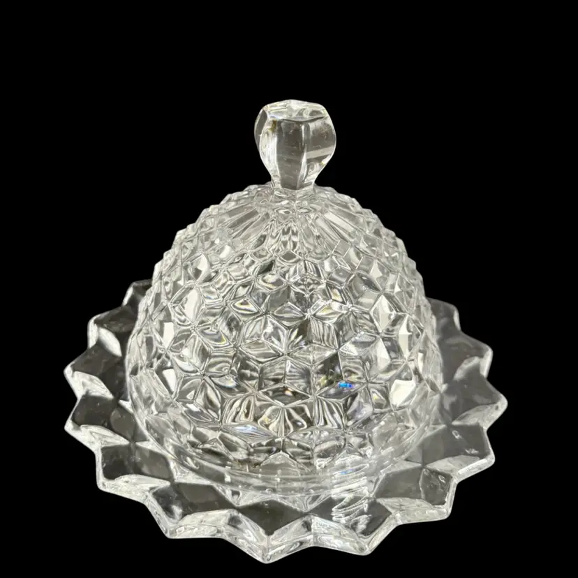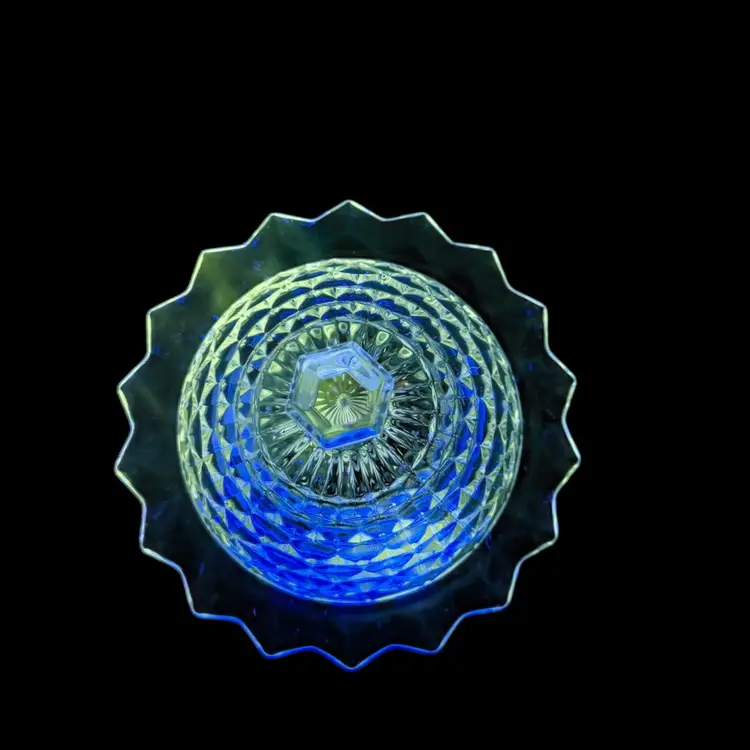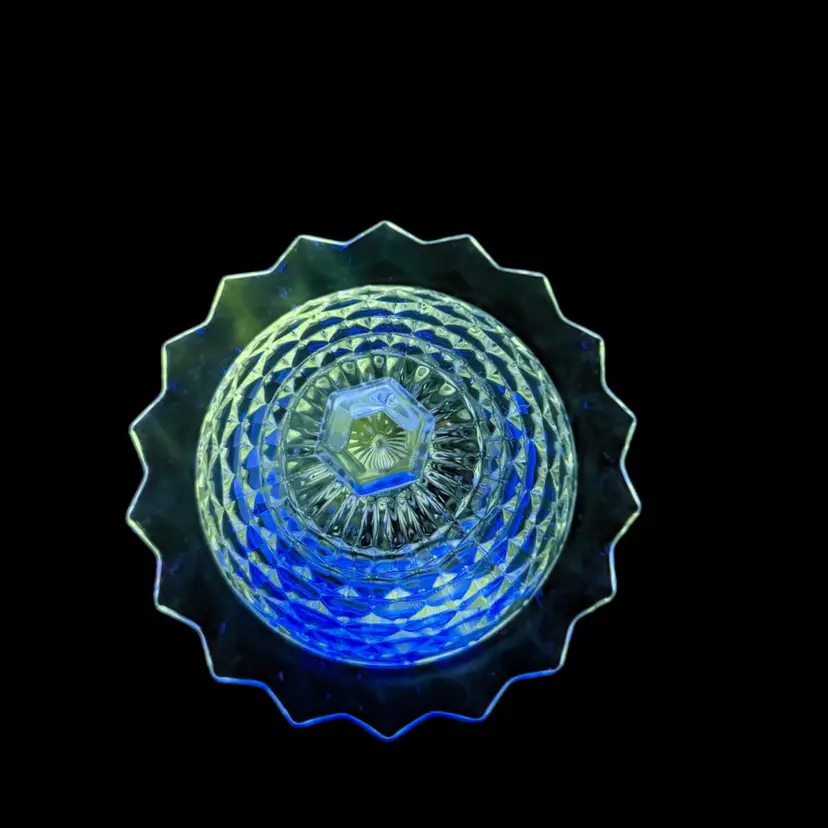 Vintage Cubist American Fostoria American Glass Dome Butter Dish. Light UV Glow with 365 black light.