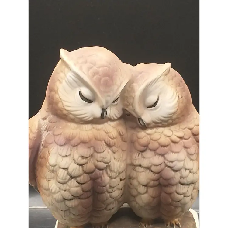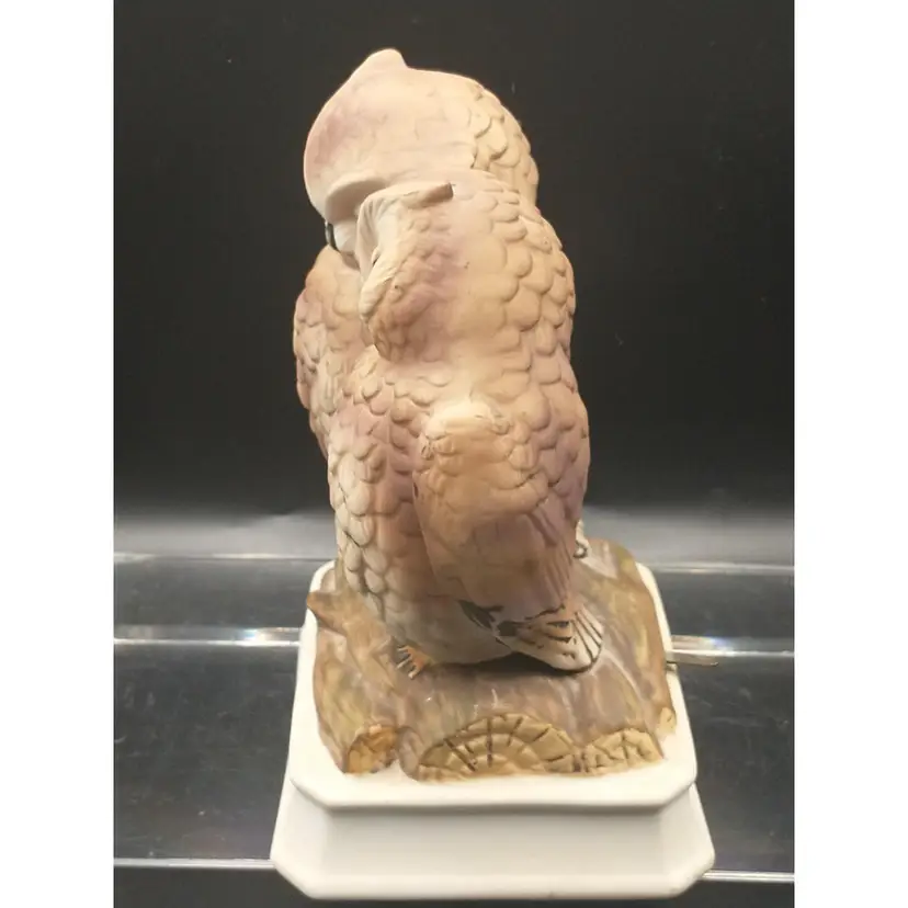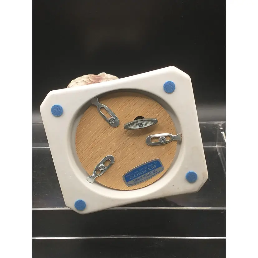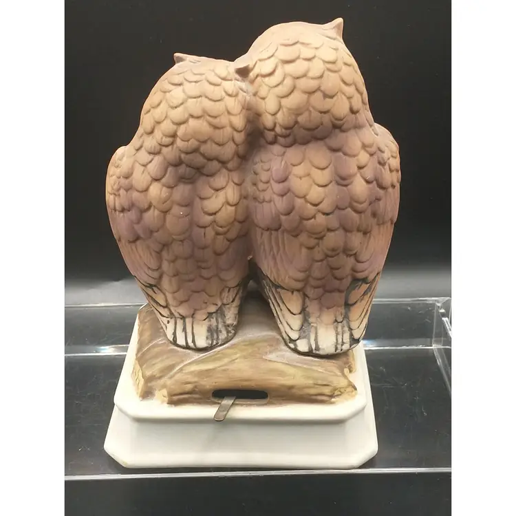 This sweet vintage Gorham music box features two cuddling owls. The bottom of the box has the winding mechanism and well as the original Gorham sticker. There is an on and off lever in the back and the figure stands 6.5" tall and is 4" wide. The song is "Memories" from the movie "The Way We Were". There are no chips or cracks and the music part works fine. This is a very sweet piece! I have included photos from all angles but just let me know if you need more. Thank you!