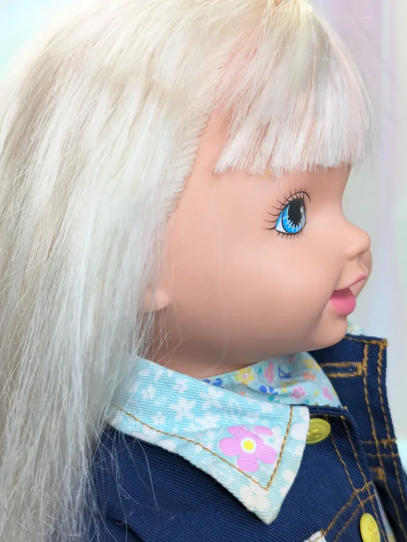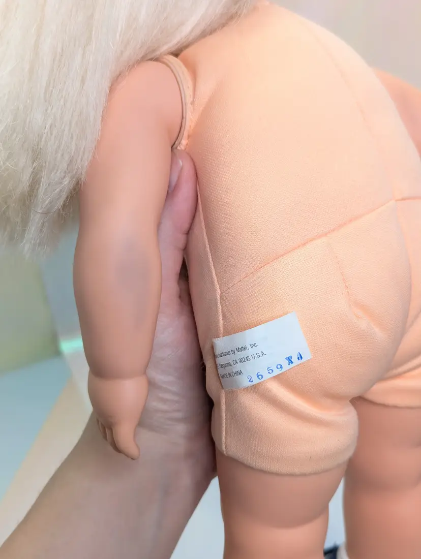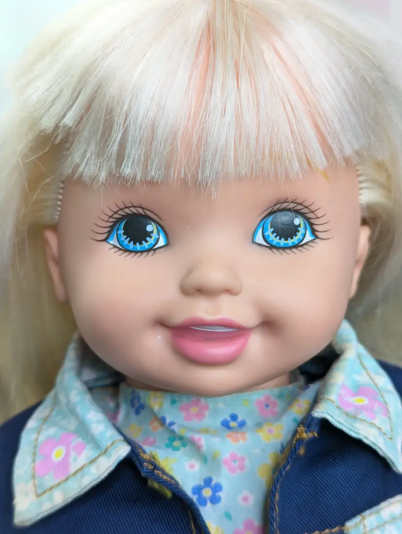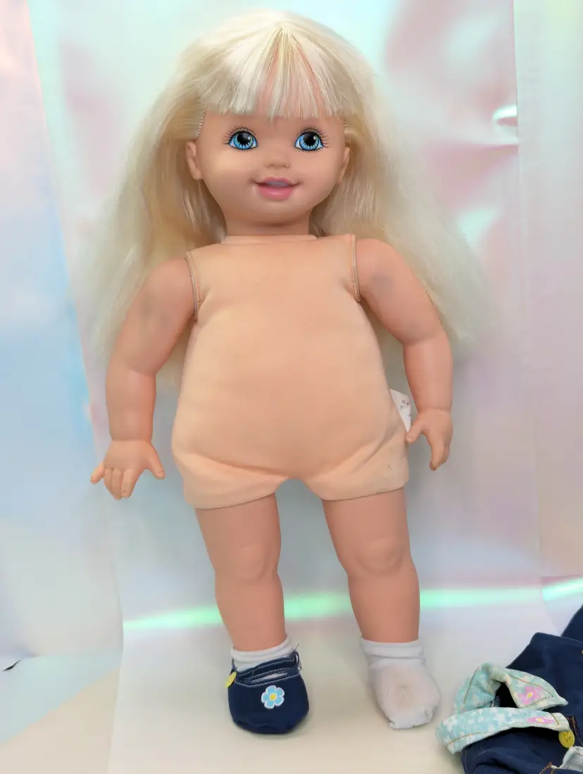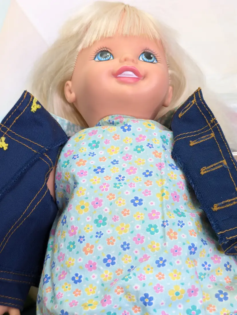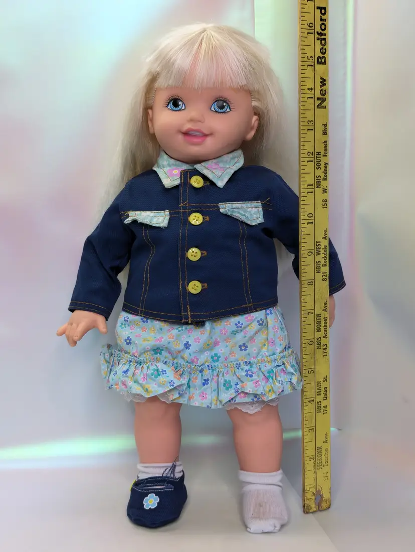 Cuddly Soft Kelly Doll Barbie’s Little Sister from 1994 made by Mattel. This is a 16" Tall doll with a soft plush body, and plastic arms, legs and head. Brushable hair. She comes in her original outfit but is missing the hat and one shoe. There are also a few stains, a few light ones on the pants and one on the sock. Her Dress and Jacket are nice and clean, no rips, tears, or holes. The dolls body has a satin on the top shoulder on one side, looks like a water mark from a spot clean. Her arms and body near the legs do have a blue stains - I am not sure if this is from the jacket and clothing or something else. She doesn't smell like mildew or mold to me, so I do not believe it is from that. Her clothing smells, lightly cleaned. Hair is nice and clean, un-cut in the the original length. Nice and soft! Over all this doll is in great shape! Comes from a smoke free, pet friendly home.