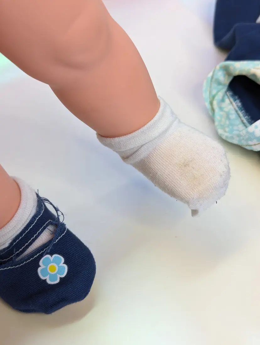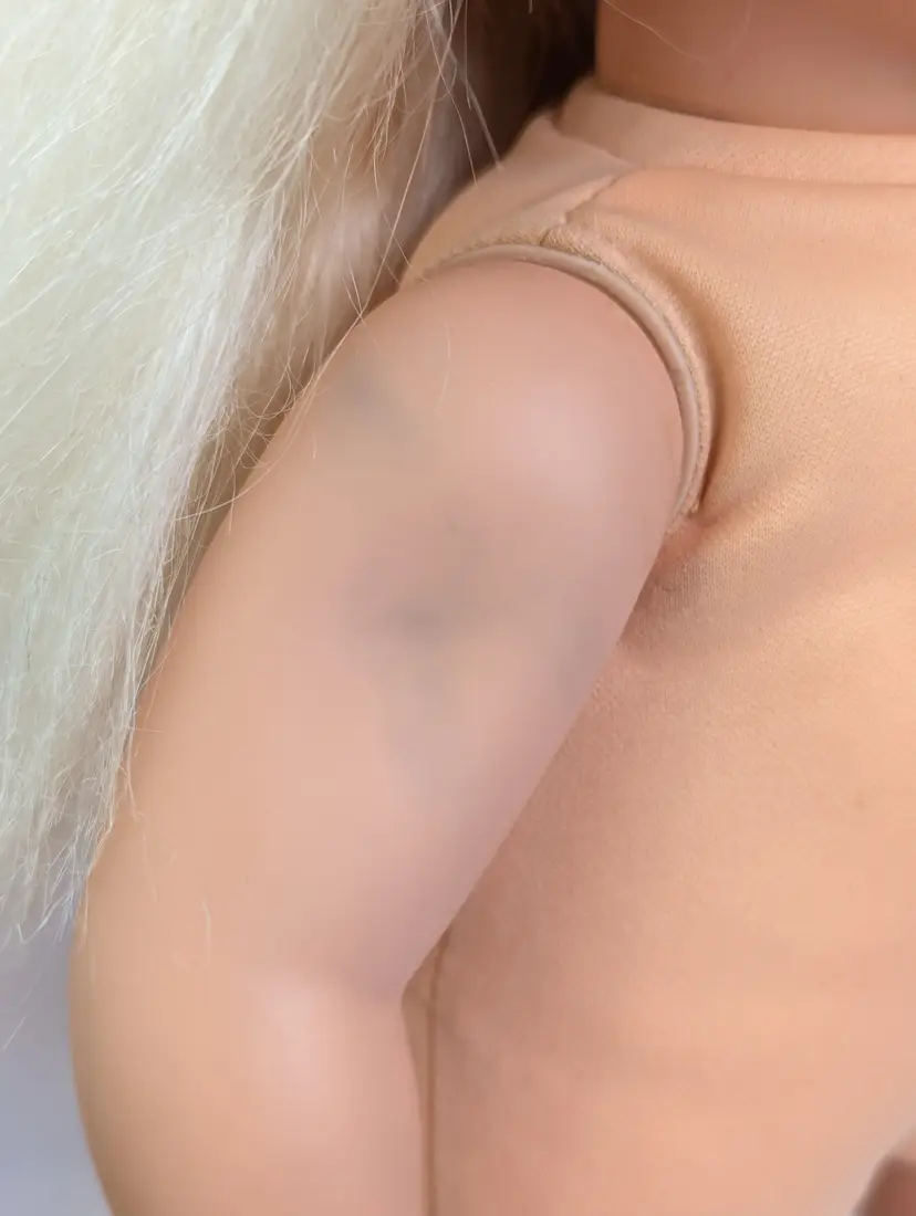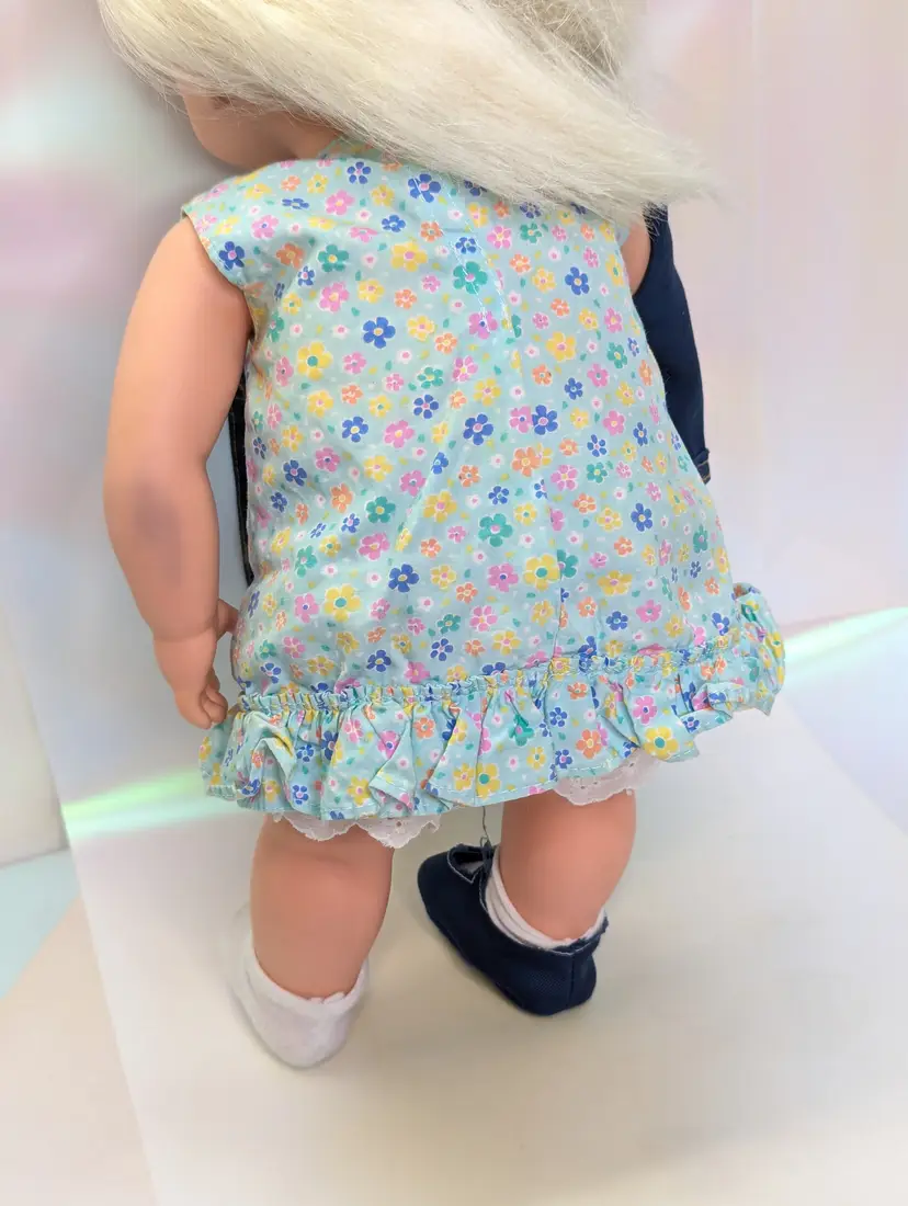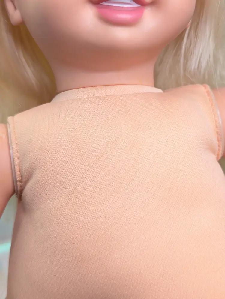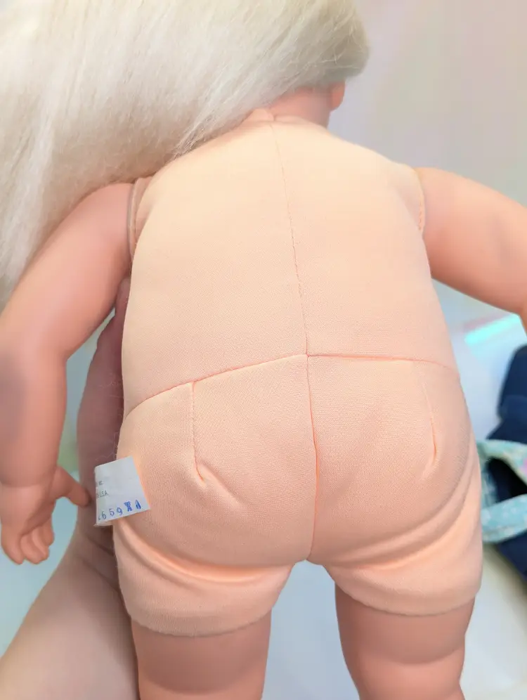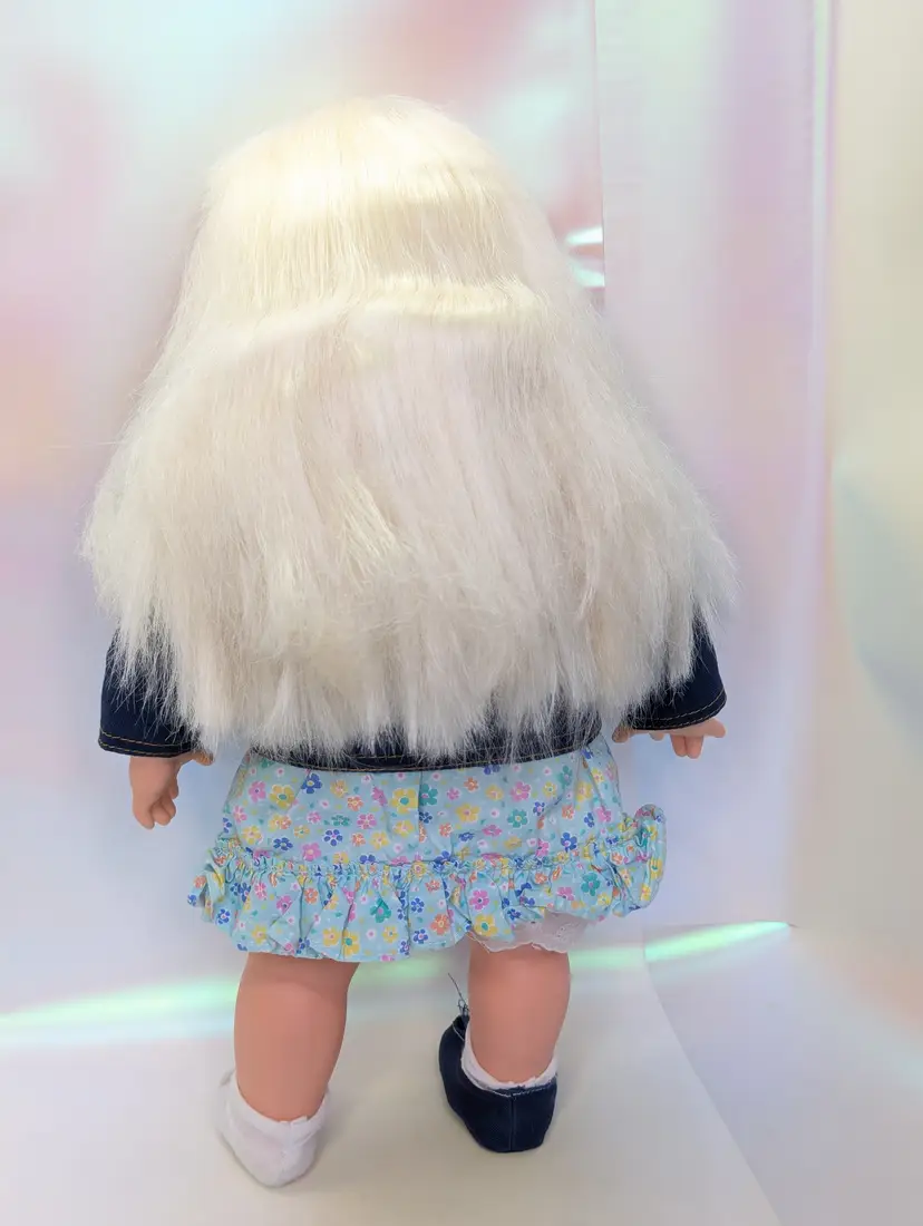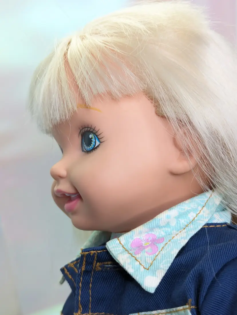 Cuddly Soft Kelly Doll Barbie’s Little Sister from 1994 made by Mattel. This is a 16" Tall doll with a soft plush body, and plastic arms, legs and head. Brushable hair. She comes in her original outfit but is missing the hat and one shoe. There are also a few stains, a few light ones on the pants and one on the sock. Her Dress and Jacket are nice and clean, no rips, tears, or holes. The dolls body has a satin on the top shoulder on one side, looks like a water mark from a spot clean. Her arms and body near the legs do have a blue stains - I am not sure if this is from the jacket and clothing or something else. She doesn't smell like mildew or mold to me, so I do not believe it is from that. Her clothing smells, lightly cleaned. Hair is nice and clean, un-cut in the the original length. Nice and soft! Over all this doll is in great shape! Comes from a smoke free, pet friendly home.