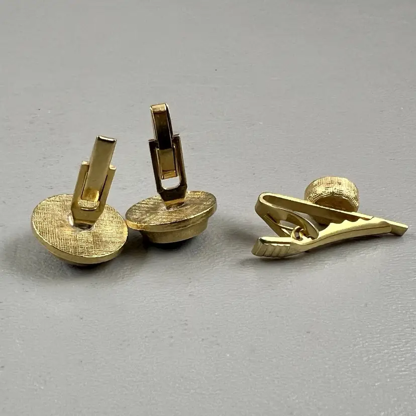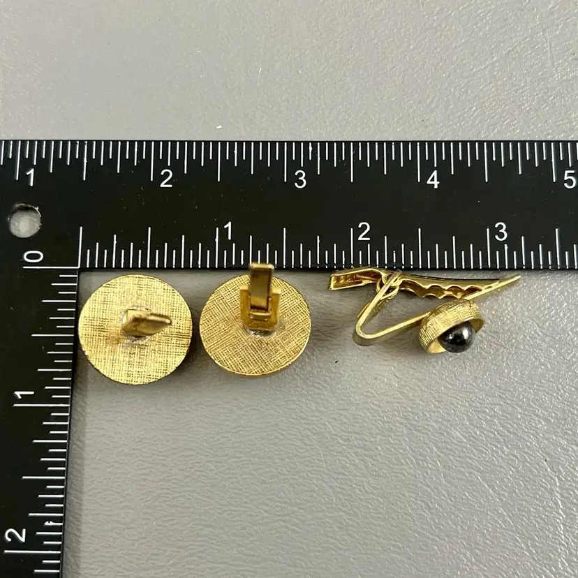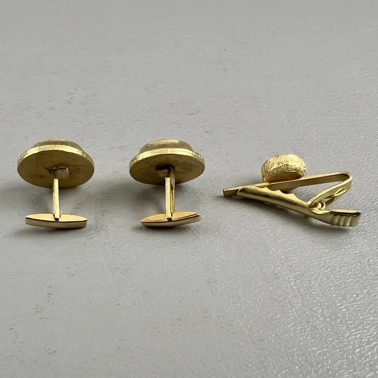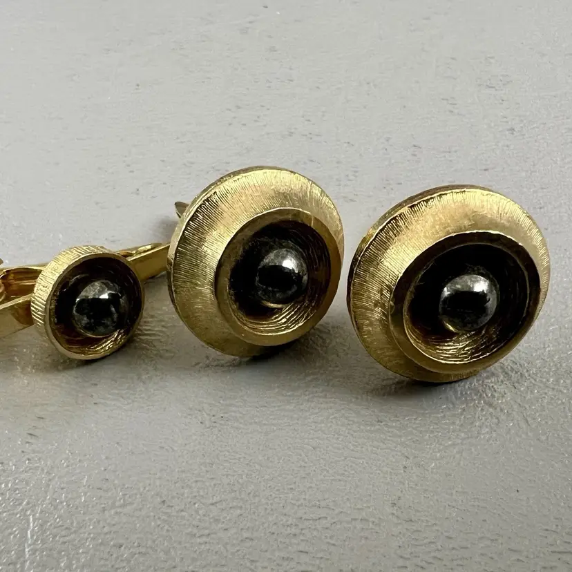 Vintage Cufflink Set Tie Clasp Mid-Century Gold Tone Round Faux Black Pearl