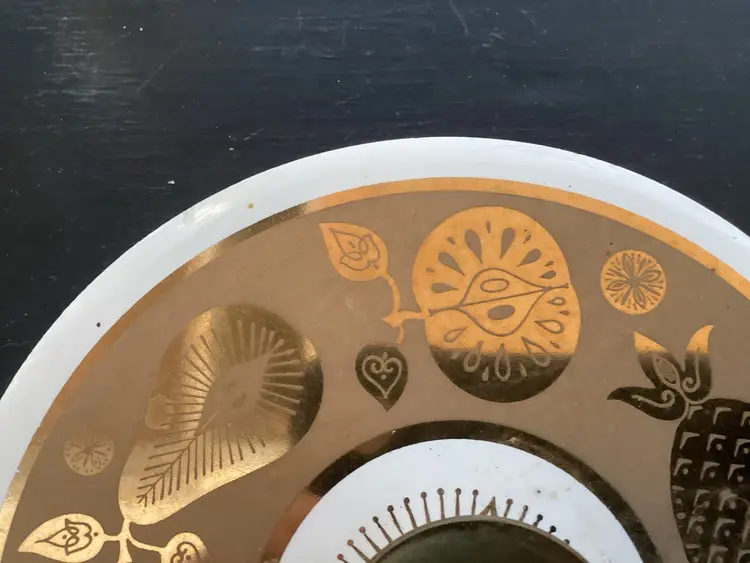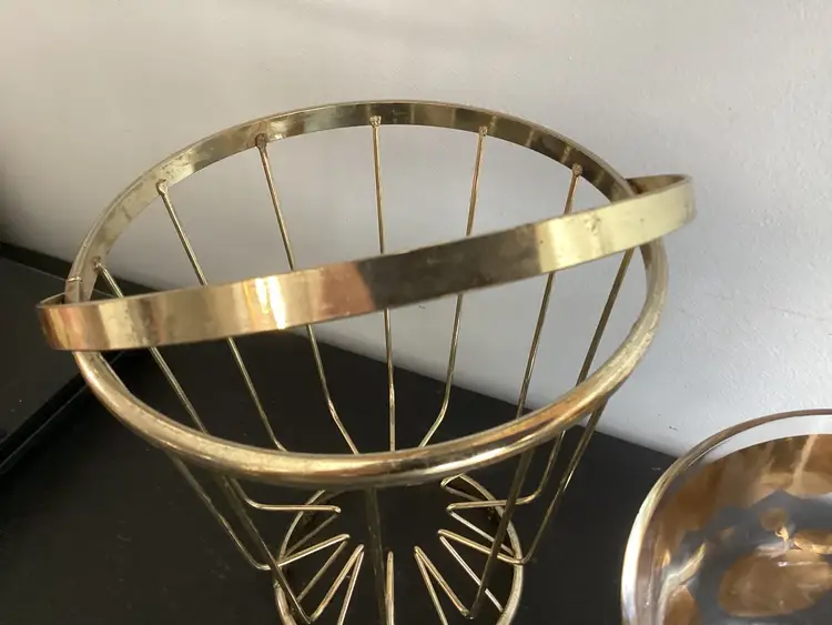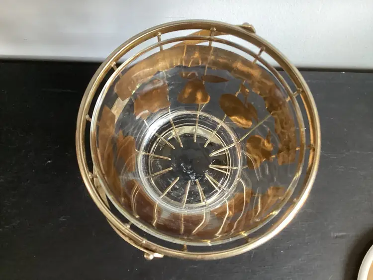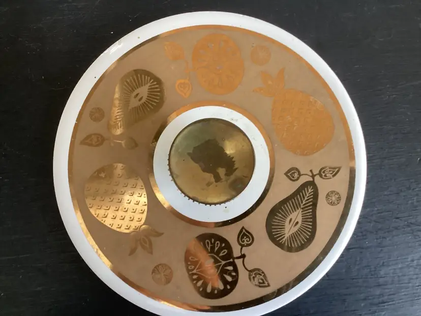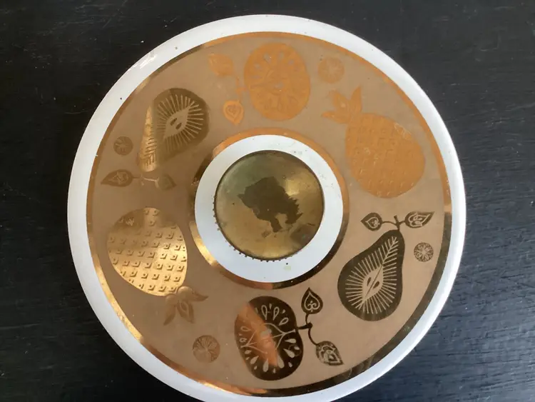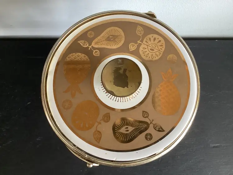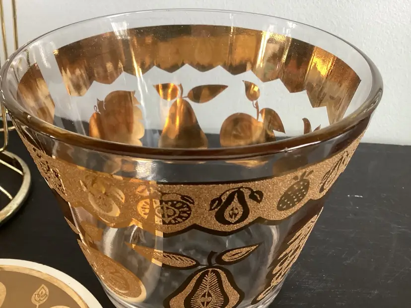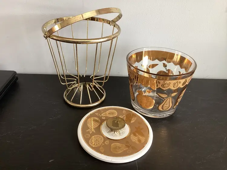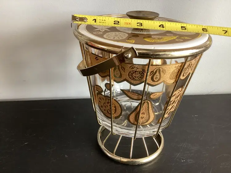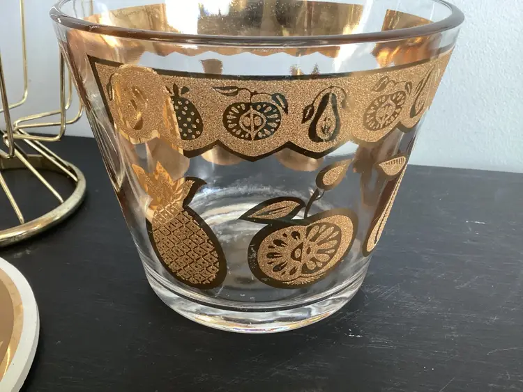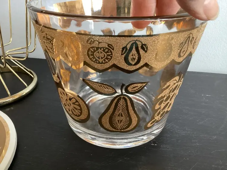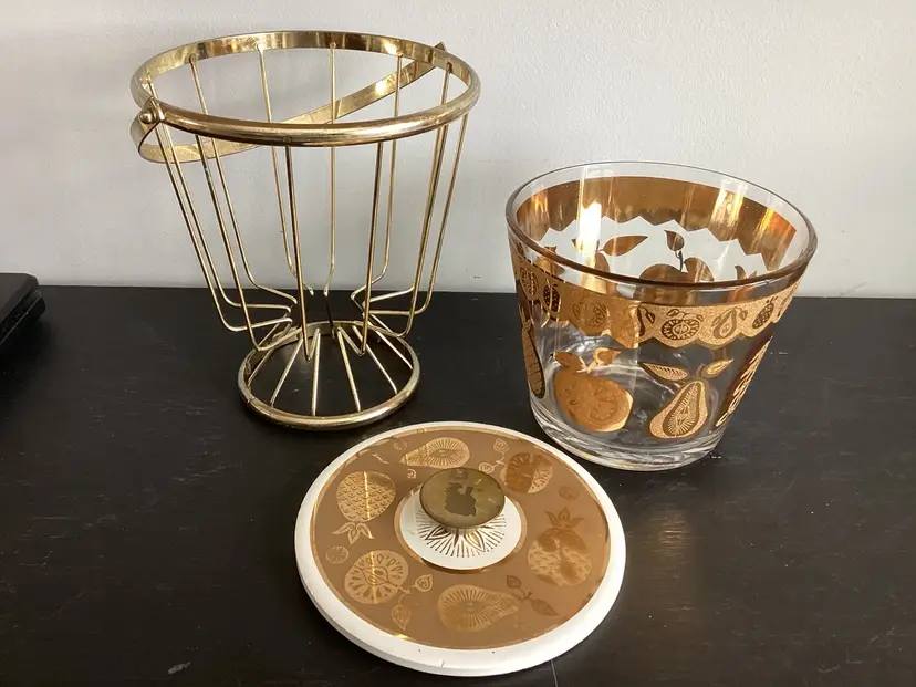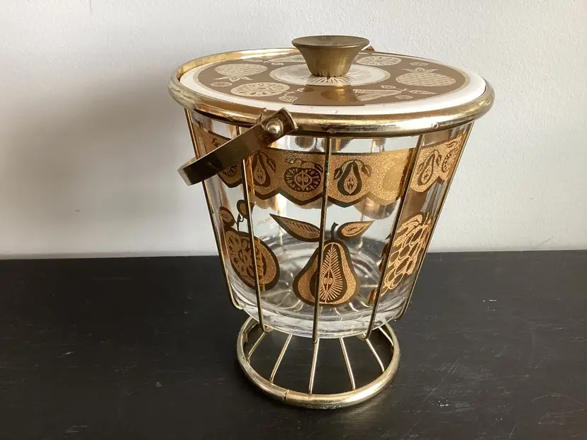 This vintage Culver, signed, ice bucket is the Florentine pineapple and fruit pattern. Graphics are in very good condition. Metal shows oxidation and wear in some areas. The lid fits the metal basket, not on top of the actual bucket. There are several tiny chips on the lid and one tiny chip on the bucket. These are shown in the pictures.