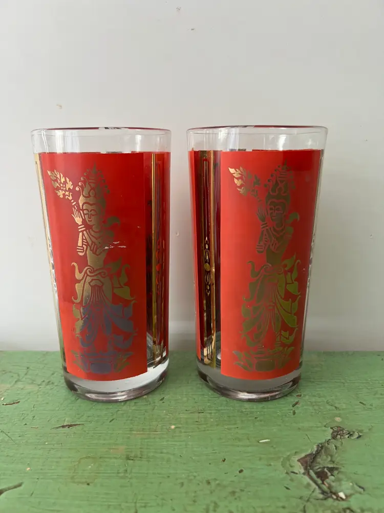 Vintage Culver Mandalay Siamese Burmese Thai Goddess Dancer Highball Glasses These glasses are red or orange (depending on your eyes) with gold detailing