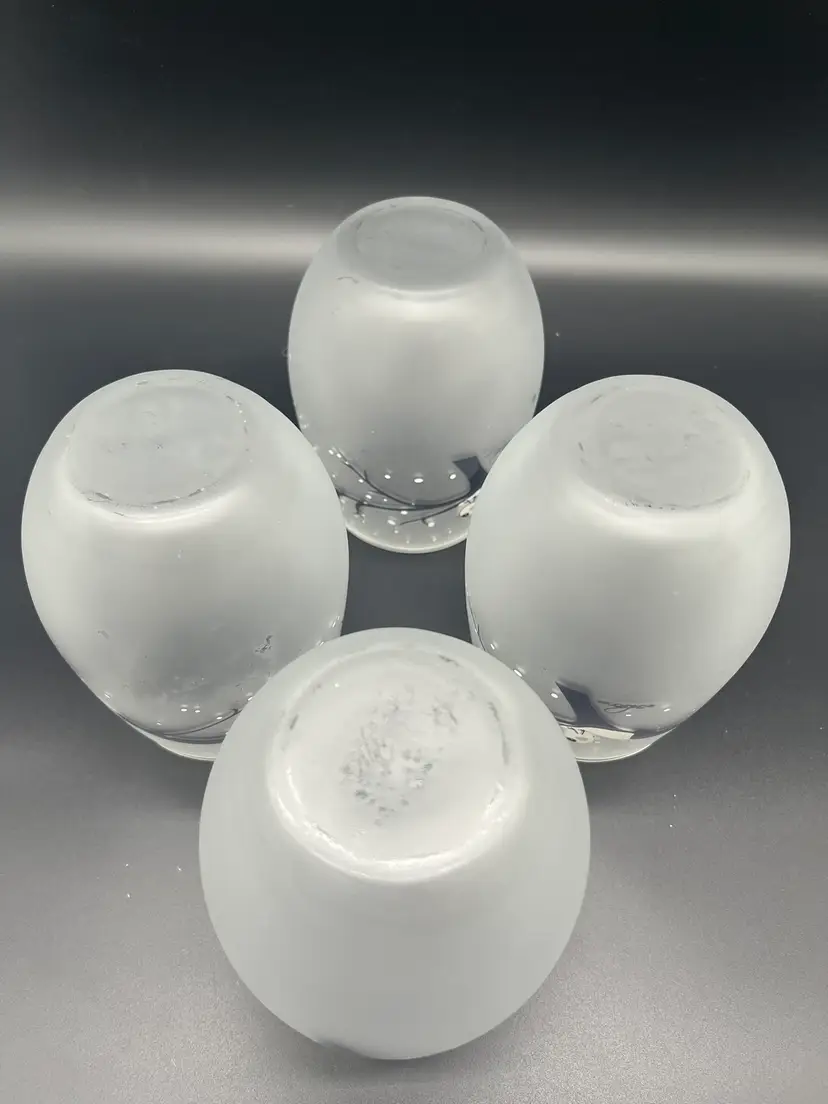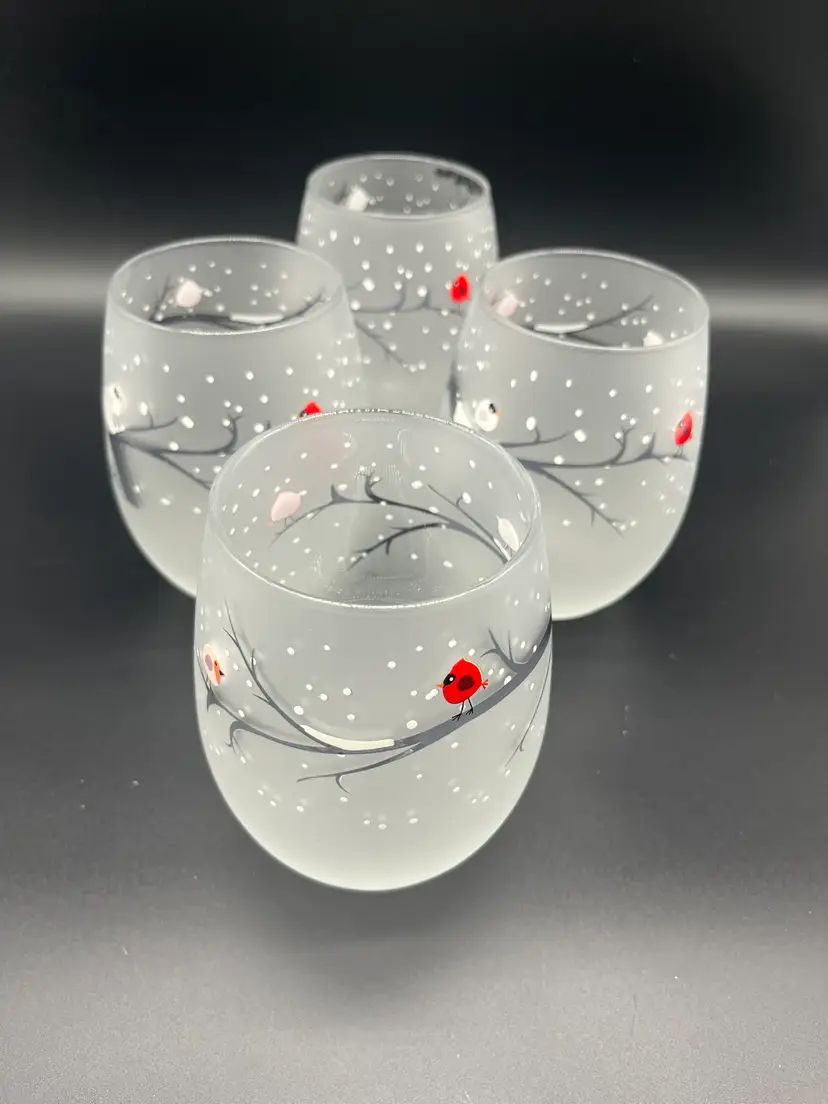 Large frosted roly poly glasses featuring tree branches with cardinals and birds. Versatile size to hold anything from beer to wine to cocktails. Frosted outside with snow falling sets a winterlike theme. Collector's item, unusual to find set of 4. Each glass is signed Culver, perfect for winter and holiday entertaining. Includes shipping. Each glass measures approximately 5" tall and 3" wide at mouth. One glass has minor wear in frosting on bottom and at lip. Otherwise, good condition, no chips or cracks.