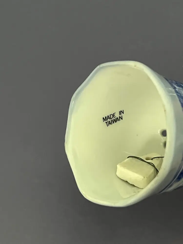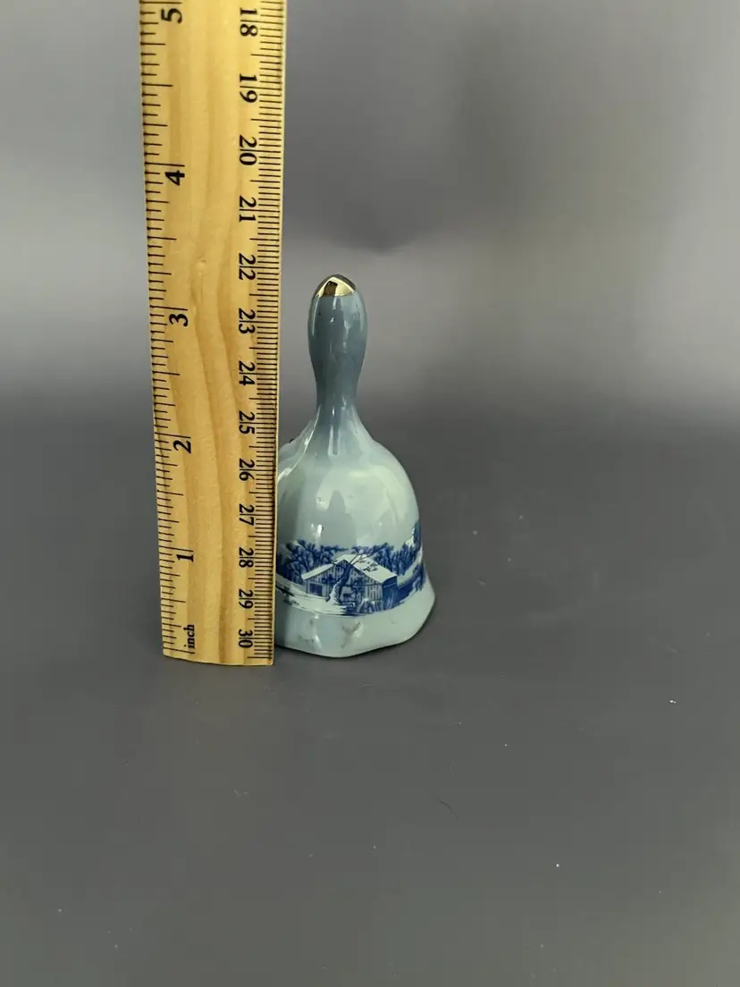 This vintage Currier and Ives bell is a beautiful addition to any collection. The porcelain bell features a lovely blue color and is adorned with the popular "The Old Homestead in Winter" pattern. The bell is part of the Copenhagen Bell Series and was manufactured in Taiwan in 1977.