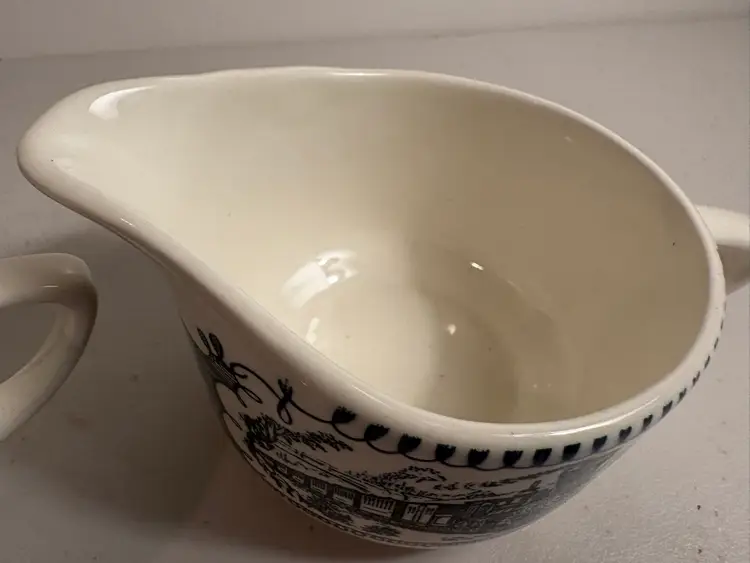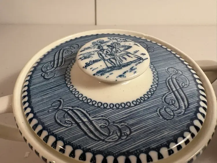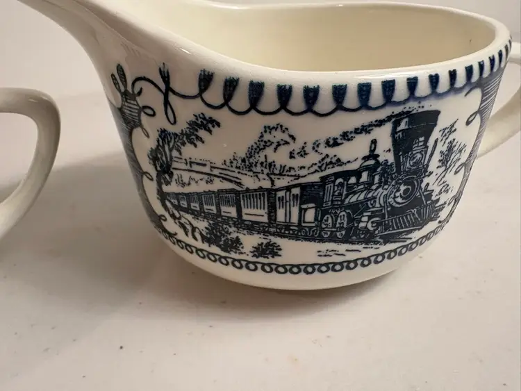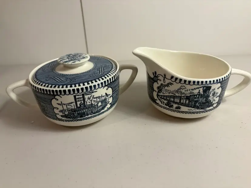 The Vintage Currier and Ives Creamer Sugar Bowl with Lid, model C214, is a charming collectible piece for any kitchen or dining room. Featuring a classic steamboat and locomotive design in multicolor ceramic, this creamer sugar bowl adds a touch of nostalgia to your table setting. The set includes a lid for the bowl, making it both functional and decorative for serving cream and sugar in style.