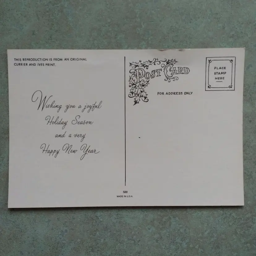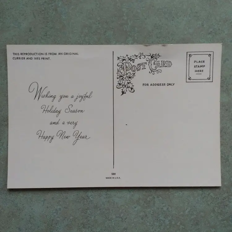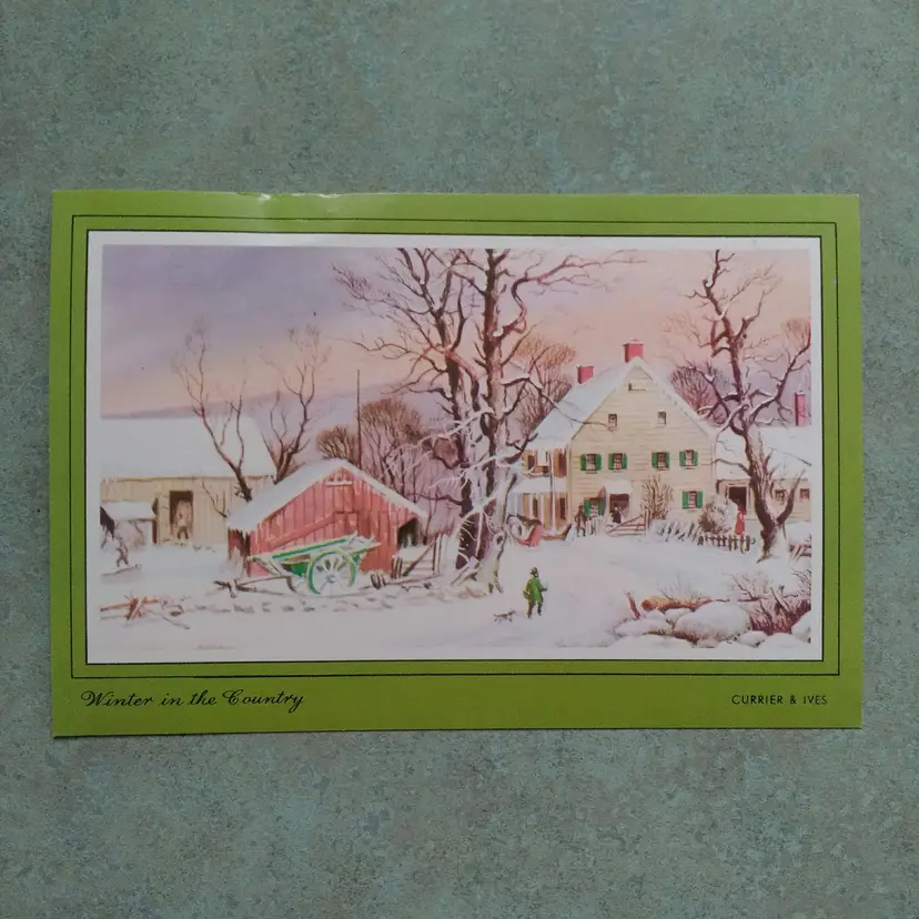 Celebrate the holiday season with this charming Vintage Currier & Ives Winter in the Country Christmas Postcard. Measuring 3.5 x 5.5 inches, this antique postcard features a classic winter scene in multicolor hues. Perfect for collectors or as a unique holiday greeting, this vintage postcard captures the nostalgic charm of a country Christmas. Please see photos - some storage damage.