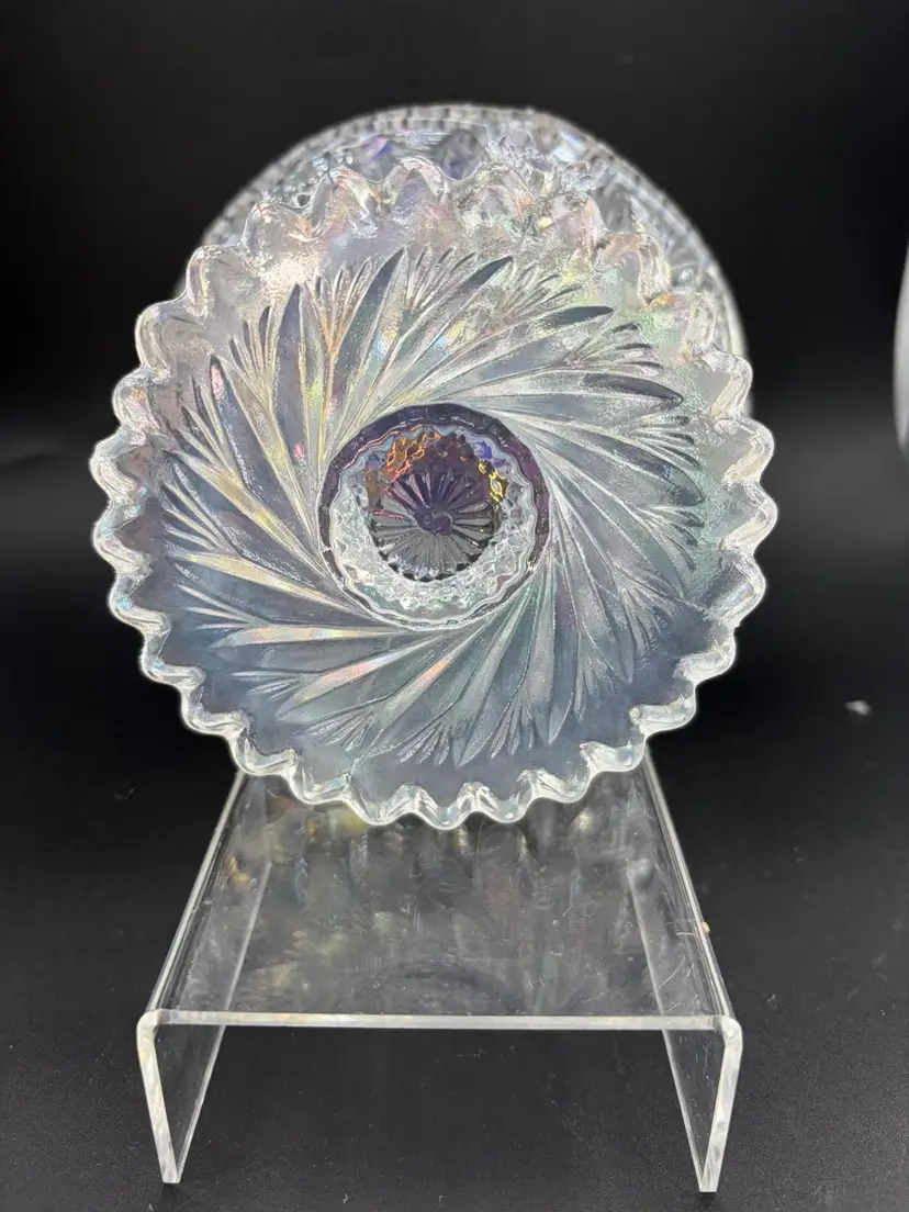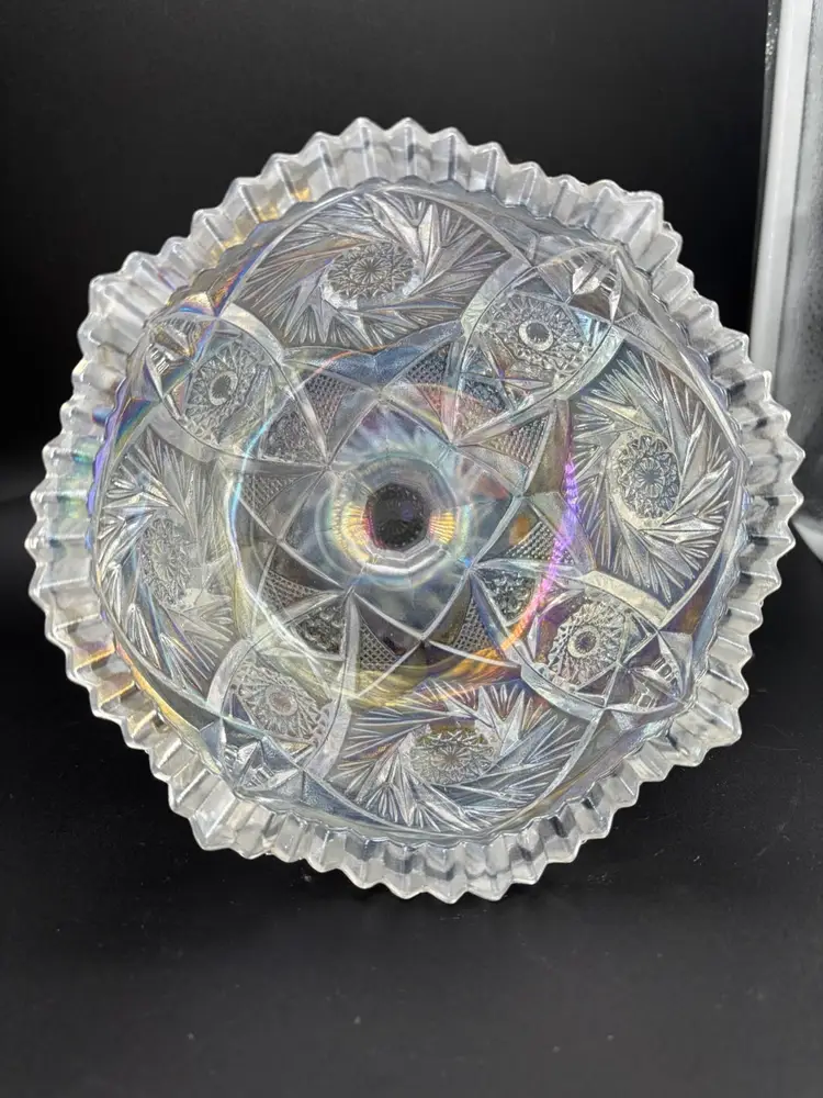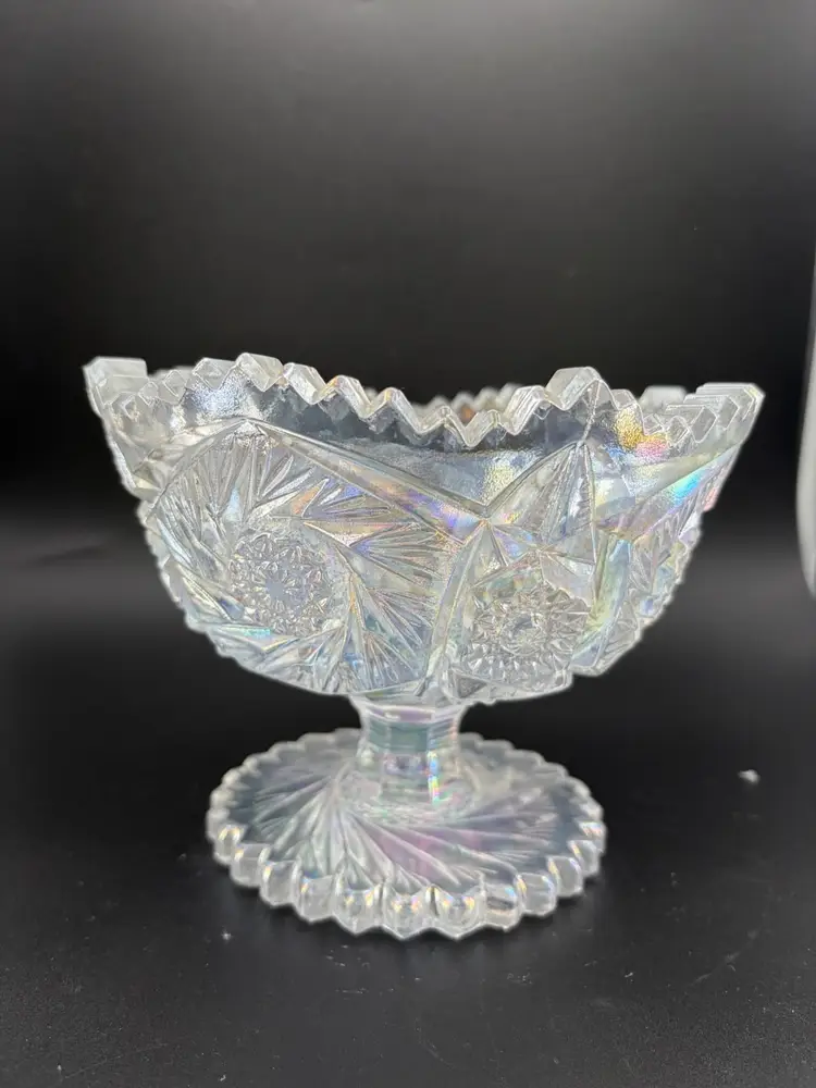 This is a vingntage cut glass candy dish. The dish is in excellent condition. No chips or cracks. It has a tornado pinwheel pattern with a sawtooth rim. It stands 4 3/4 inches tall and 6 1/2 inches across the top.