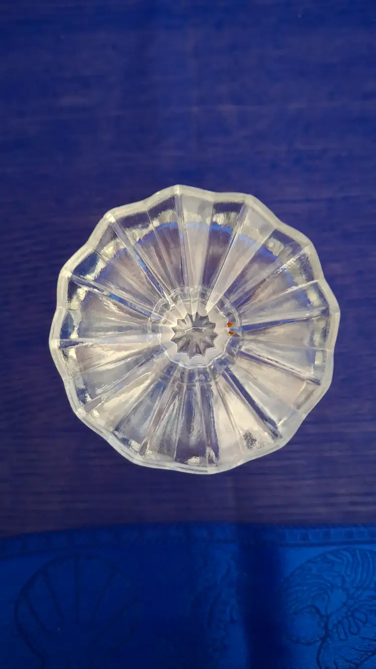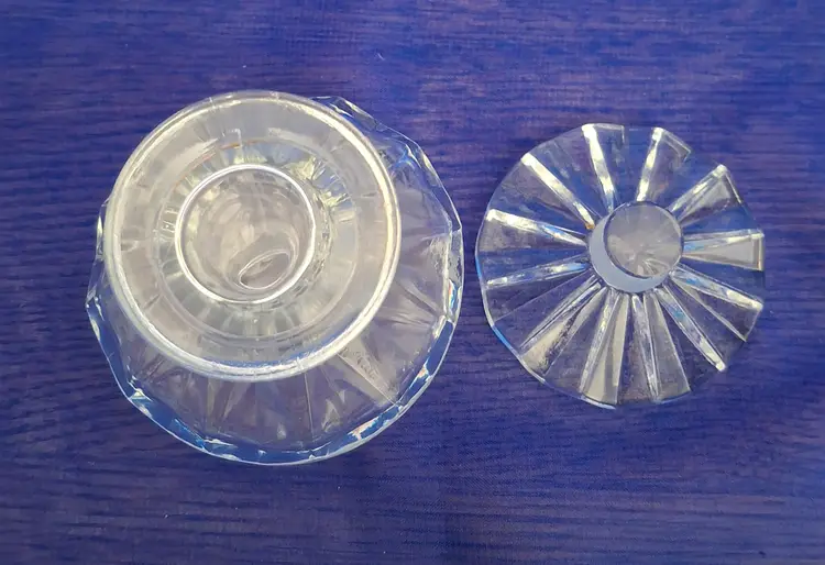 Vintage Cut-Glass Perfume Bottle with Petal Stopper – 1950s Vanity Decor This charming vintage perfume bottle features a sparkling glass body with deep faceted panels and a matching star-petal stopper. The clear glass catches the light beautifully, making it perfect for a feminine vanity display, guest bath, or perfume bottle collection. Details: • Measures approx. 3” tall x 3” wide • Clear pressed glass with faceted sides • Petal-shaped stopper with frosted neck • No chips, cracks, or cloudiness • Perfect for cottagecore, shabby chic, and feminine vanity décor A lovely petite vanity piece with classic mid-century charm.
