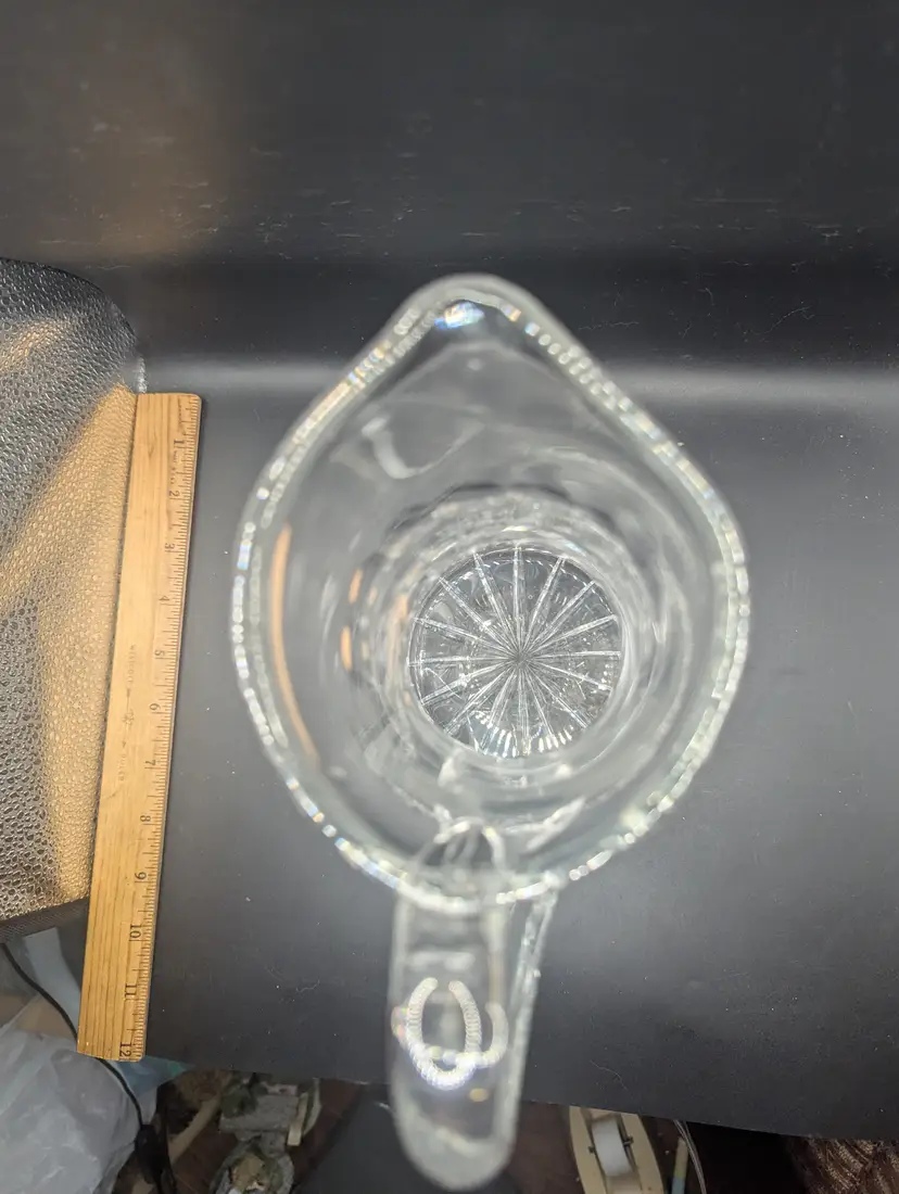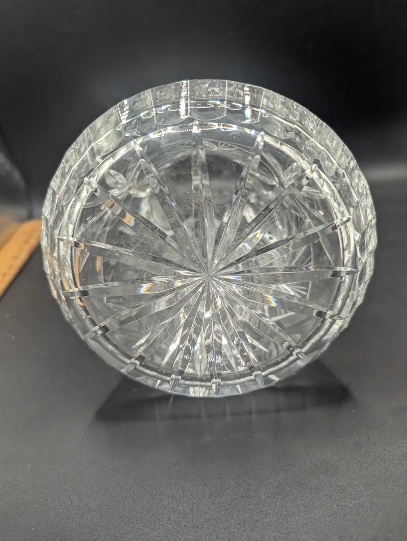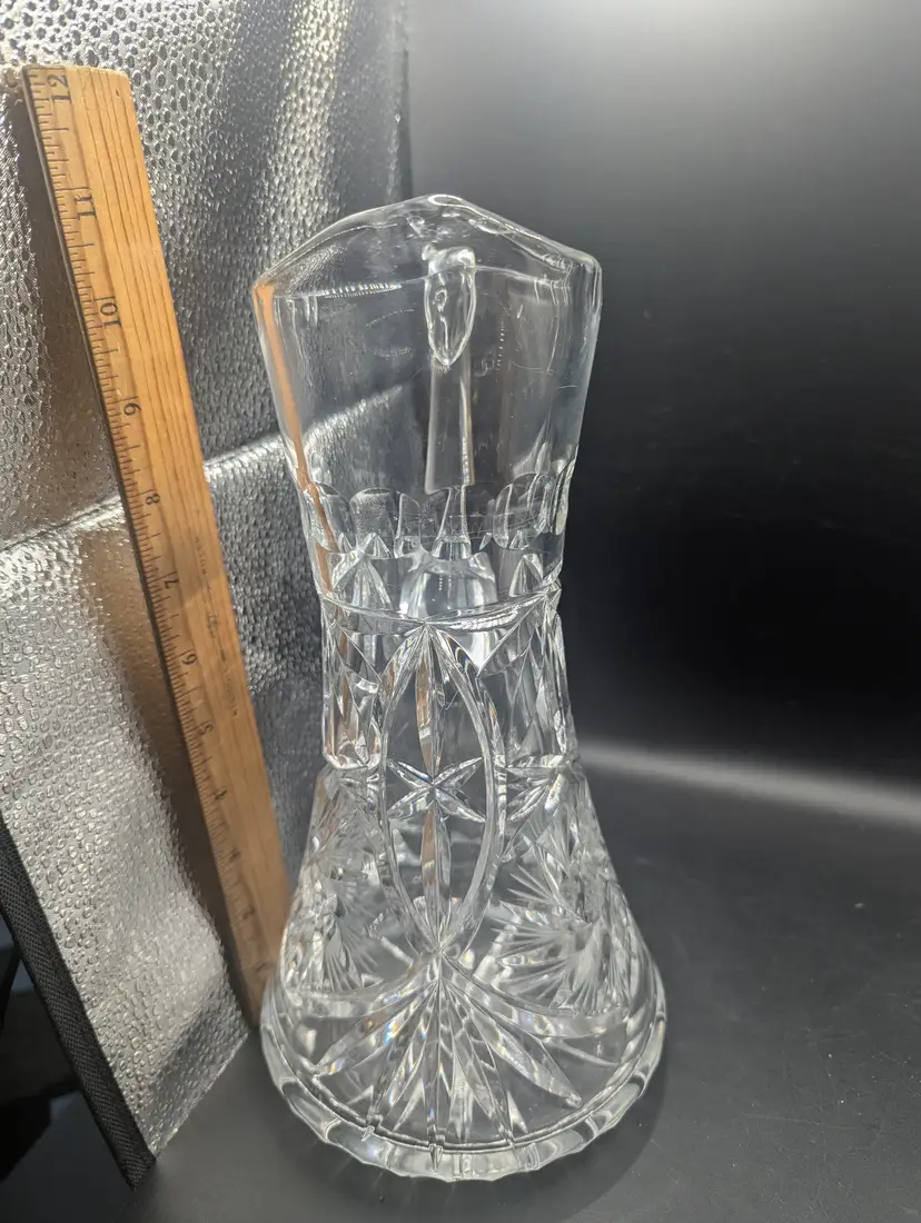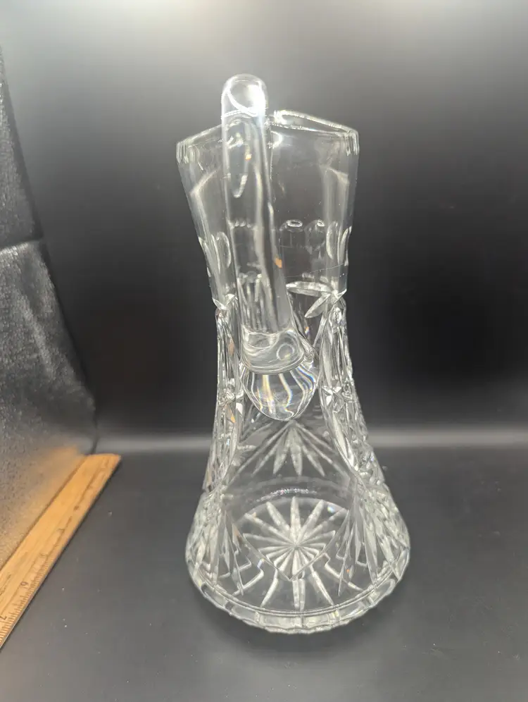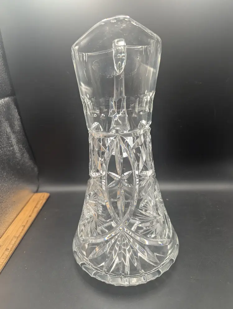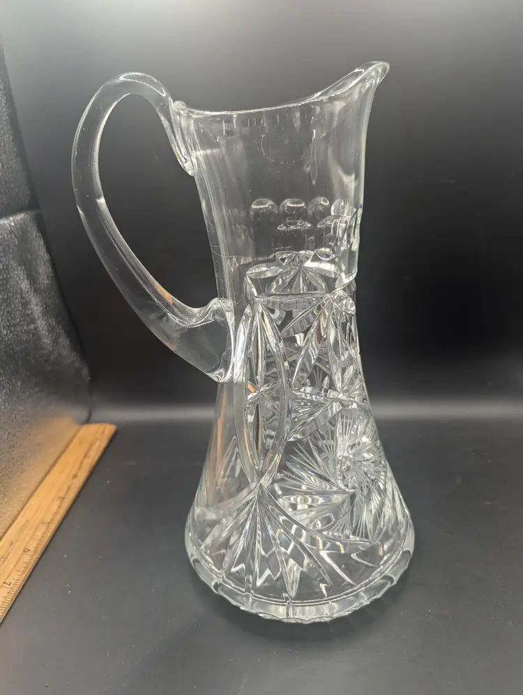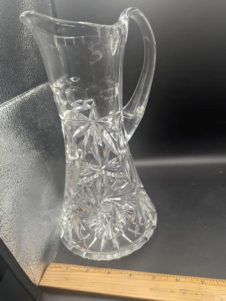 This is a lovely Vintage American Brilliant Style Cut Glass Pitcher. It is very heavy and has a pinwheel and star pattern but maker is unknown. It measures 5 inches in diameter and stands 10.5 inches tall. No chips or cracks. Please see all pictures for condition and measurements.