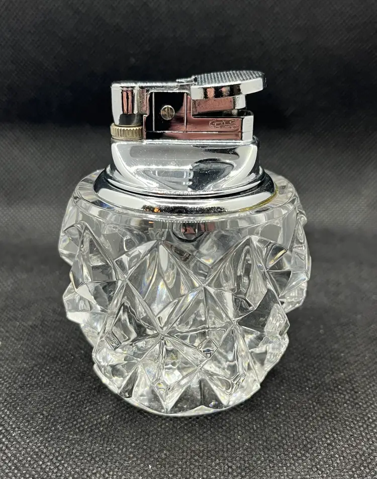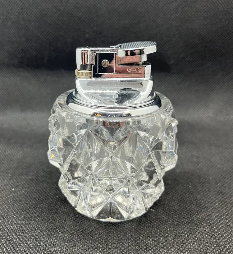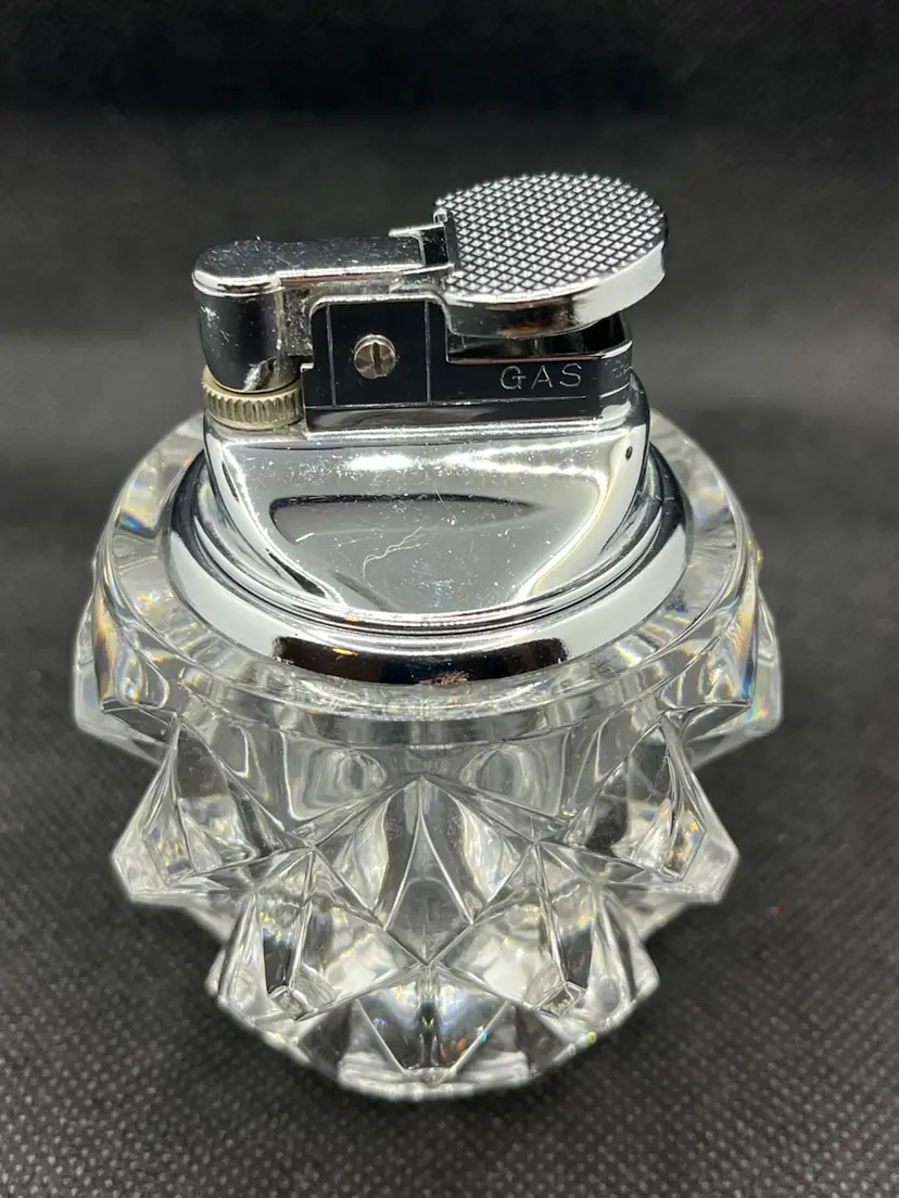 Function: It is a refillable butane or gas lighter designed for use on a desk or table, typically for lighting cigarettes or cigars.