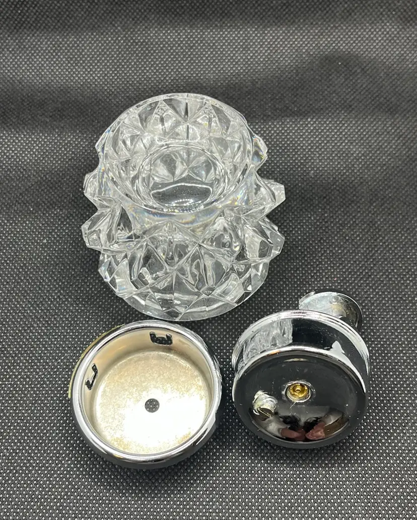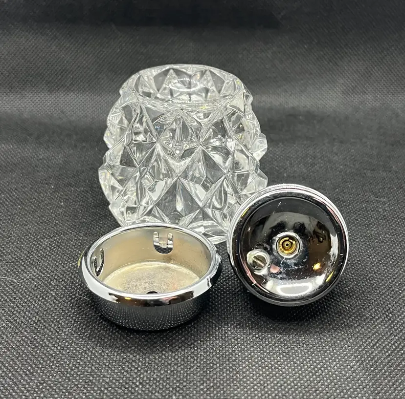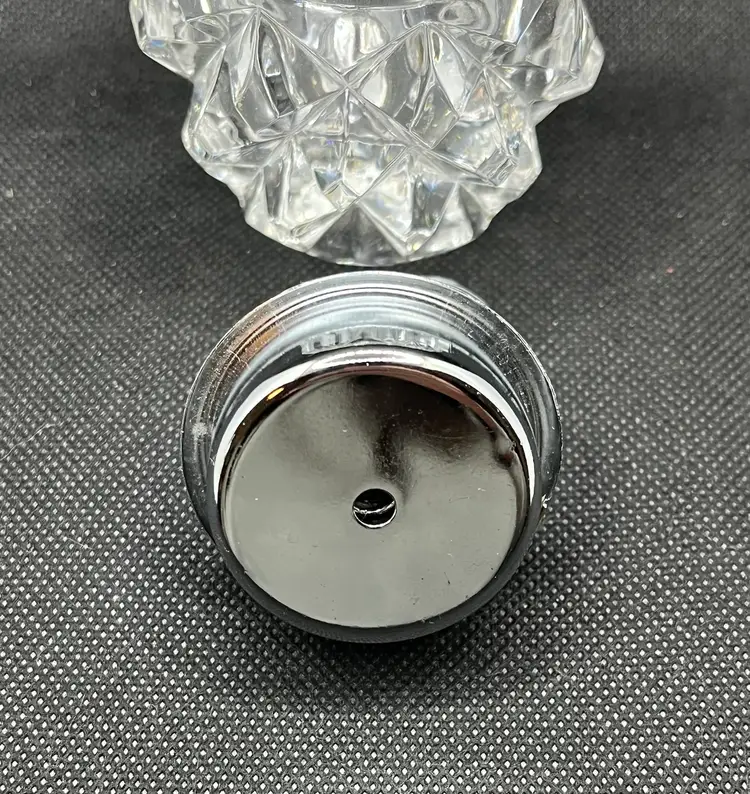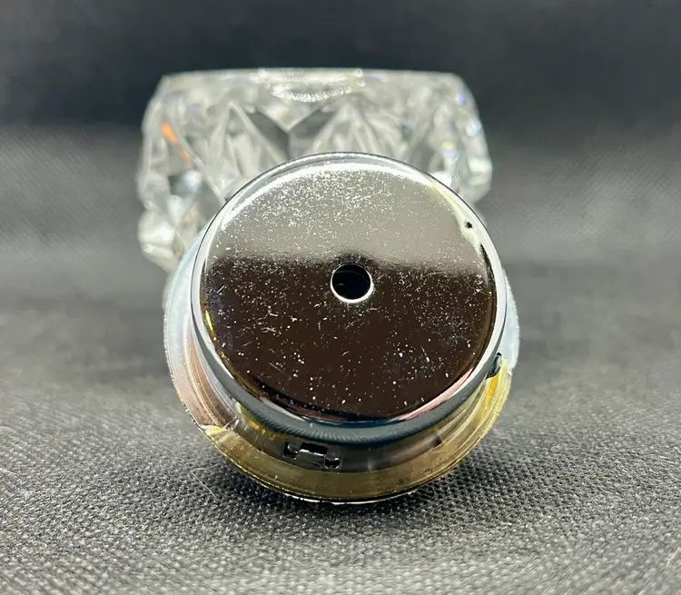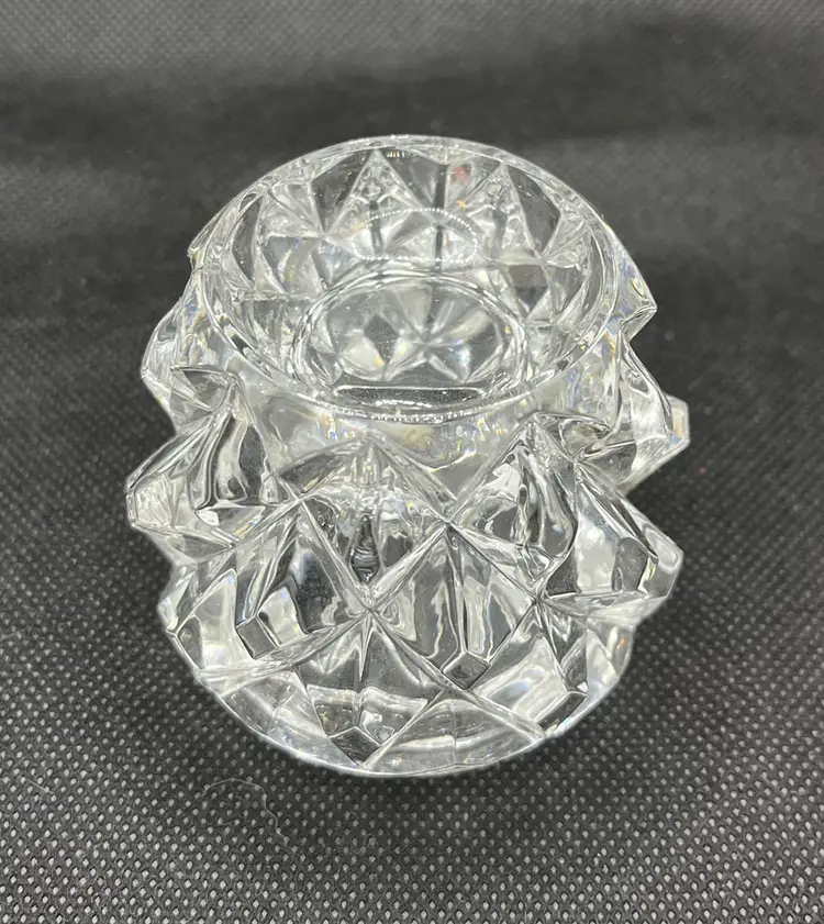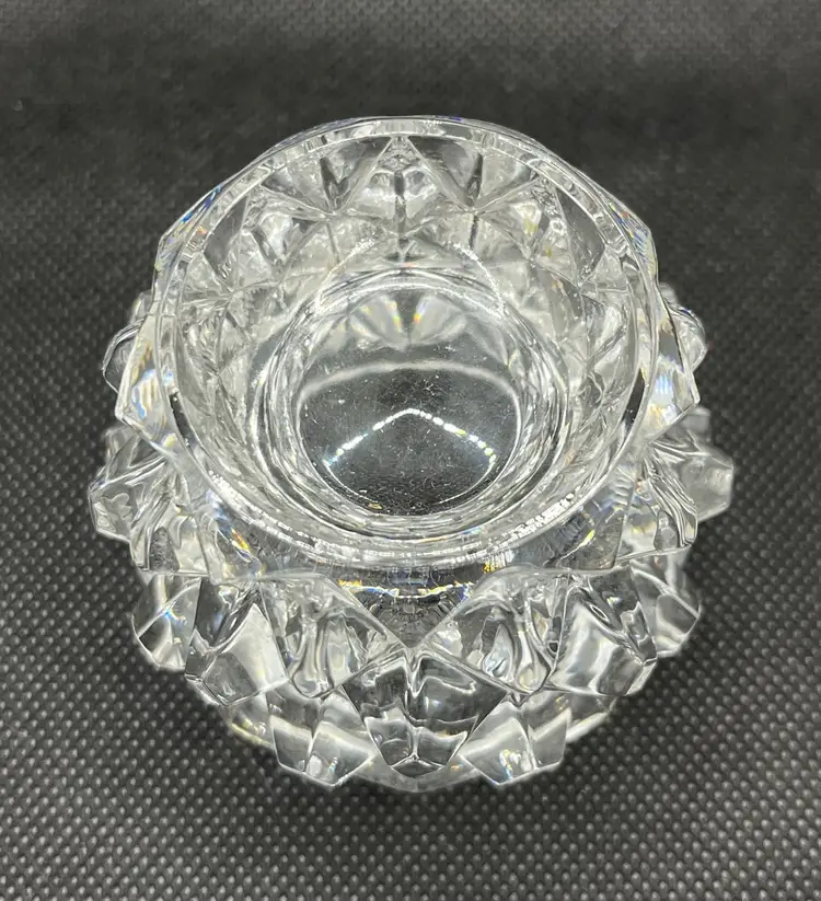 Material: The base is made of cut lead crystal with a faceted, diamond-pattern design.