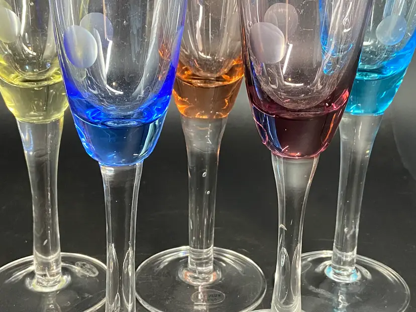 Elevate your toasting experience with these vintage cut polka dot champagne flute glasses. Unmarked yet undeniably charming, their colorful pattern adds a playful touch to your celebratory bubbles. Each glass stands at 9.25 inches tall, the perfect height for a elegant drink presentation, and has an item diameter of 2 inches, ideal for those fizzy delights. Crafted from glass and weighing in at a comfortable 4.8 ounces, these flutes blend functionality with vintage flair. Whether you're hosting a brunch or a cozy evening soiree, these multicolored glasses will make serving your bubbly a festively fashionable affair.