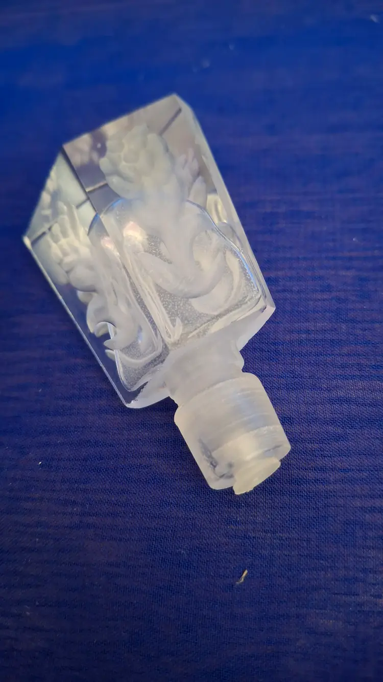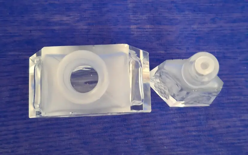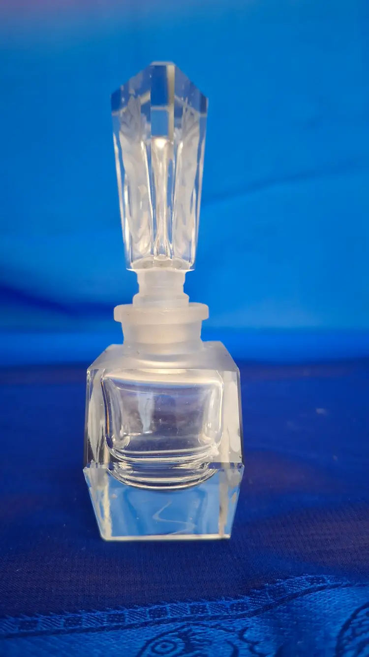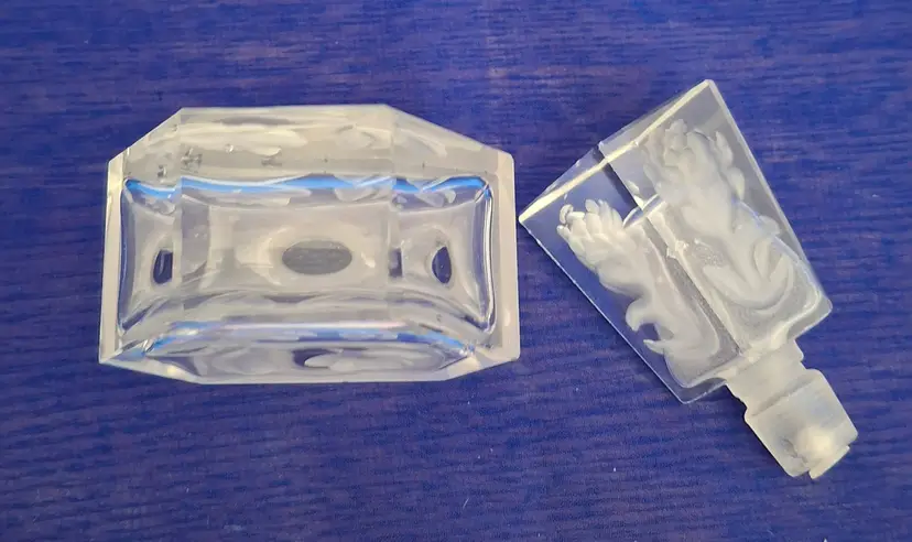 Vintage Czech Crystal Perfume Bottle – Frosted Floral Etched Design – Hexagonal Base – 1930s–1950s Bring a touch of elegance to your vanity with this beautiful vintage Czech crystal perfume bottle. It features deeply etched frosted floral panels, a clear beveled body, and a sculpted stopper with its original hollow plug intact. The hollow plugged stopper is typical of Czech decorative bottles that originally held perfume concentrates or were sold as vanity pieces in export gift sets. The combination of satin-frosted glass and crystal clarity gives it a classic Art Deco–inspired look. This bottle measures approximately 4¼ inches tall and 2½ inches wide, making it perfect for display on a mirrored tray, dressing table, or in a perfume bottle collection. The stopper fits smoothly, and the piece displays beautifully. A lovely gift for collectors of vanity décor, perfume bottles, or Czech crystal glass.